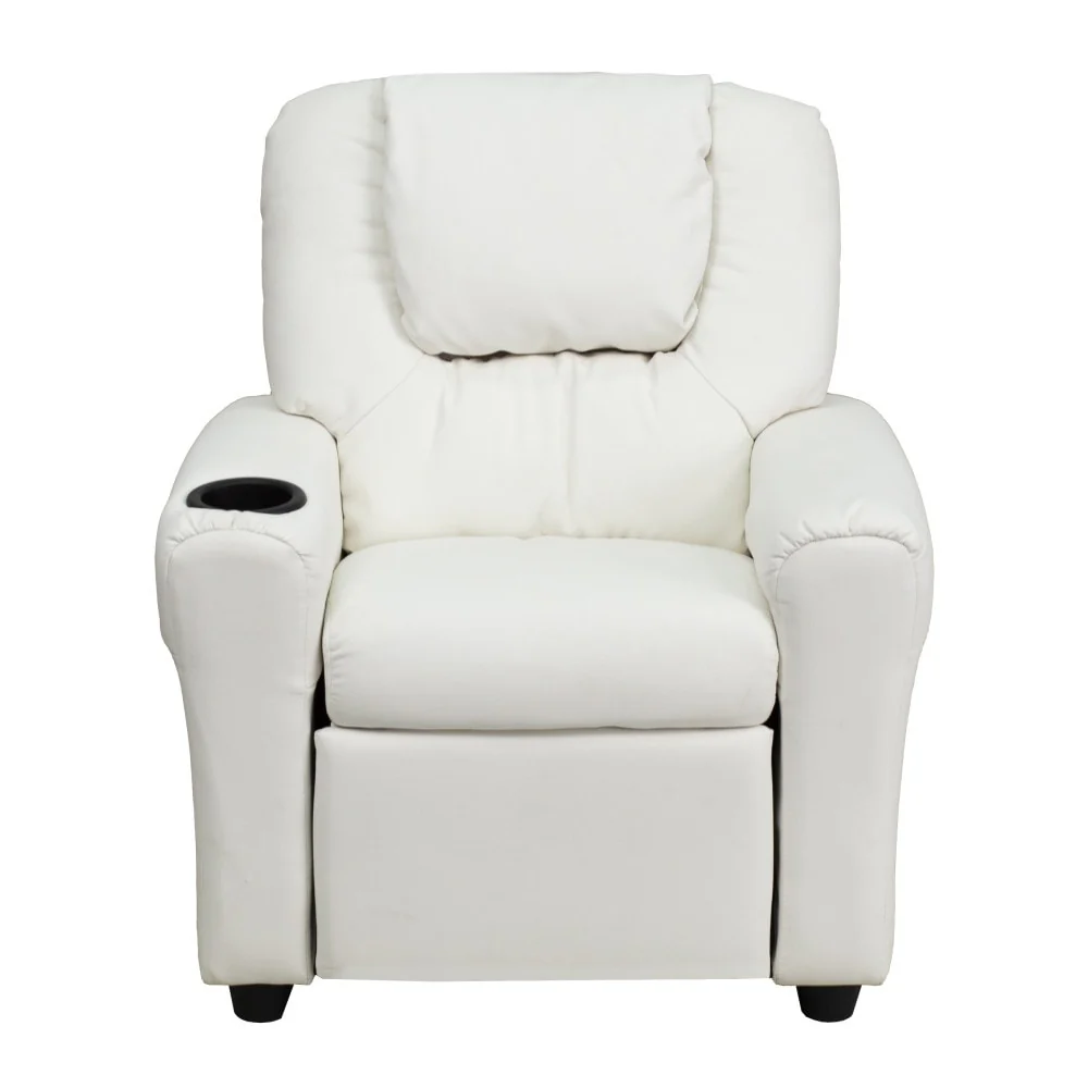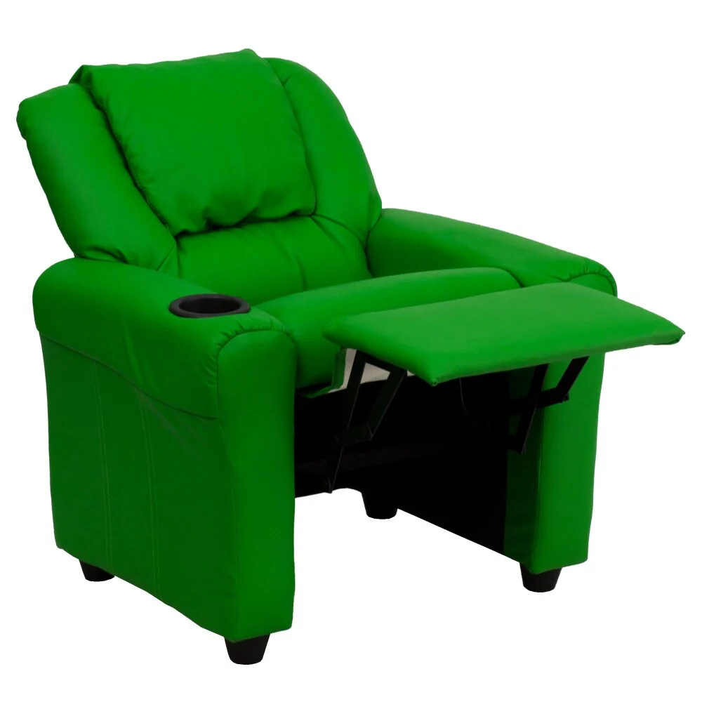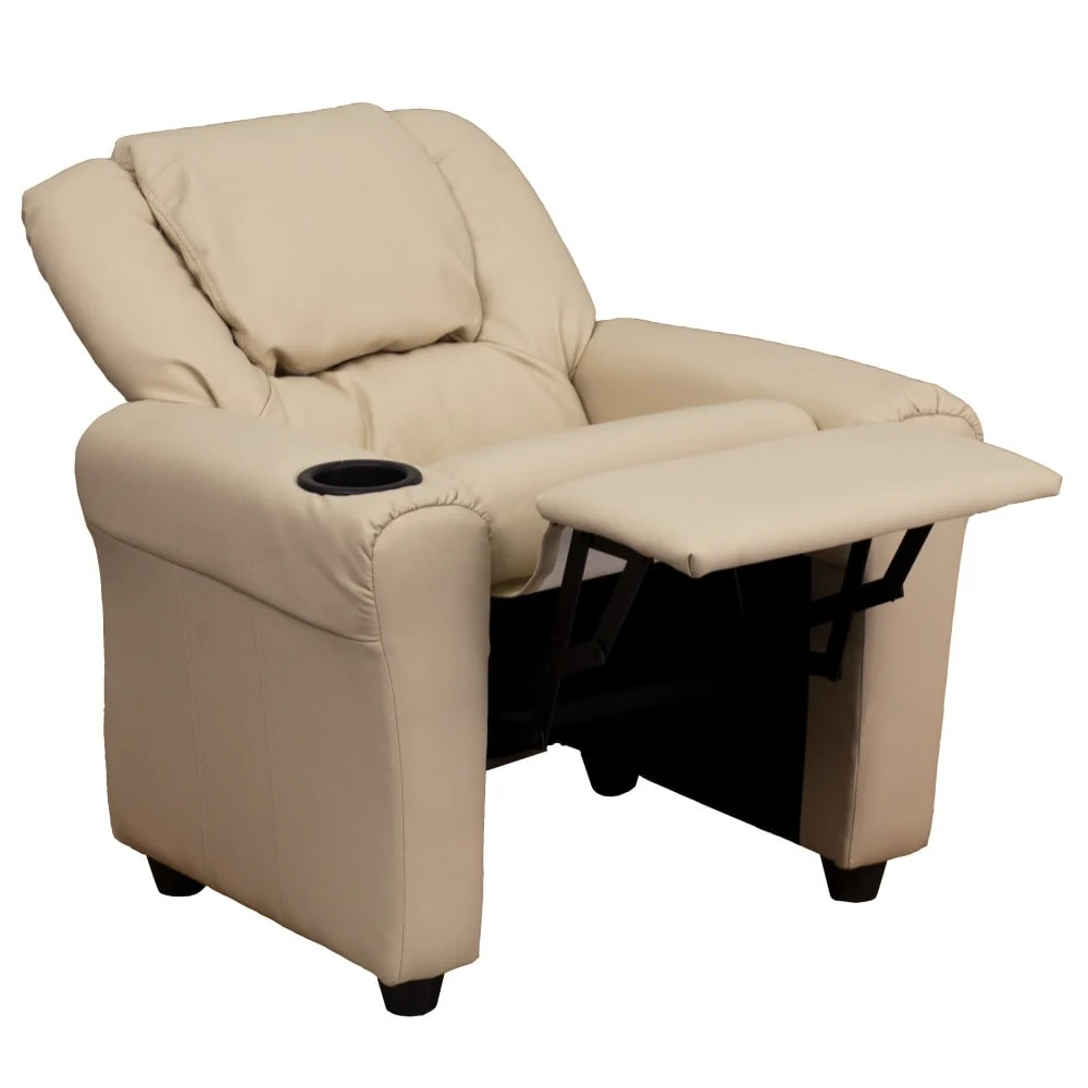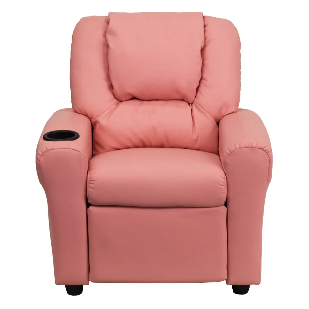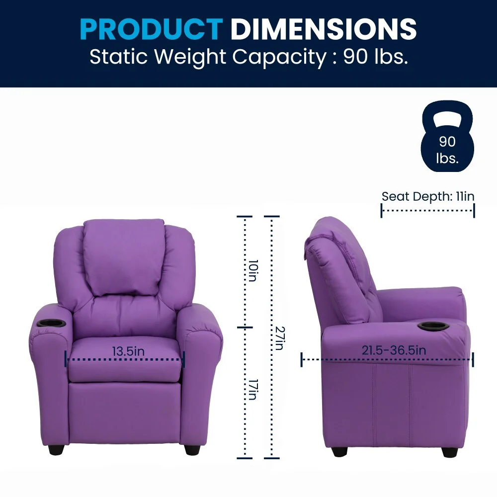 Get your kids their own comfy seating with this Contemporary Kids Recliner with Cup Holder and Headrest. Perfectly sized for young ones, this push back recliner is ideal for their living room, bedroom or playroom. Your little ones can sit comfortably on the plush back and seat upholstered with fire retardant foam, while also having their favorite beverage at arm's reach with the built-in cup holder. Cleanup is easy with the durable vinyl upholstery. With a solid hardwood frame construction, this chair can hold up to 90 pounds and includes a safety feature ensuring that the recliner will not function unless the child is in a seated position. This child-sized recliner is a great addition to your home and comes in multiple colors to fit any decor.