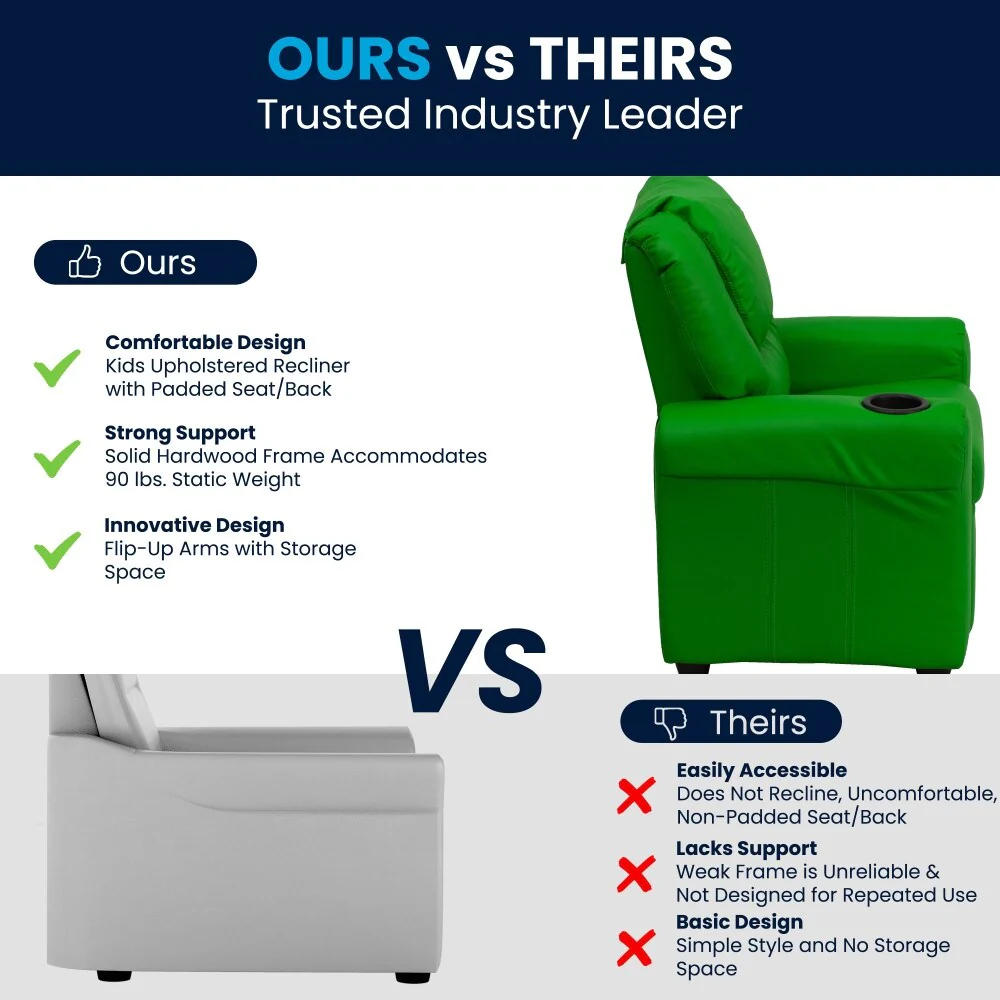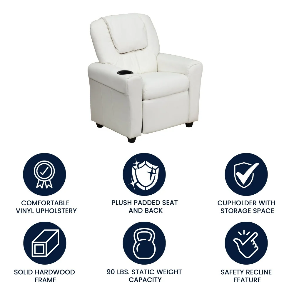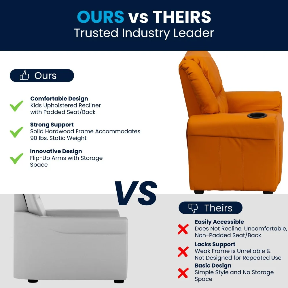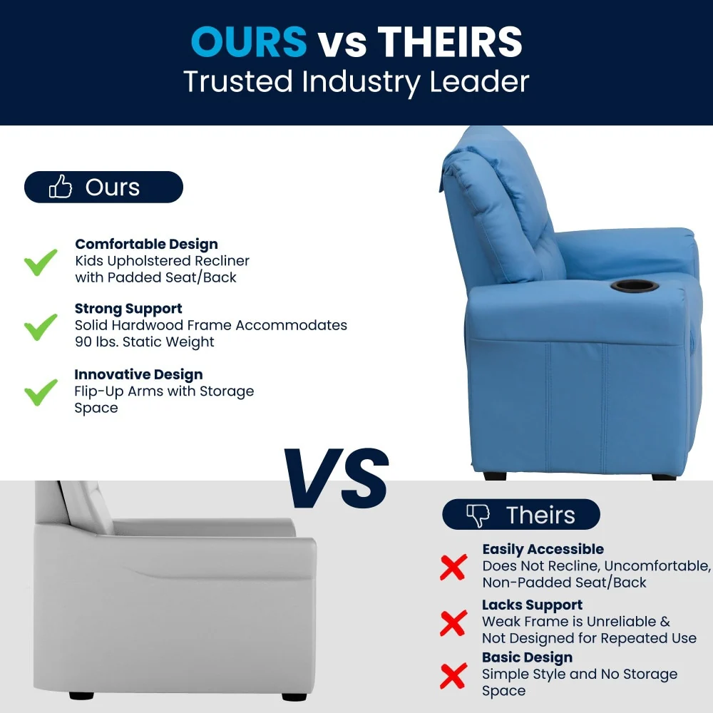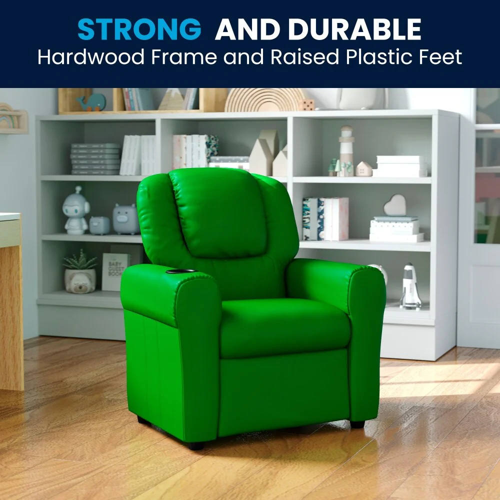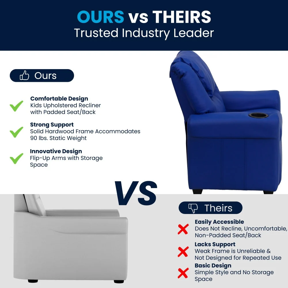 Get your kids their own comfy seating with this Contemporary Kids Recliner with Cup Holder and Headrest. Perfectly sized for young ones, this push back recliner is ideal for their living room, bedroom or playroom. Your little ones can sit comfortably on the plush back and seat upholstered with fire retardant foam, while also having their favorite beverage at arm's reach with the built-in cup holder. Cleanup is easy with the durable vinyl upholstery. With a solid hardwood frame construction, this chair can hold up to 90 pounds and includes a safety feature ensuring that the recliner will not function unless the child is in a seated position. This child-sized recliner is a great addition to your home and comes in multiple colors to fit any decor.
