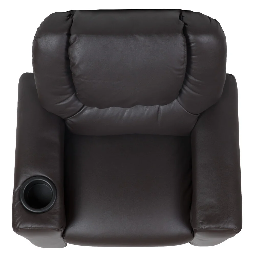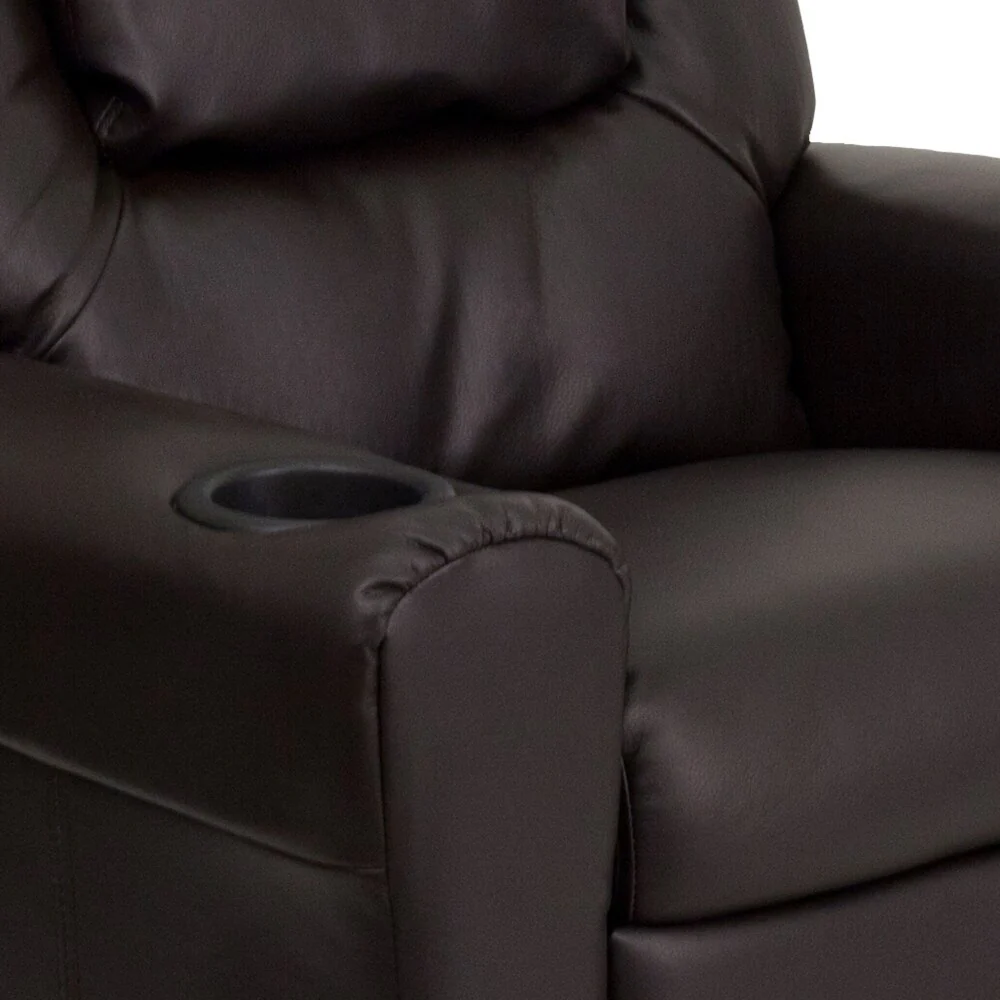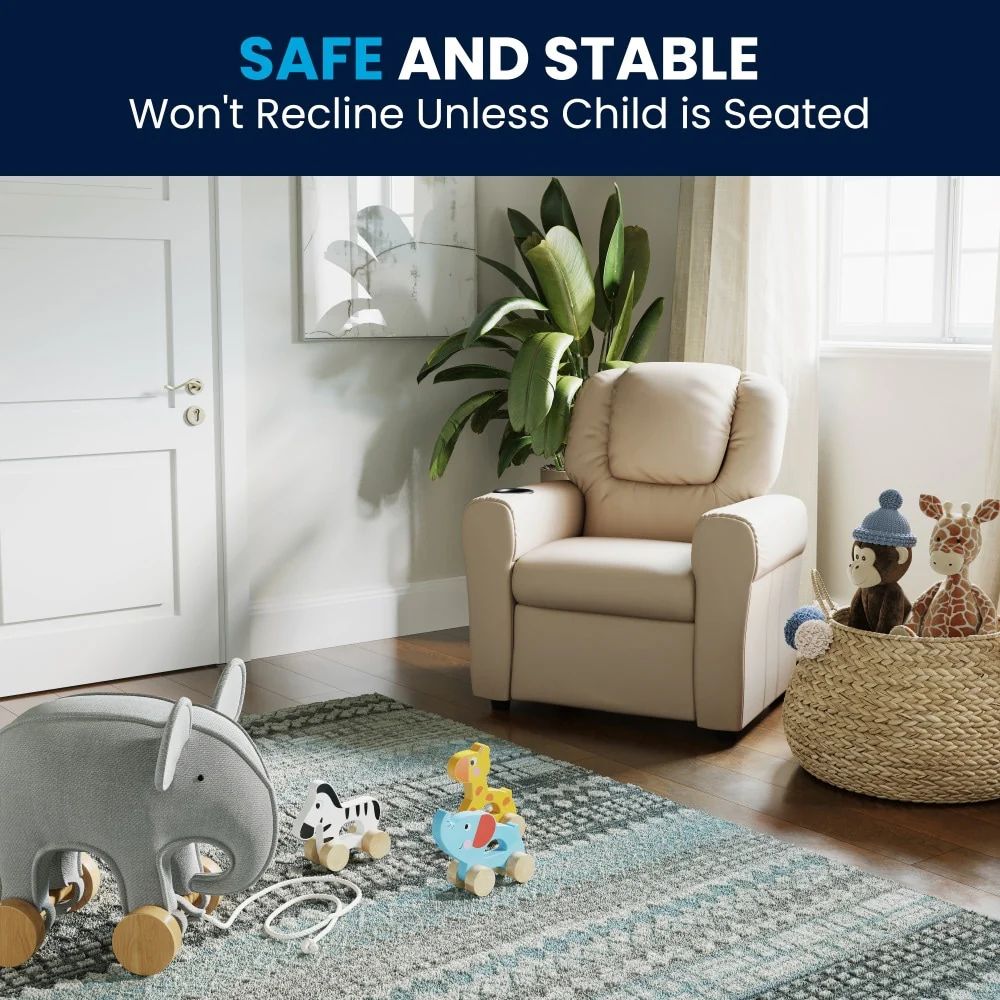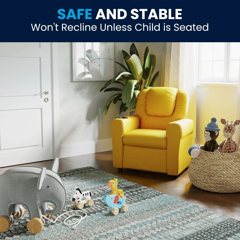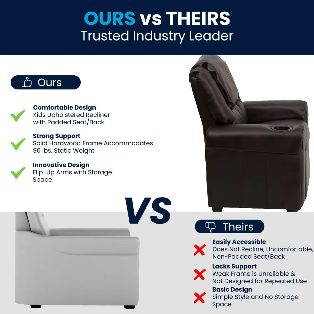 Get your kids their own comfy seating with this Contemporary Kids Recliner with Cup Holder and Headrest. Perfectly sized for young ones, this push back recliner is ideal for their living room, bedroom or playroom. Your little ones can sit comfortably on the plush back and seat upholstered with fire retardant foam, while also having their favorite beverage at arm's reach with the built-in cup holder. Cleanup is easy with the durable vinyl upholstery. With a solid hardwood frame construction, this chair can hold up to 90 pounds and includes a safety feature ensuring that the recliner will not function unless the child is in a seated position. This child-sized recliner is a great addition to your home and comes in multiple colors to fit any decor.