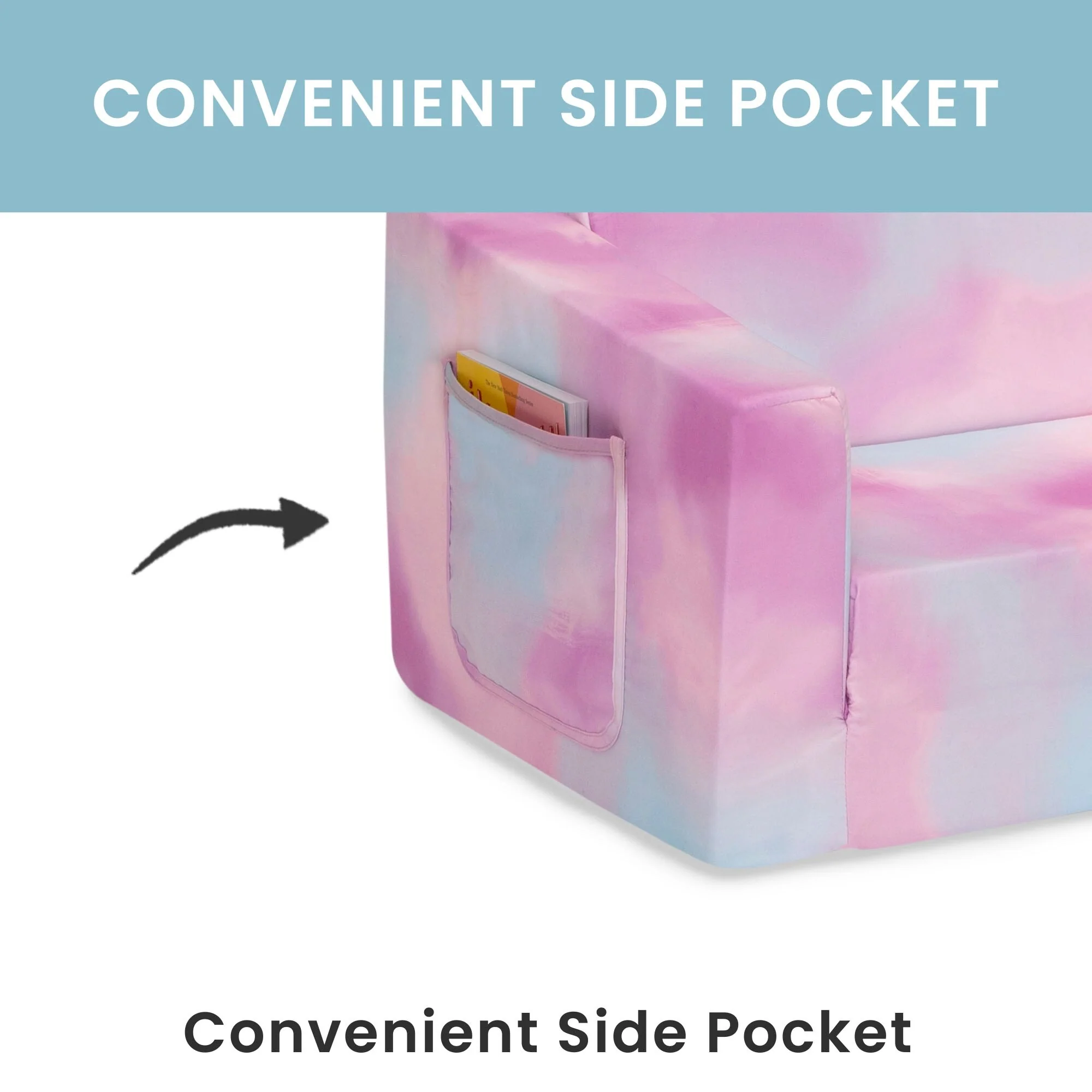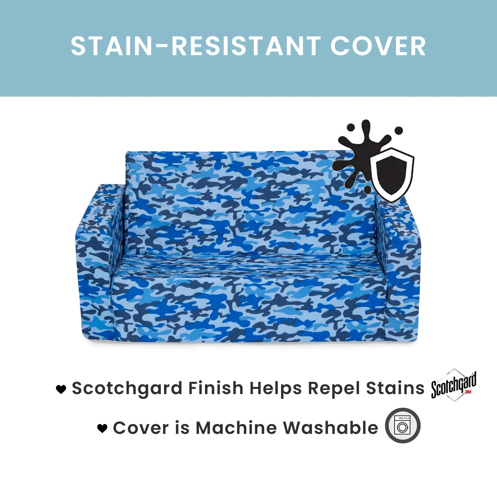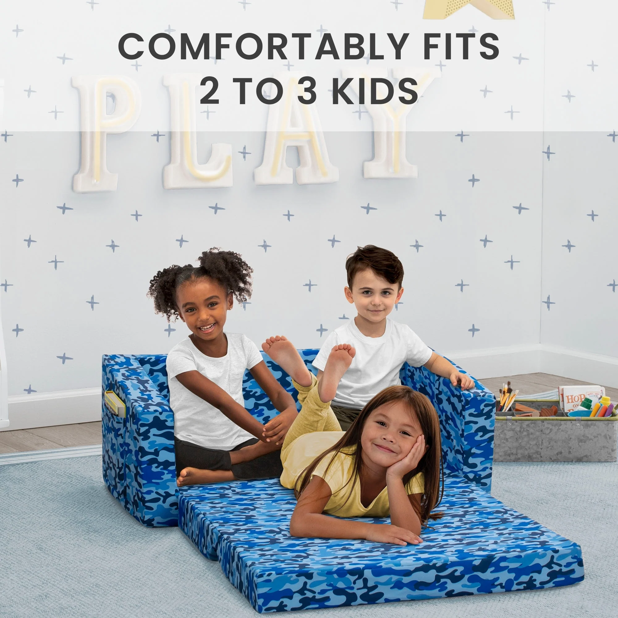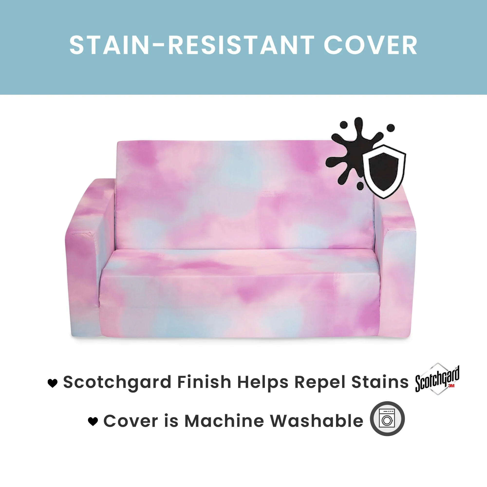 The Delta Children Cozee Flip-Out Sofa is a 2-in-1 convertible sofa and lounger that's perfect for kids to relax and sleep on. During the day, the cozy chair is a great spot for reading or watching movies, but at night, it easily folds out into a comfortable sleeper bed. Designed for ages 18 months and up, it's spacious enough to fit three small kids or two older children in sofa mode. The super-soft slipcover is treated with Scotchgard stain release finish to resist stains, and the foam construction ensures all-day comfort. The lightweight sofa can be moved from room to room and features a machine-washable slipcover that zips off for easy cleaning.