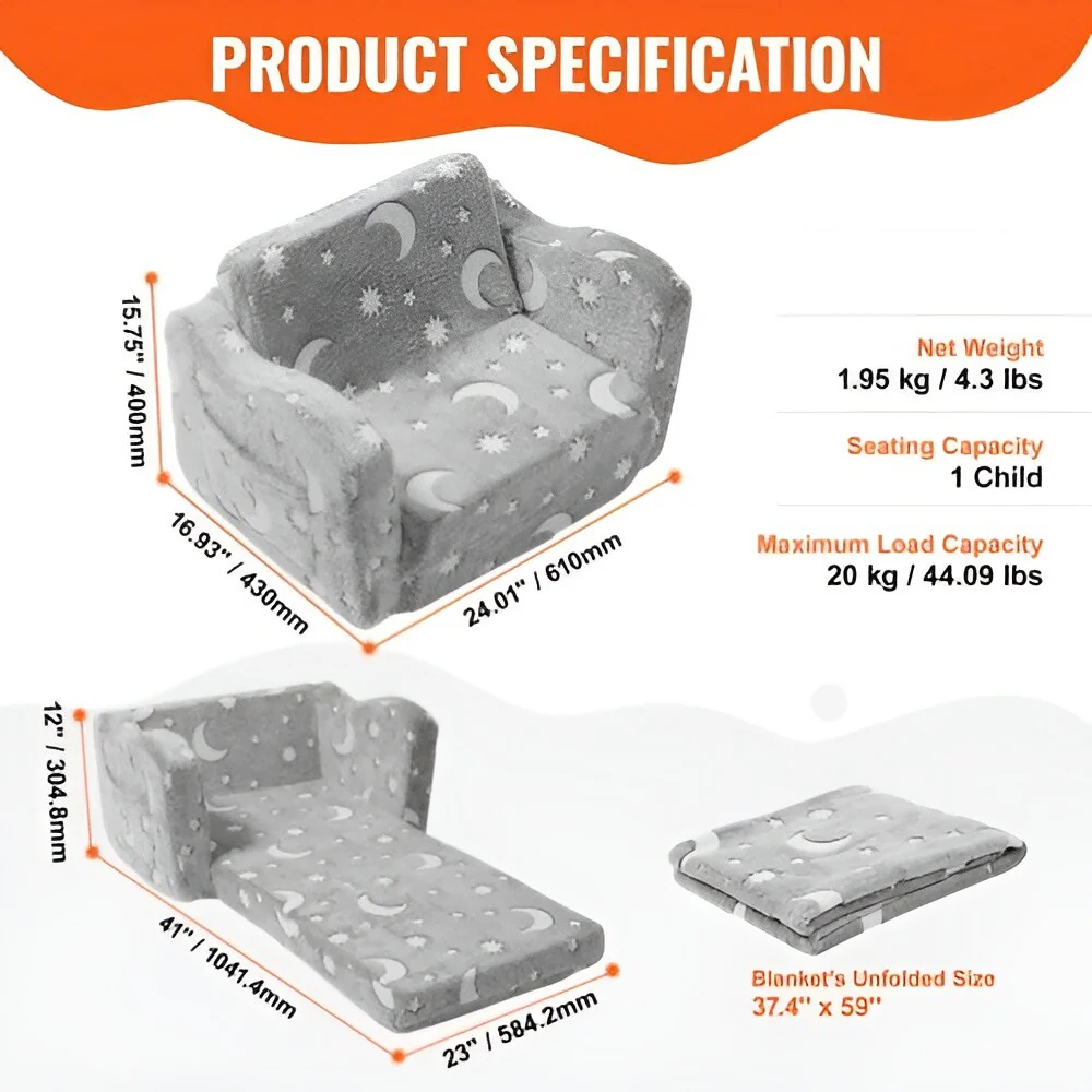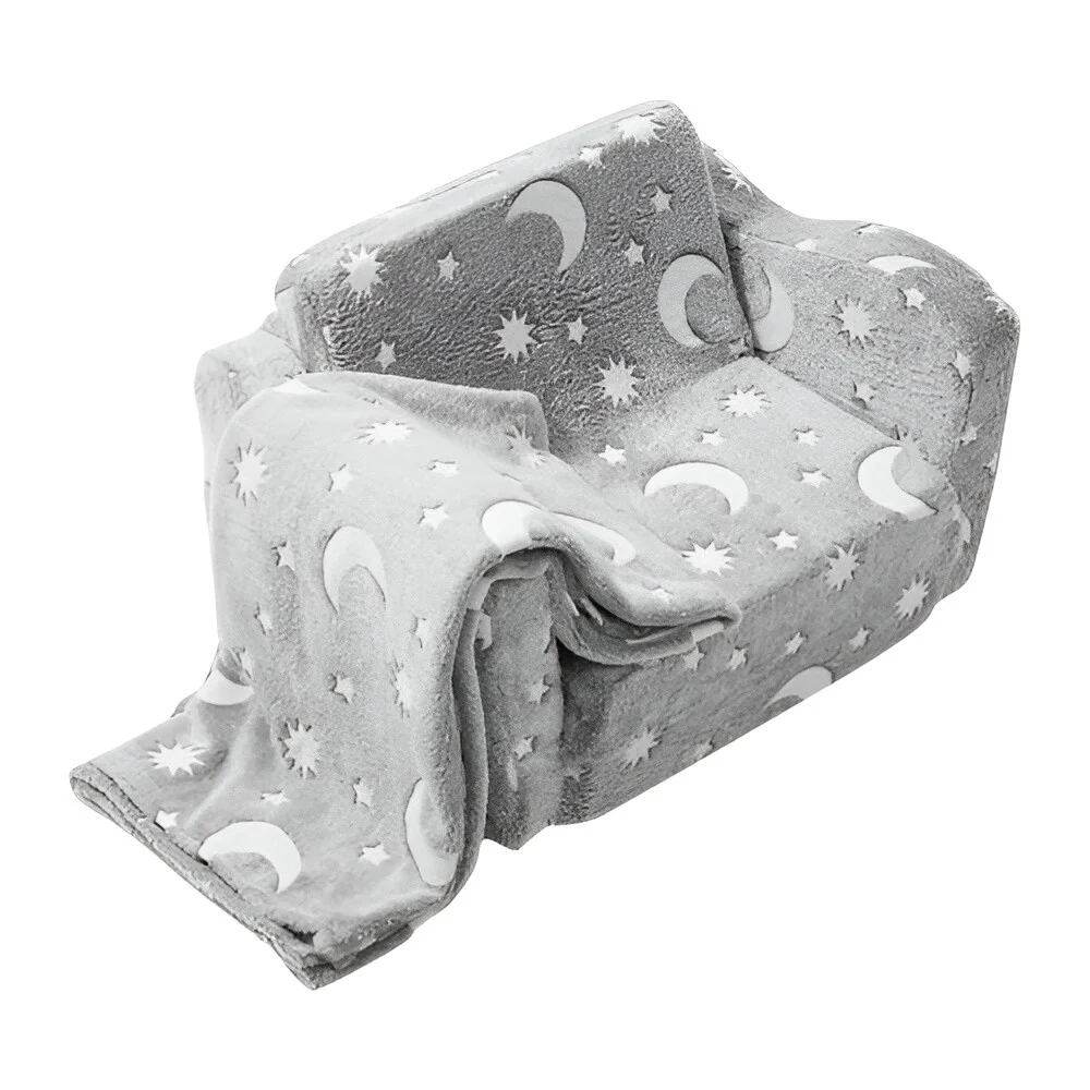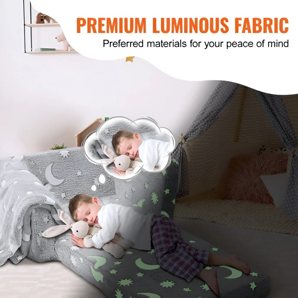 - Inspire Imagination: Utilizing luminous fabric, this kids couch absorbs light during the day and releases it in the dark. The creative design of the glow-in-the-dark sofa cover and blanket can spark children's curiosity and exploration. Enhance the fun factor with this foldable kids couch.