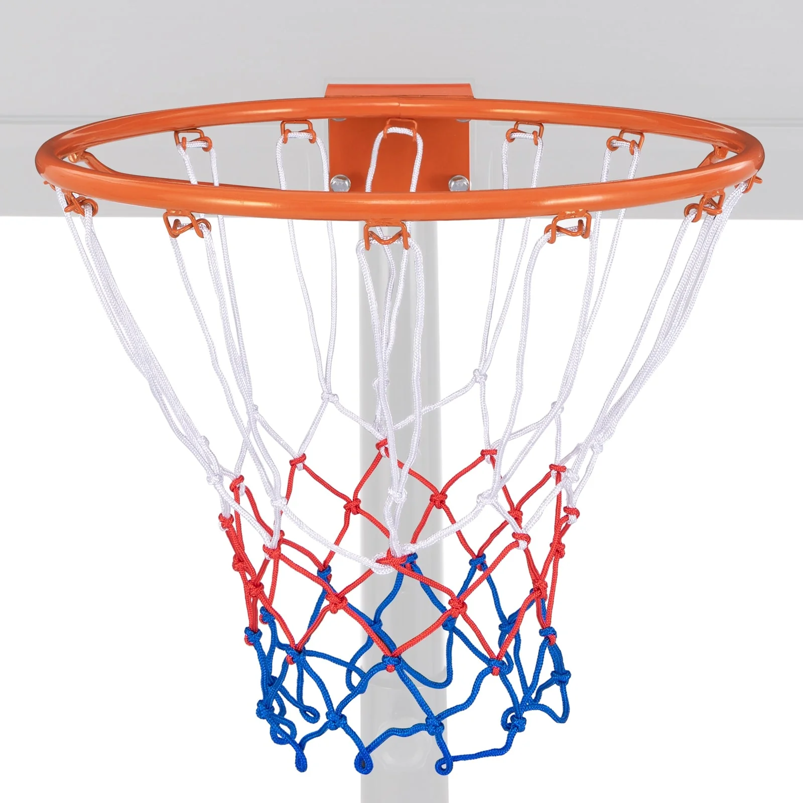 Enjoy exciting basketball games anytime you want with this basketball rim!Whether you're looking to set up a play area in your home or enhance a community space, this basketball rim easily attaches to any wall or door. 4 screws are included for hassle-free installation. Crafted from powder-coated metal frame, our basketball rim replacement is thoughtfully crafted to withstand the exposure to all kinds of weather. In addition, the multi-colored net allows for clearly visible aiming when you practice your skills with this basketball hoop replacement.