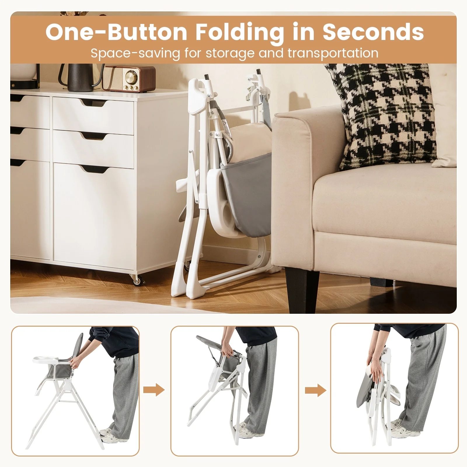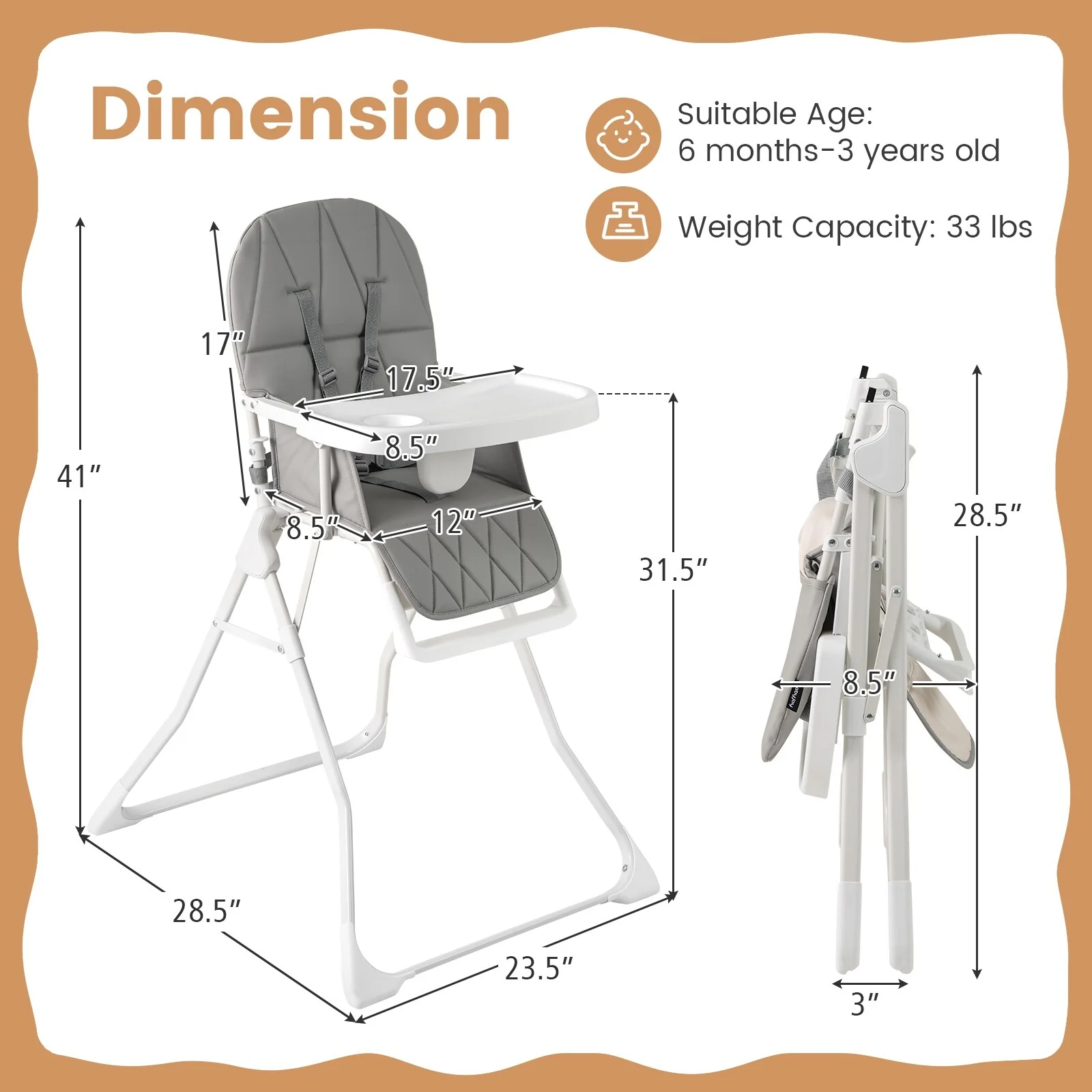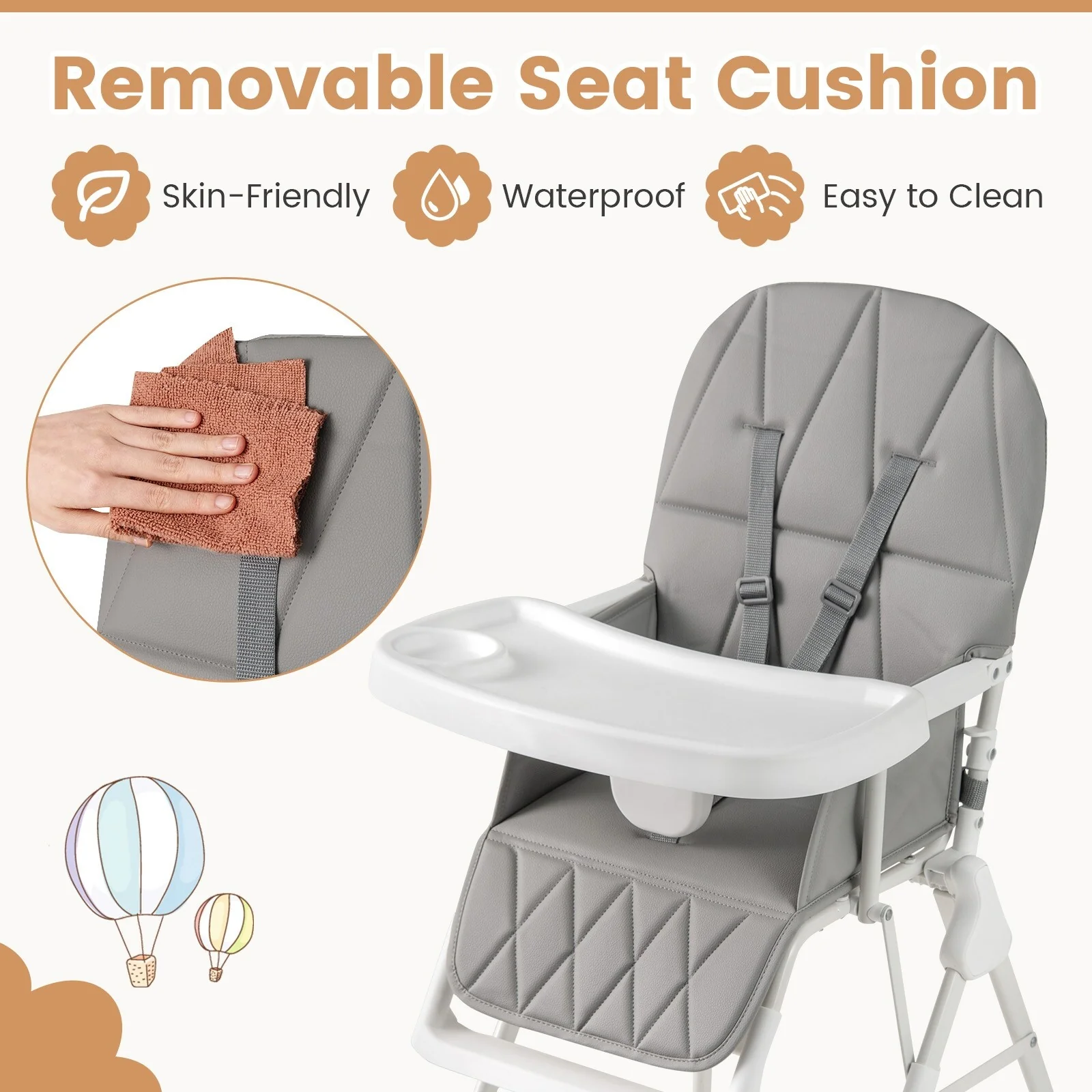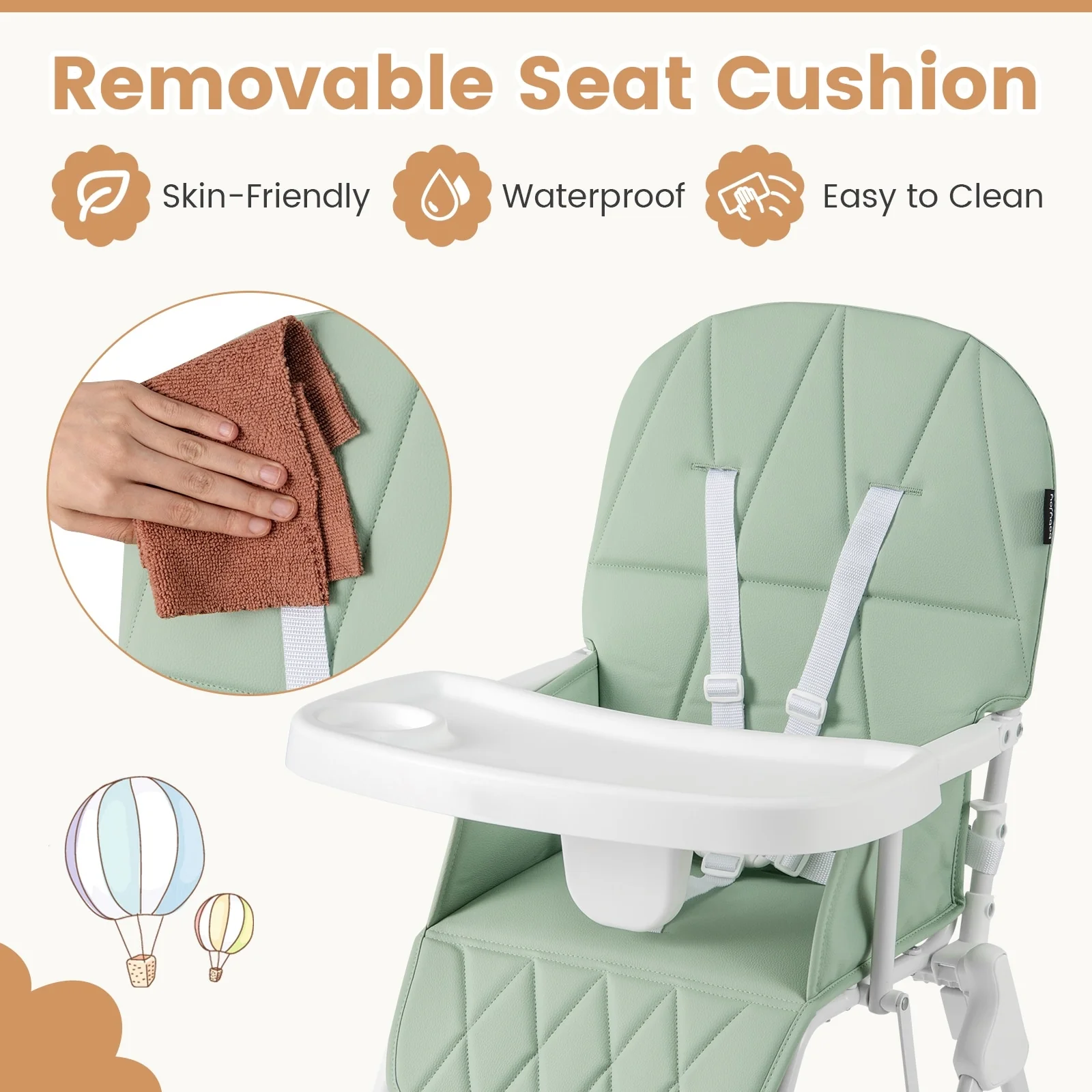 Simplify mealtime with this foldable highchair.The removable PU cushion and heat-resistant food tray ensure effortless cleaning - the tray is even dishwasher safe. Conveniently foldable and portable, it's ideal for storage or on-the-go parents. Safety is paramount with BPA-free materials, a 5-point harness, anti-falling baffle, and secure anti-slip feet. Offering flexibility with adjustable tray and footrest positions, this chair grows with your child from infancy to toddler years.