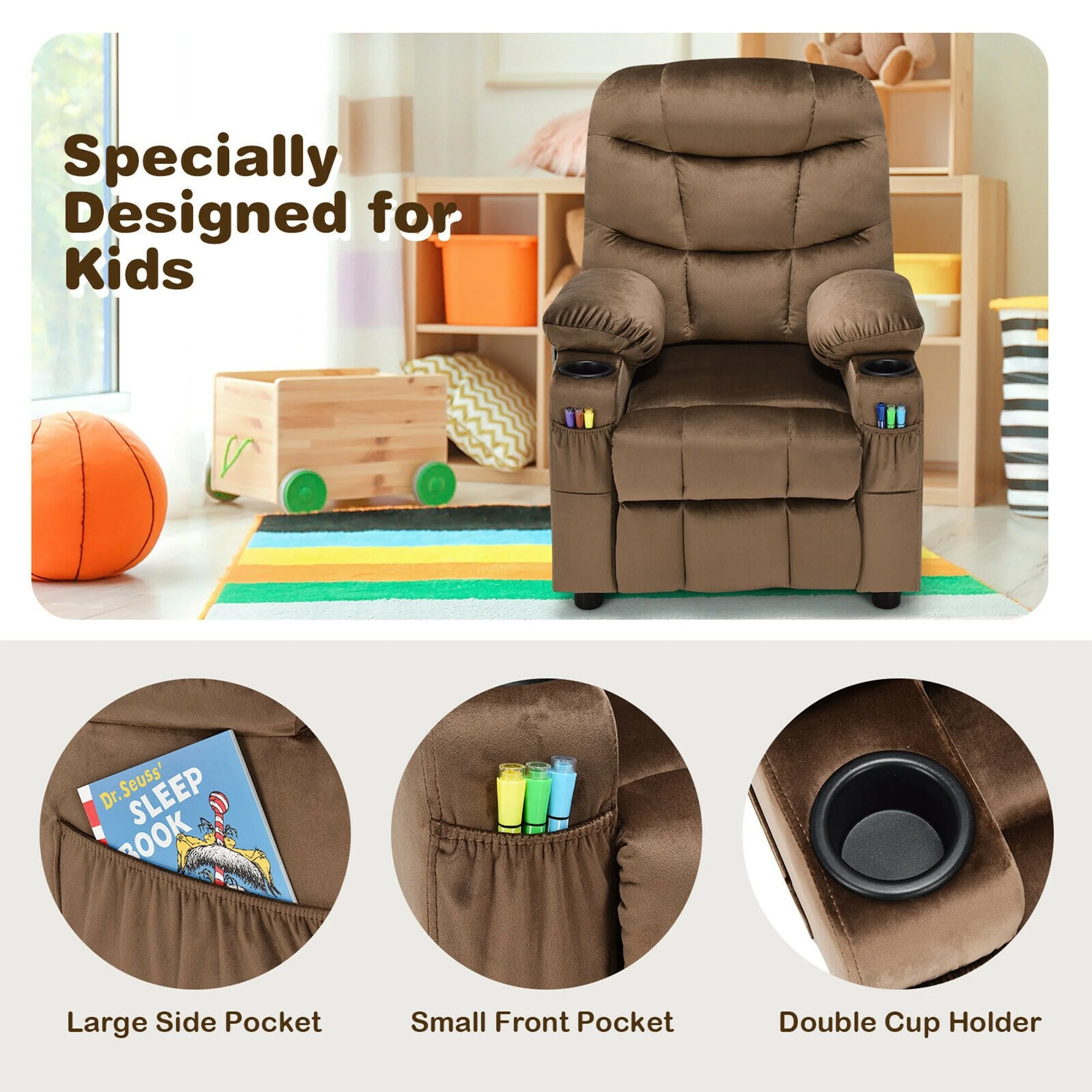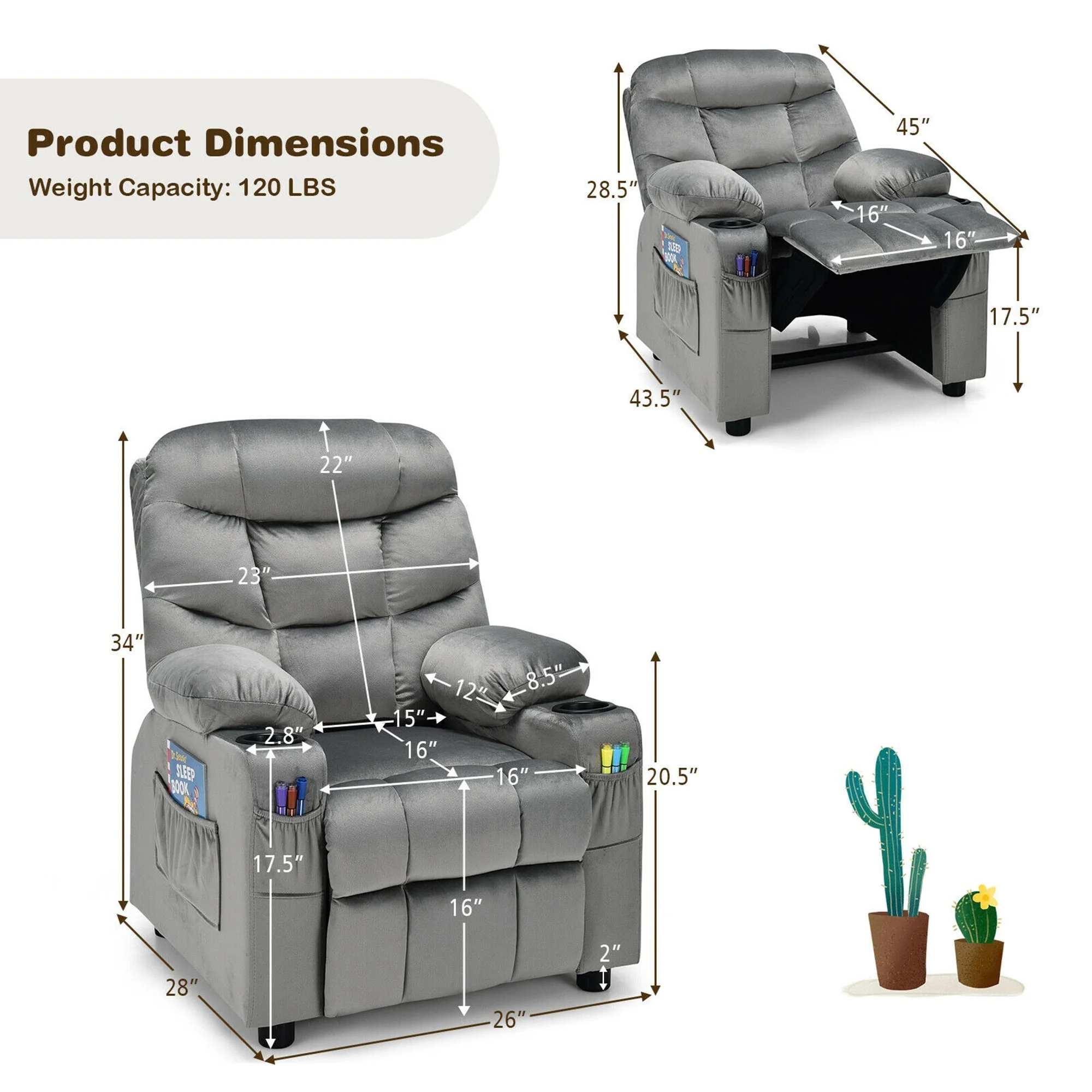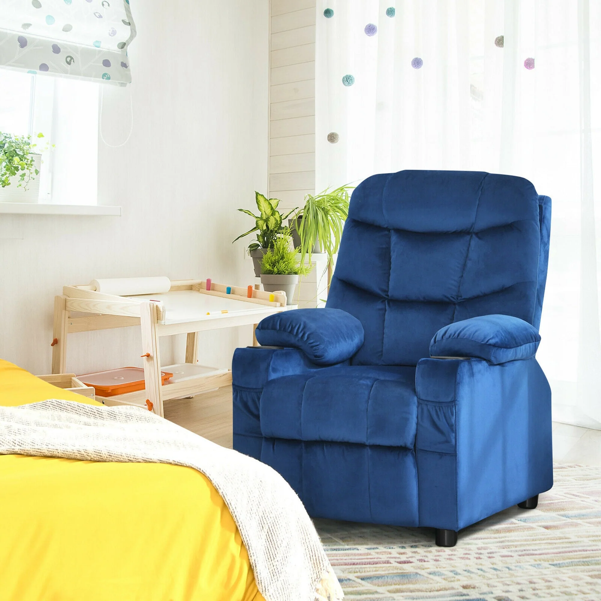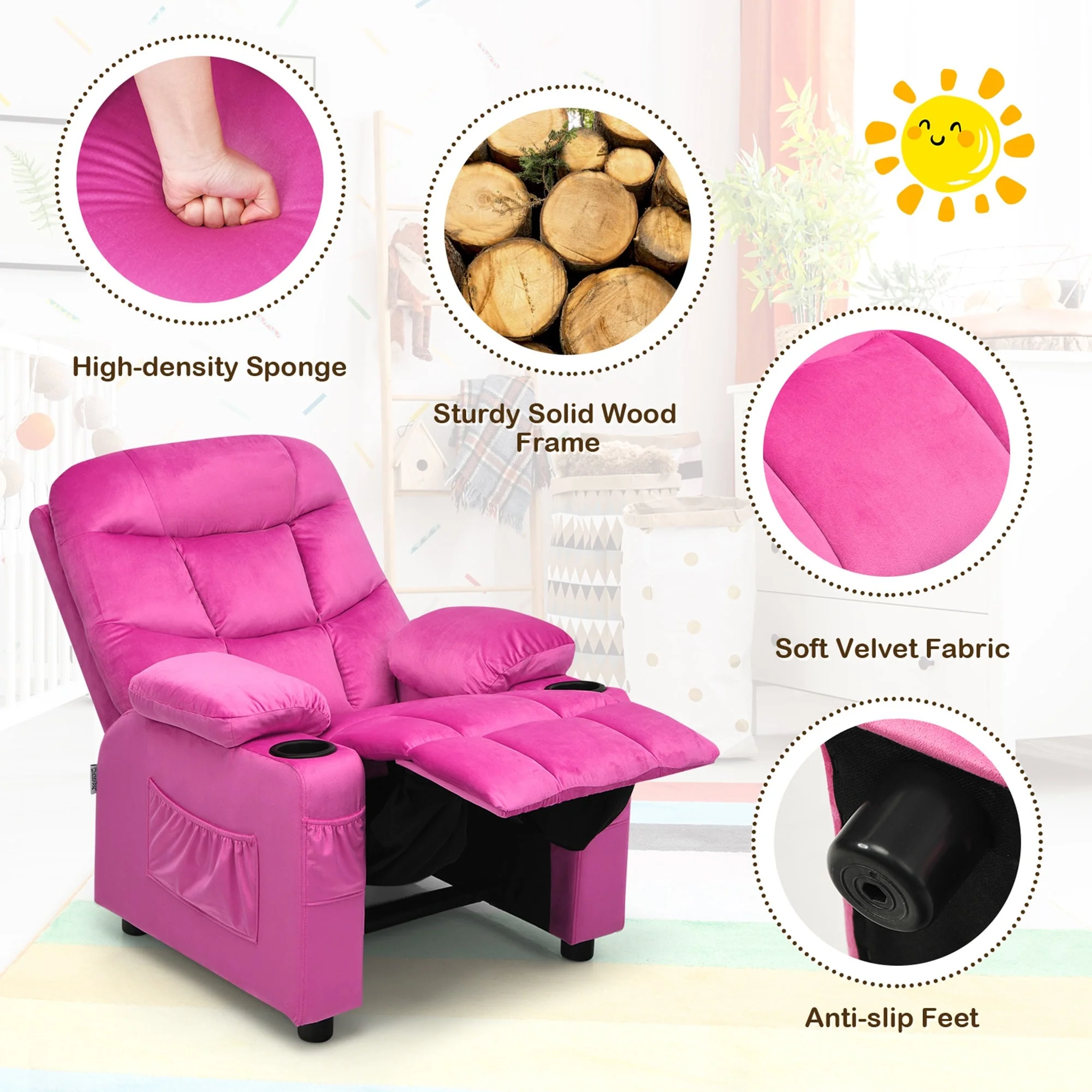 Our kid's recliner chair will provide your children with an exclusive leisure place and accompany them to grow up. This recliner is easy to operate for sitting or lying by adjusting the backrest and footrest, so as to meet kids' different needs of reading, watching TV, napping, etc. Premium velvet fabric, sturdy solid wood frame and thick sponge padding ensure that the chair can withstand long-term use. Featuring an ergonomic high backrest and wide armrests, our sofa will offer extra comfort and relaxation. It is also worth mentioning that this recliner is designed with cup holders and side pockets, allowing kids to put water cups, snacks and books within reach.