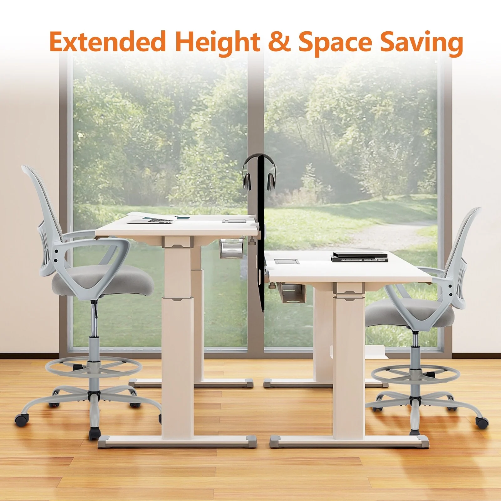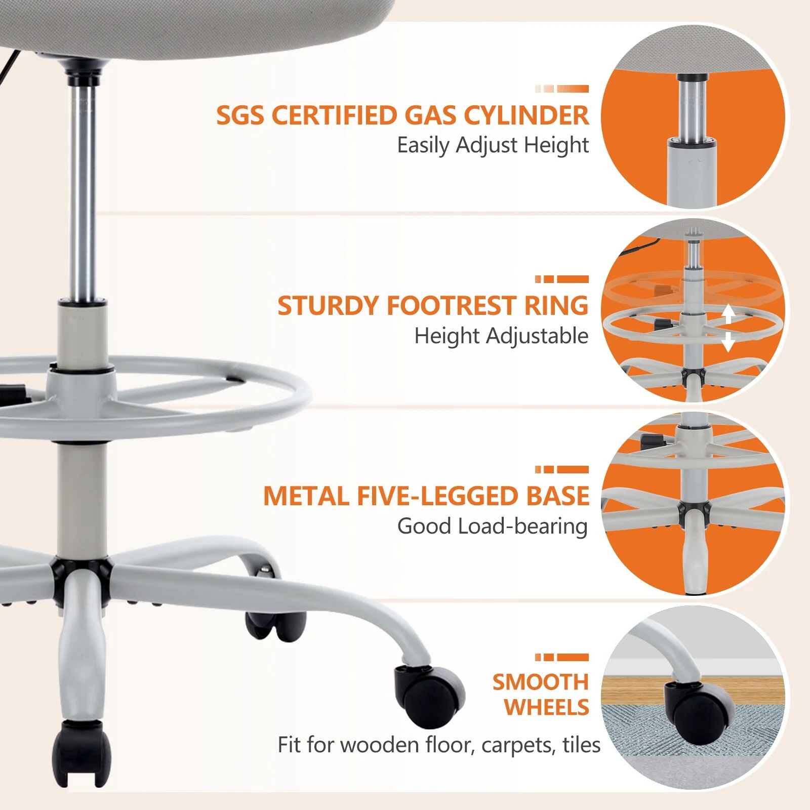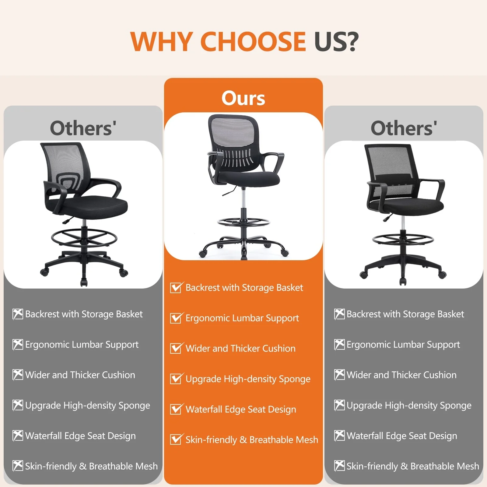 This tall desk chair is designed for comfort and support with its high-density foam seat and elastic mesh backrest. The thick cushion reduces pressure on your pelvis, while the breathable mesh keeps you cool throughout the day. Its ergonomic design ensuresexceptional lumbar support, promoting a healthy sitting posture, making it perfect for extended hours at standing desks, drafting tables, or home offices.