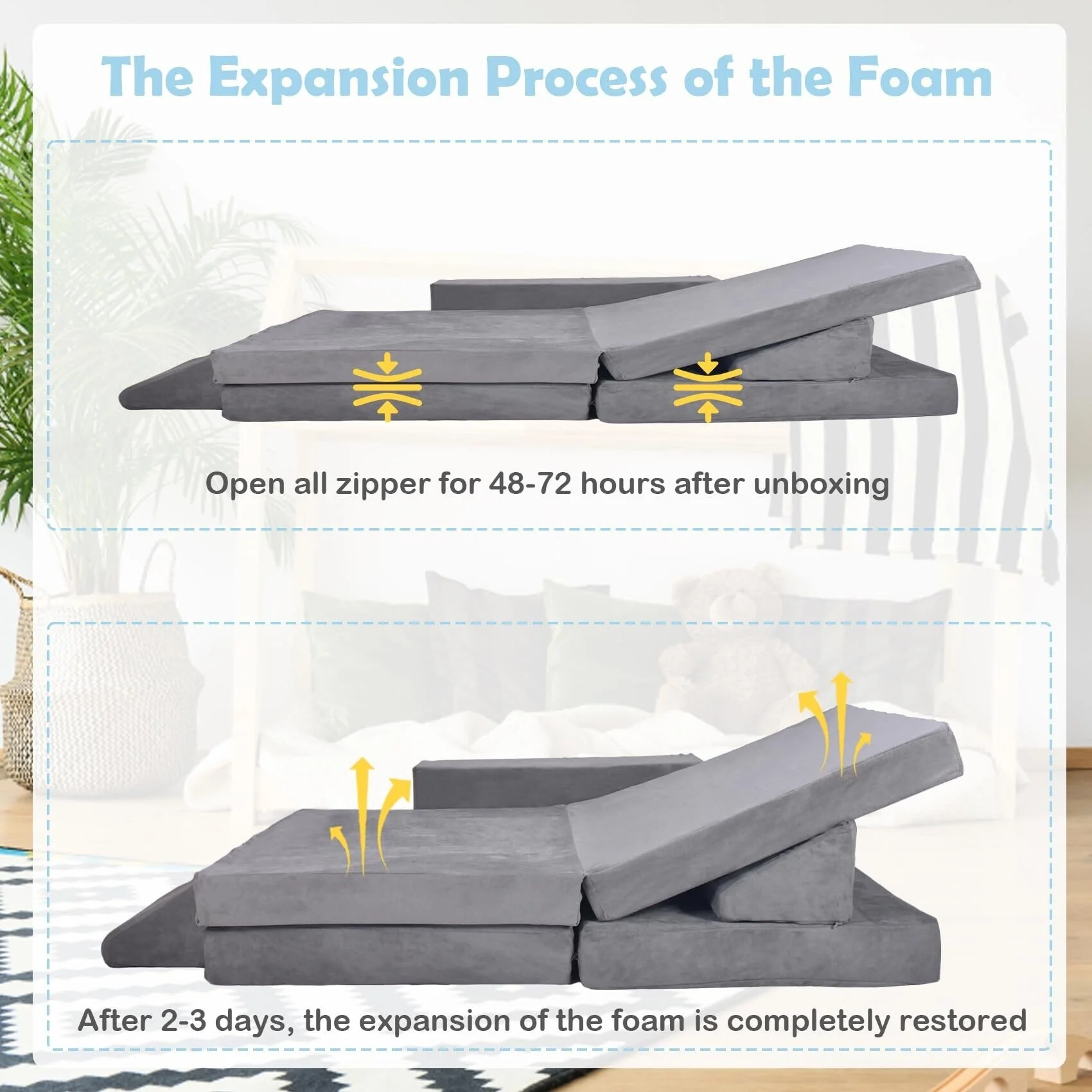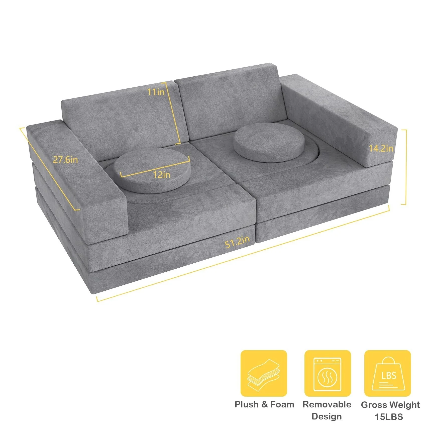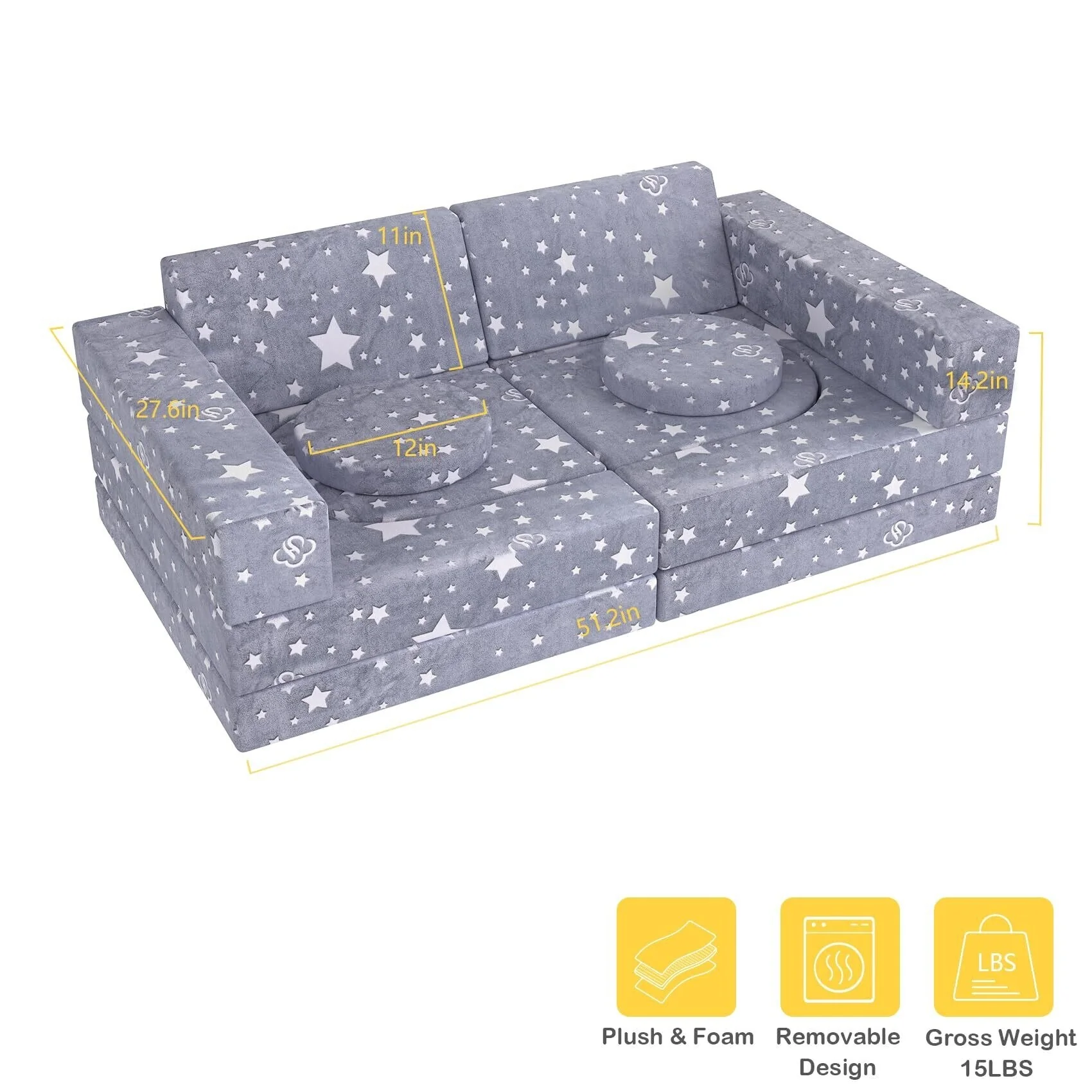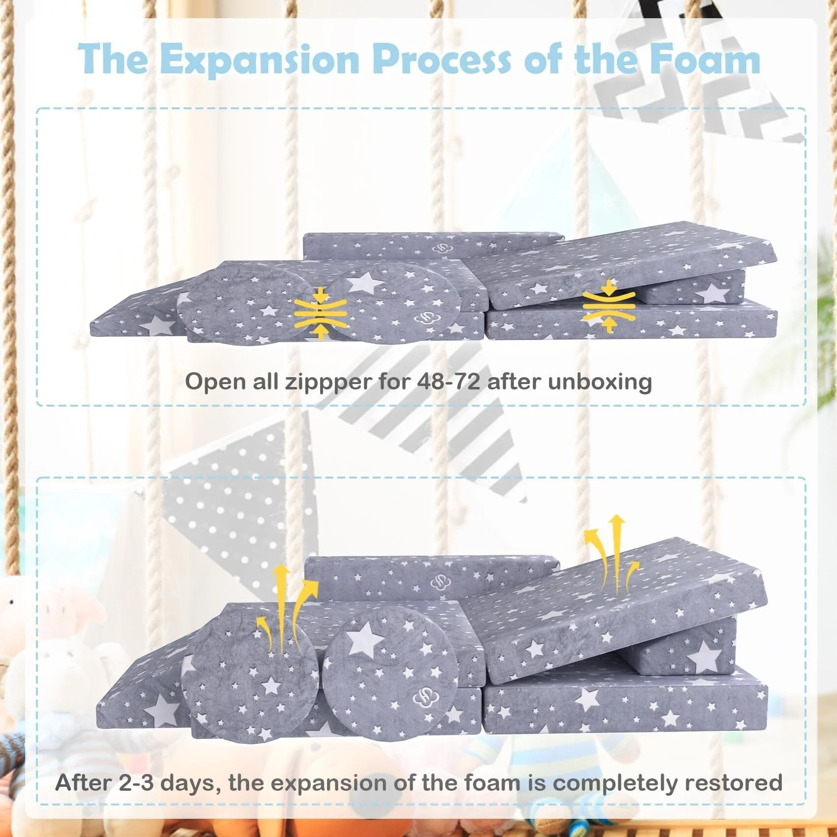 【12PCS Modular Children's Sofa】The kids sofa has 12 pieces: 1*U-shaped block(4 parts), 1*Cube Conjoined block(2 parts) 2*trapezoidal block, and 2*cuboid block. and we still have 2 Cylindrical blocks. Be used as a car, tent, church, scooter, castle, slide, sofa or recliner, etc., to increase children's creative space and imagination. The foam sofa is vacuum packed, please allow 48-72 hours for the foam to fully decompress before using. The rebound of foam will be affected by temperature.