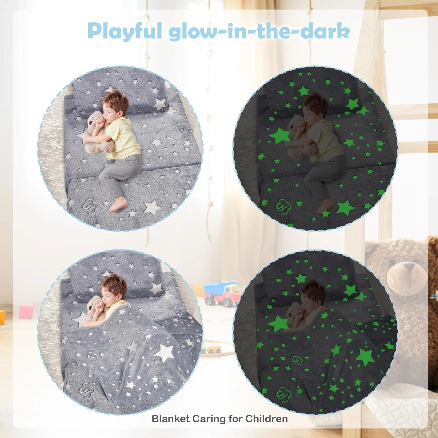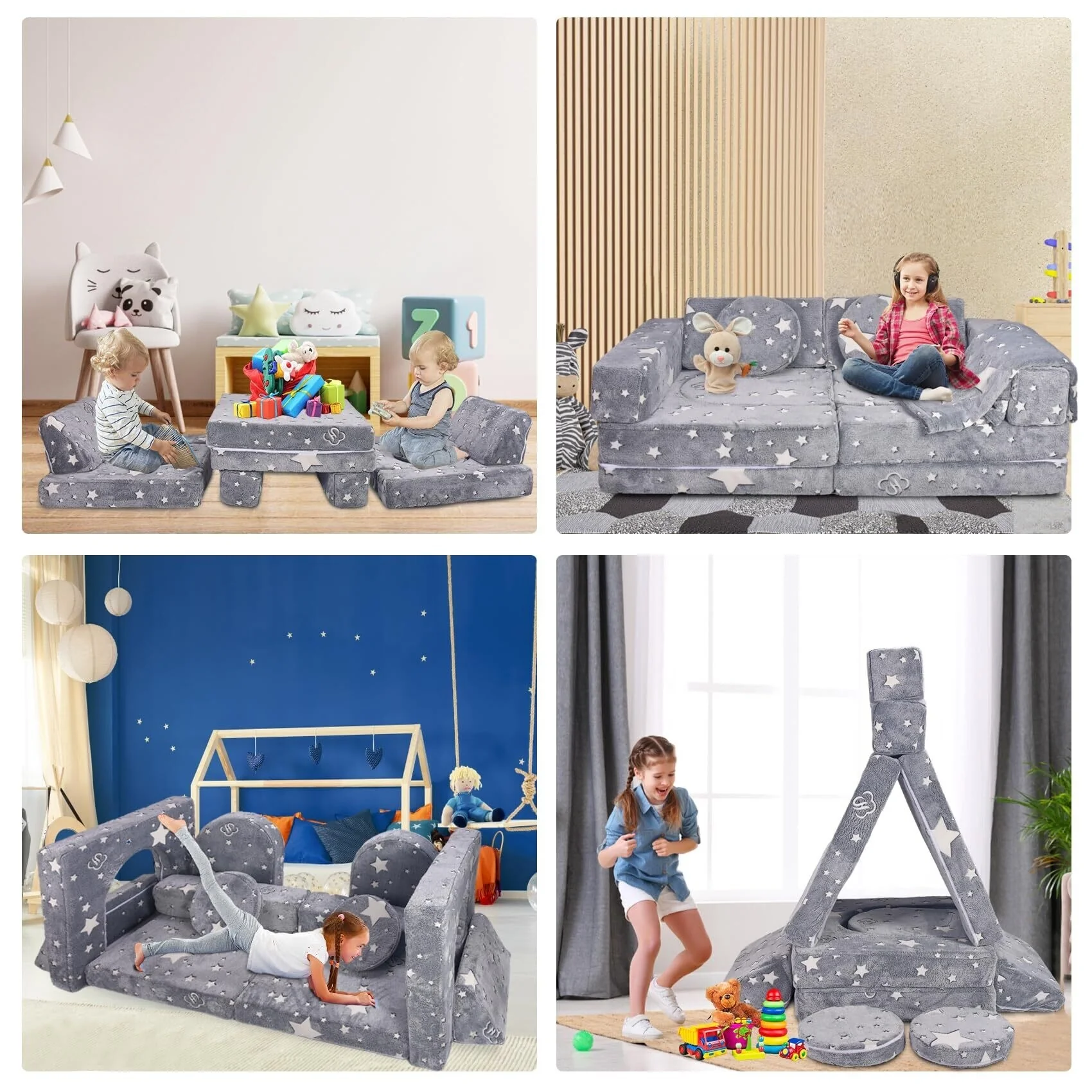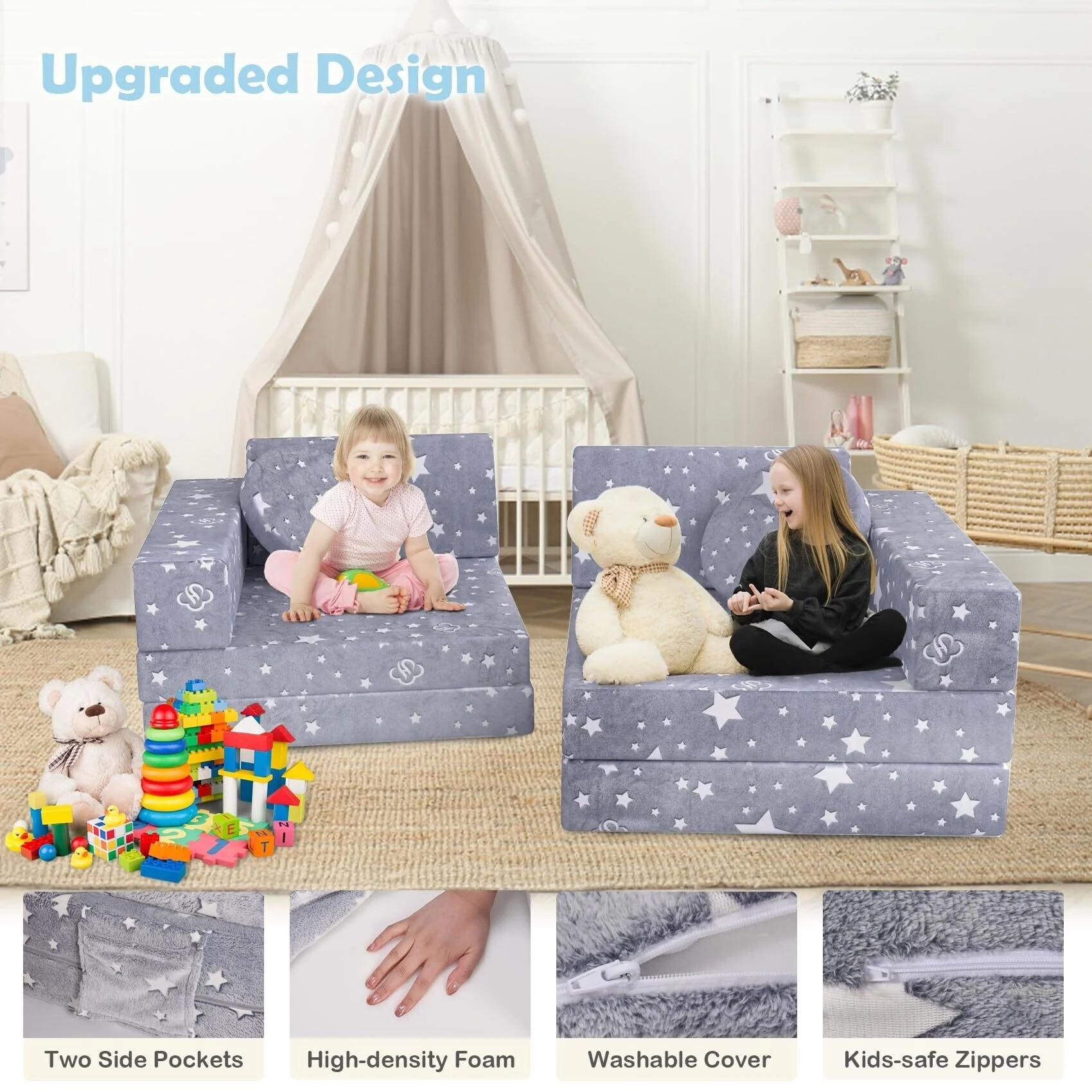 【Romantic Star Luminous Design】Put the baby foam sofa under strong light or sunlight for 10-15 minutes, then turn off the light or take it to a dark room, so you can see the magical light of stars. The stronger the light passed, the stronger the glow of the star pattern in the dark. You can enjoy the fun star pattern with your kids, or give it a super unique birthday or shower gift for kids and toddlers! Satisfy children's fun of playing, climbing, chatting, watching TV, or building.