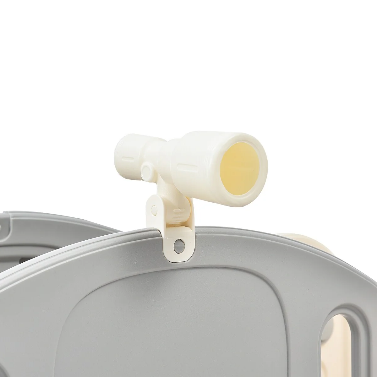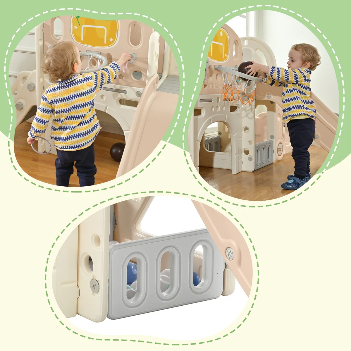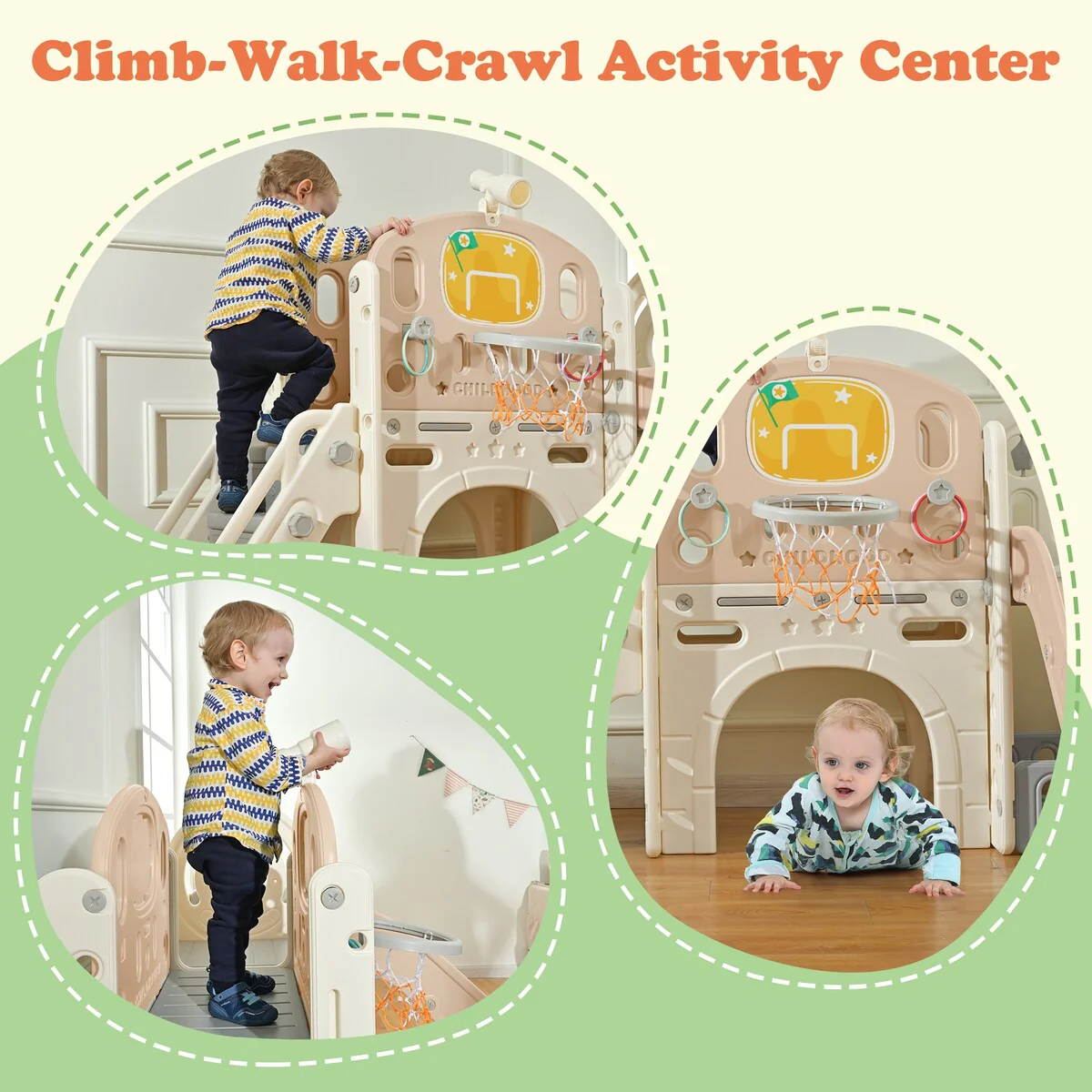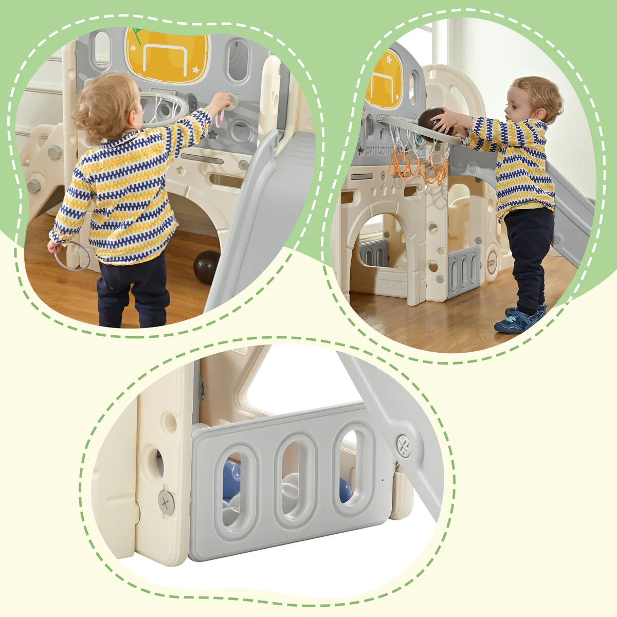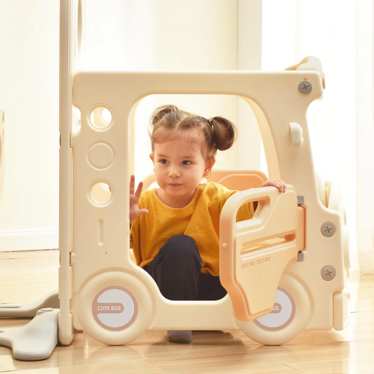 [9 IN 1 Slide Set ] This freestanding slide toy structure includes 9 main play parts that kids will love most: stairs for climbing, smooth slide for free descent, basketball hoop and throwing ring for playing, arched tunnel for crawling, toy telescope, a storage compartments for hiding and storing your own small toys, a corridor for kids to play through, and a realistic bus model.This surprising combination can bring endless play fun to children.