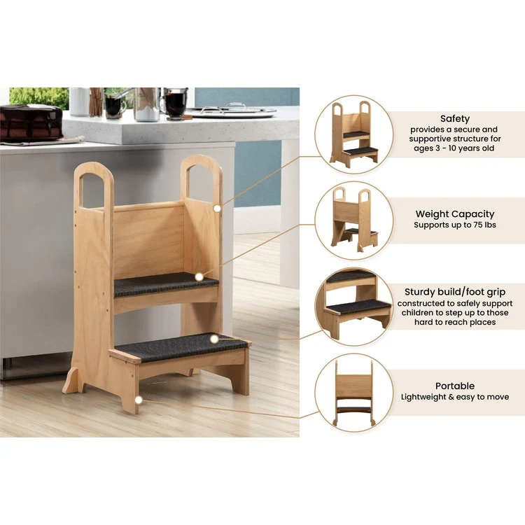 - Safety and Fun Always: Safety is our top priority. The sturdy, slip-resistant steps and engineered composite wood base offer stability and support. The stool features a non-slip foot mat for improved grip and safety rails on both sides to prevent accidental slips or falls, allowing your child to confidently participate in daily tasks.