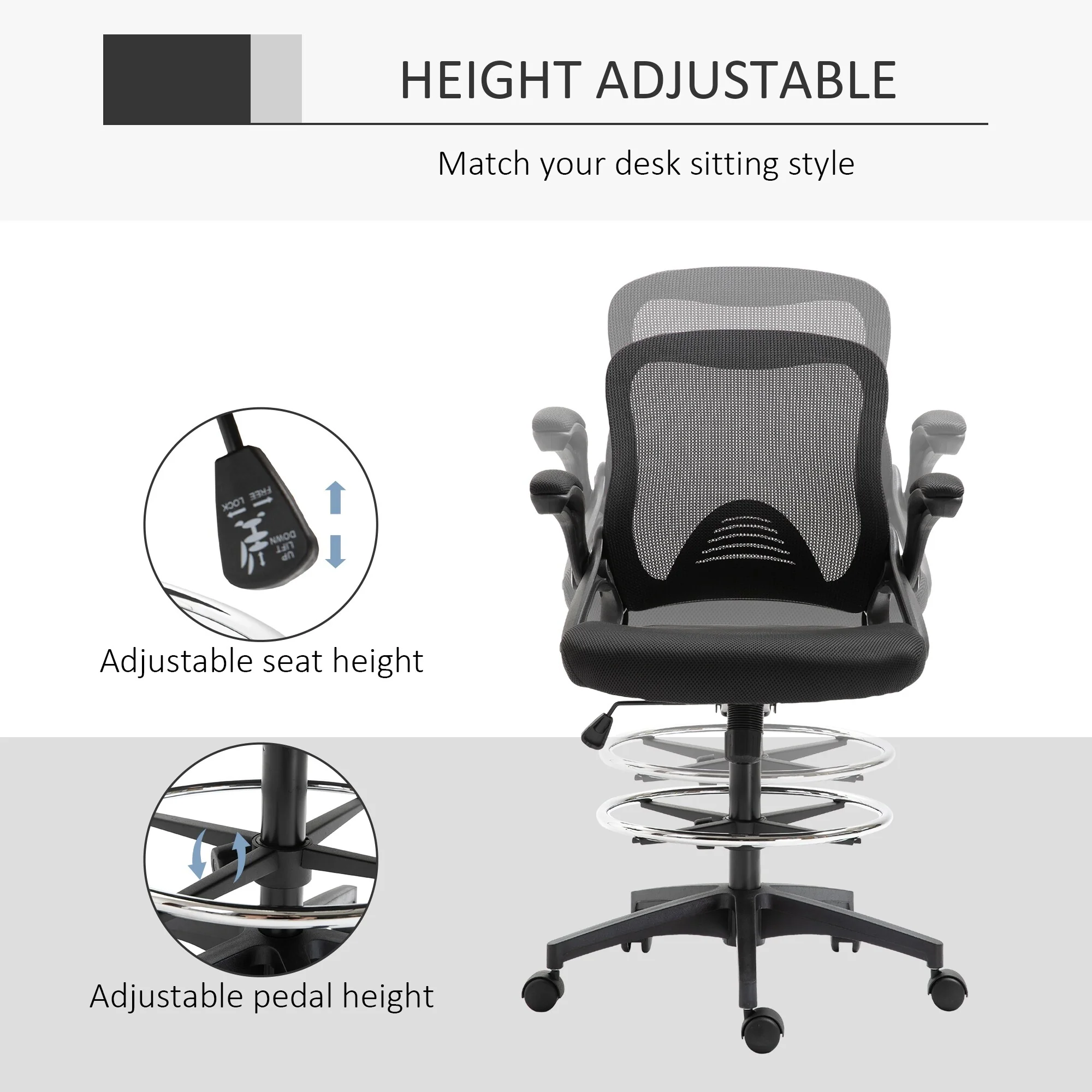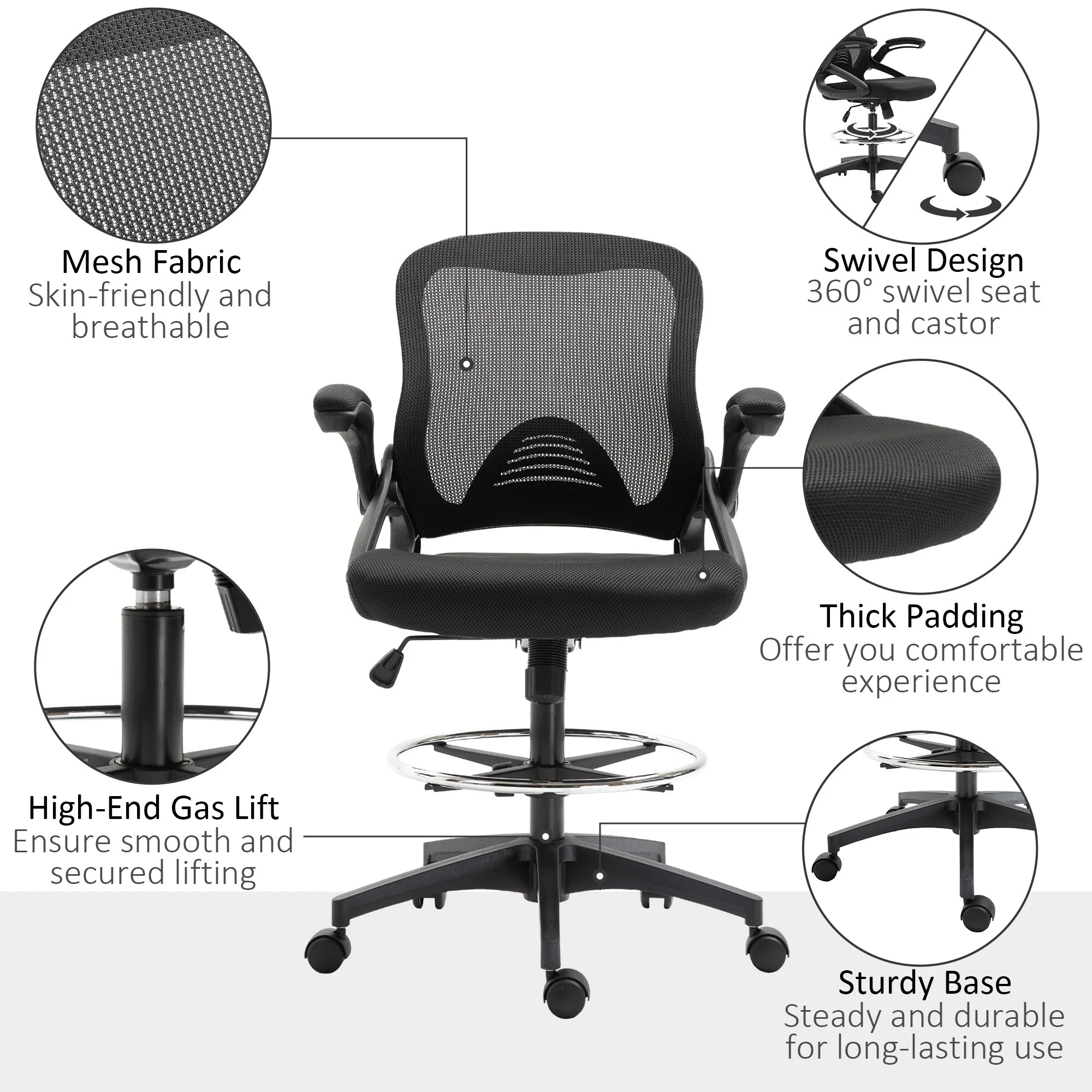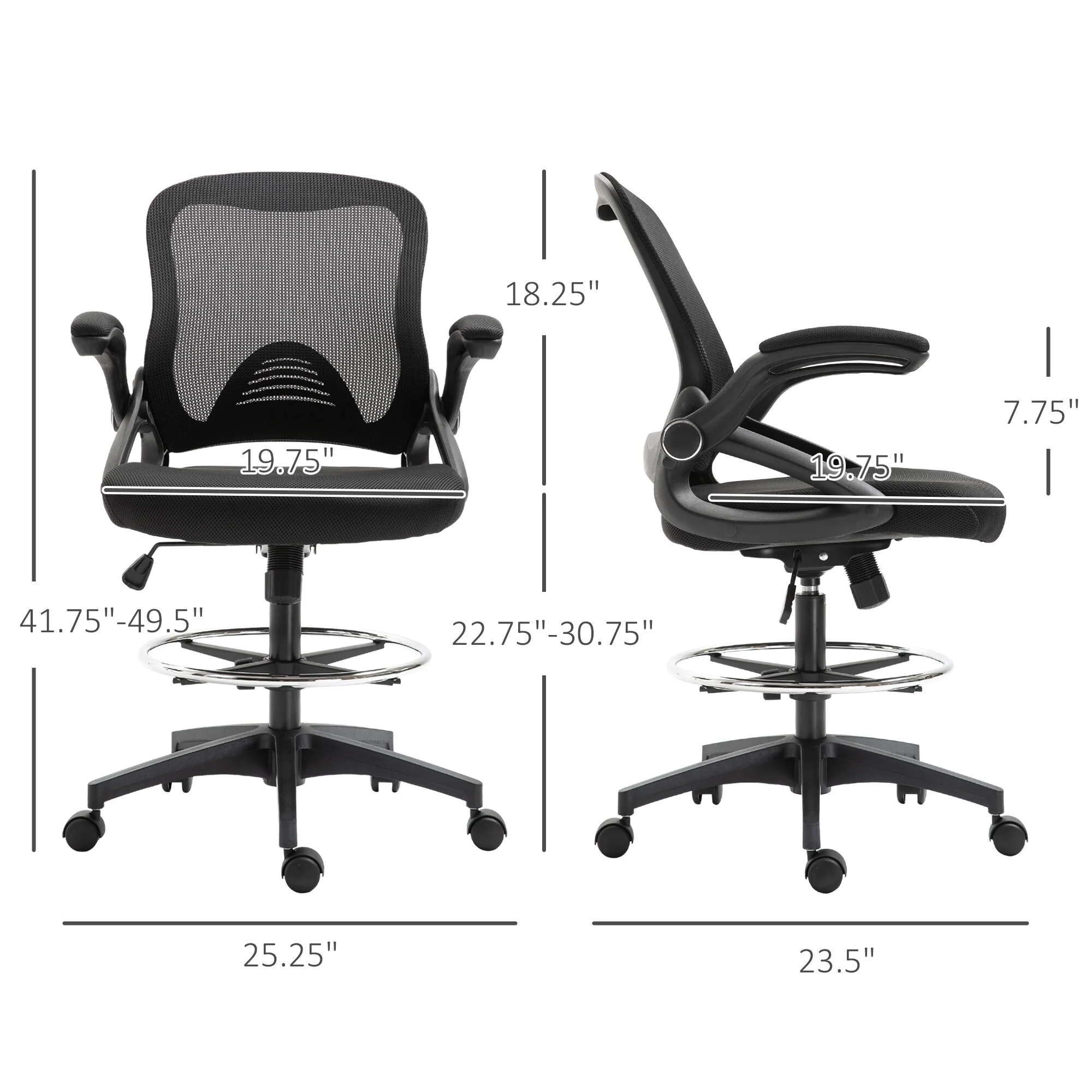 This versatile drafting chair offers customizable comfort with adjustable seat and footrest heights, tilt tension, and 360-degree swivel functionality. Ideal for high desks, studios, or workspaces that require flexibility, it features a comfortable foam-paddedseat and flip-up armrests for easy storage. Perfect for those who need to sit or stand with ease, it's a practical addition to any office or home setup.