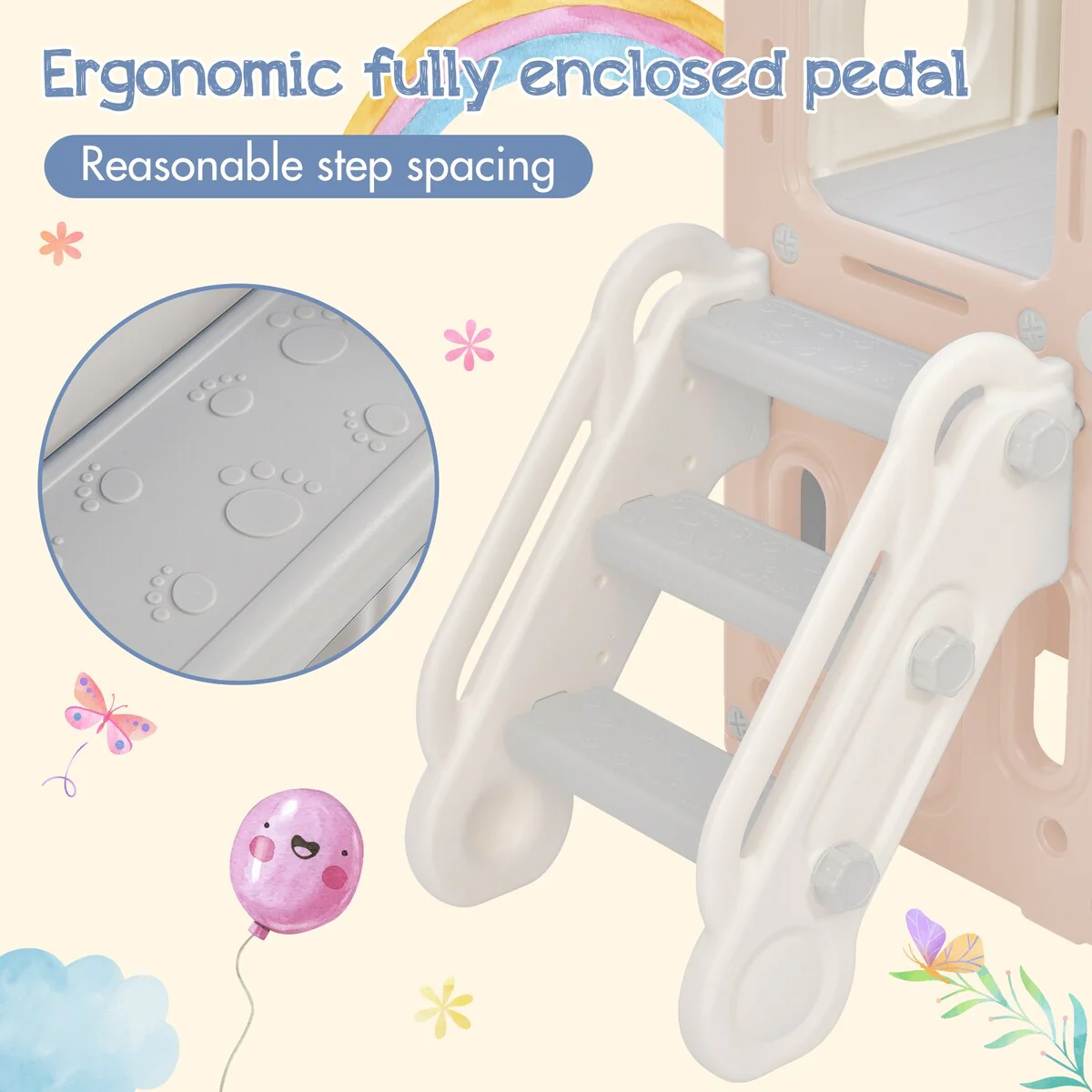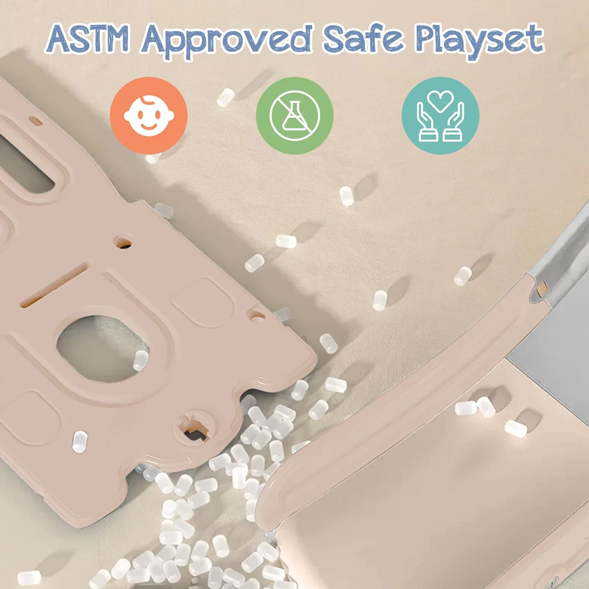 This slide playset structure includes 5 main play parts which are kids' favorites: a step ladder to climb, a smooth slide to rush down freely, a swing set to swing, a basketball hoop and an organizer compartment to hide and store their own small toys. First of all, our material is made of certified HDPE material. It is completely non-toxic and will not cause any impact on the baby's health. Parents can buy this set of suits at home with peace of mind, and build a dream playground for their honey babies. The stable and safe structure is also full of design. The patterns of steps not only attract children's attention but also effectively prevent slippage. The smooth surface allows children to play freely and pleasantly. The structure is stable enough, and you can also inject water at the bottom of the device to further enhance the stability. For the safety of children, the upgraded slide is also thoughtfully designed to prevent children from accidentally slipping. And this crown-themed slide climber playset has an impressive shape. Build a little world for your child to explore indoors. Helping them develop an abundance of curiosity about the world. Finally, This swing and slide set is easy to install and clean, which is undoubtedly the best gift for children. The babies can climb up and down here, play ball, swing, and enjoy the fun of their childhood.