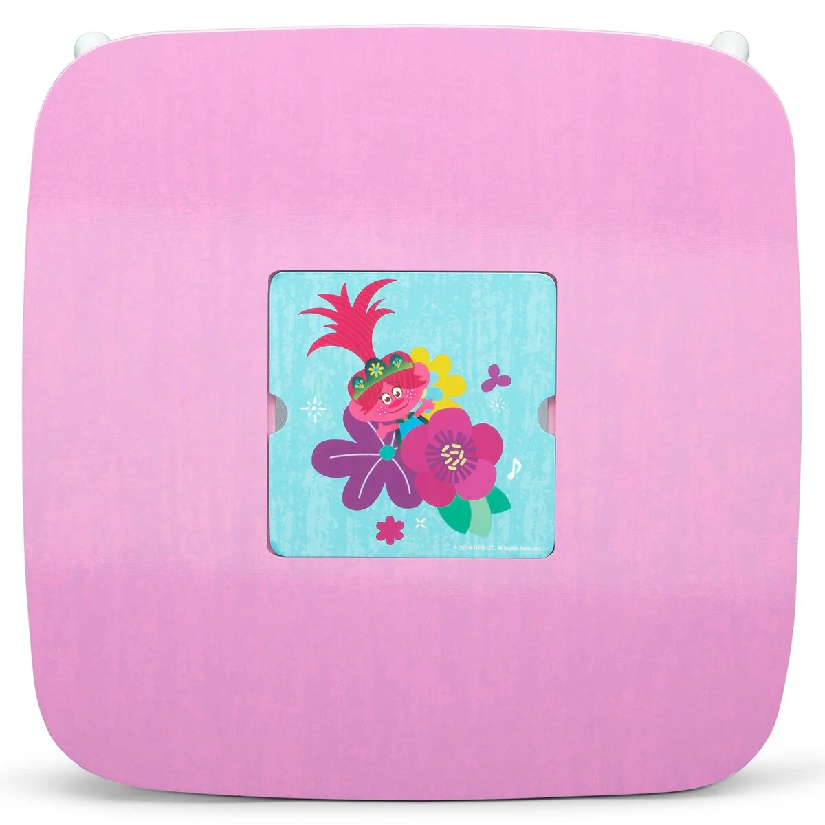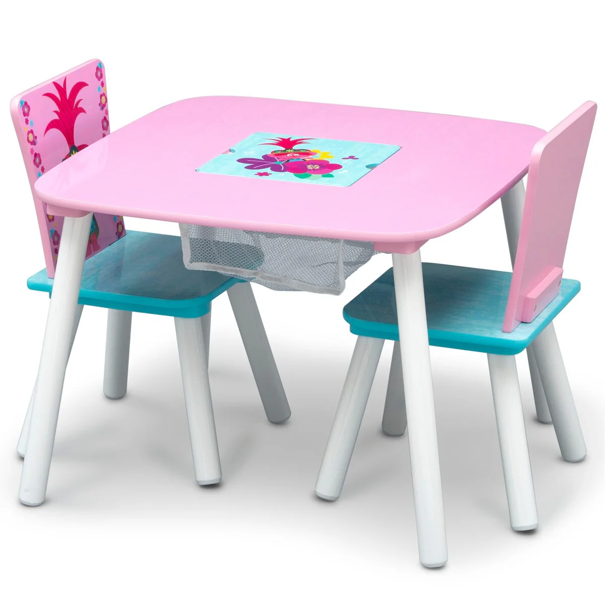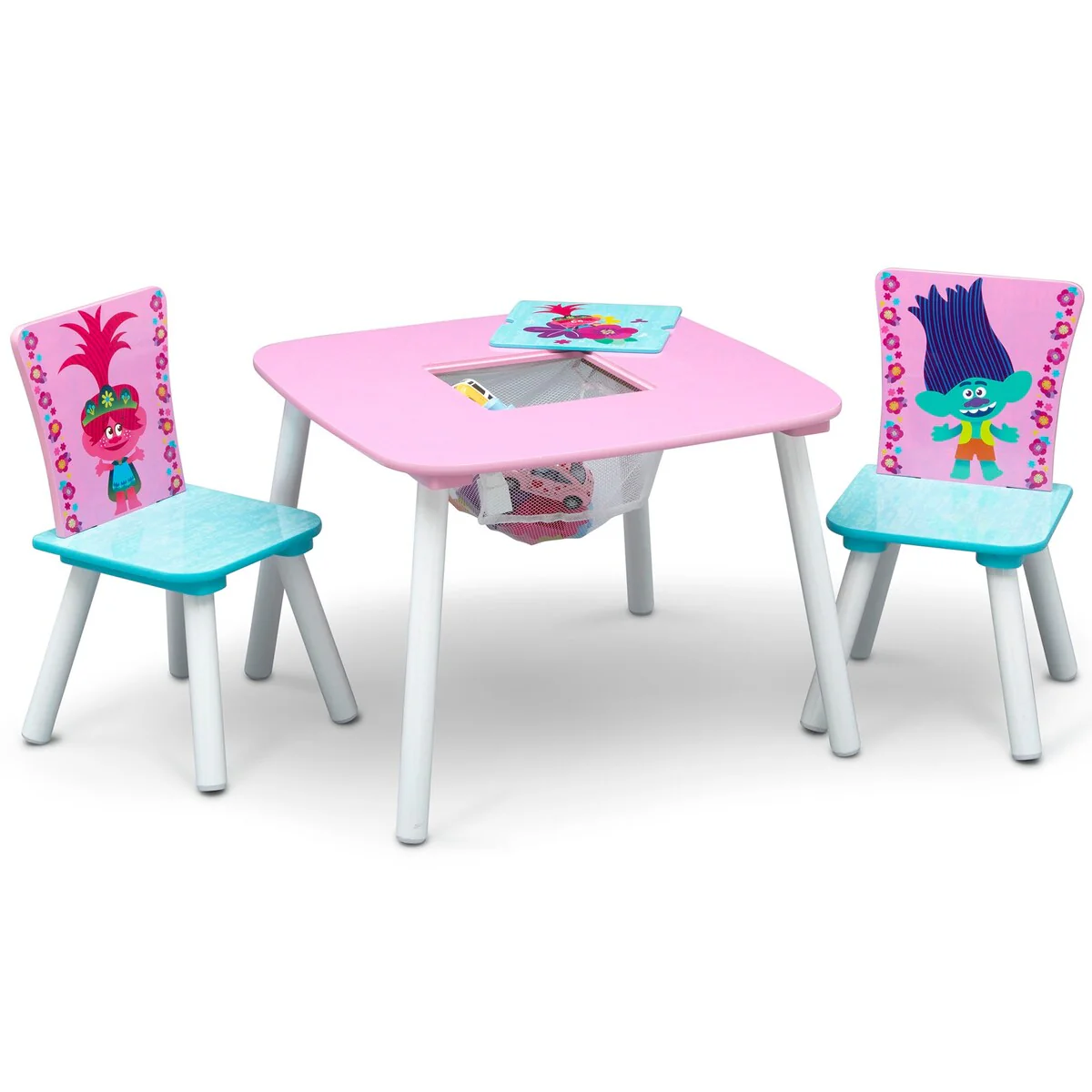 This Trolls World Tour Table and Chair Set with Storage by Delta Children is full of hair-raising details. Featuring colorful graphics of Poppy and Branch, this table and chair set will inspire little ones to drum up some fun. The set includes a table and two chairs, designed at the perfect kid-sized height, making it ideal for snack time, playtime or homework. Plus, a built-in storage compartment at the center of the table is the perfect space to keep art supplies or toys. About Trolls: Known for their crazy, colorful, and magical hair, the DreamWorks Trolls are the happiest, most joyous creatures ever to burst into song. In Trolls World Tour, Poppy and Branch discover six other Troll tribes that are scattered across different lands and are devoted to six different types of music: Funk, Country, Techno, Classic, Pop and Rock. • What's Included: Set includes one table and two chairs • Age Range: Recommended for toddlers and kids ages 3+ | Each chair holds up to 50 lbs. • For the Trolls Fan: This kids table and chair set features colorful graphics of Poppy and Branch • Tons of Storage: Table features handy toy keep in the center for easy storage of makers, crayons and more | Durable Construction: Made of engineered wood and solid wood | Scratch-resistant finish protects the table's colorful graphics | Easy assembly • We Put Your Child's Safety First: Meets or exceeds all safety standards set by the CPSC | Size: Assembled dimensions: 24'L x 24'W x 17.72'H