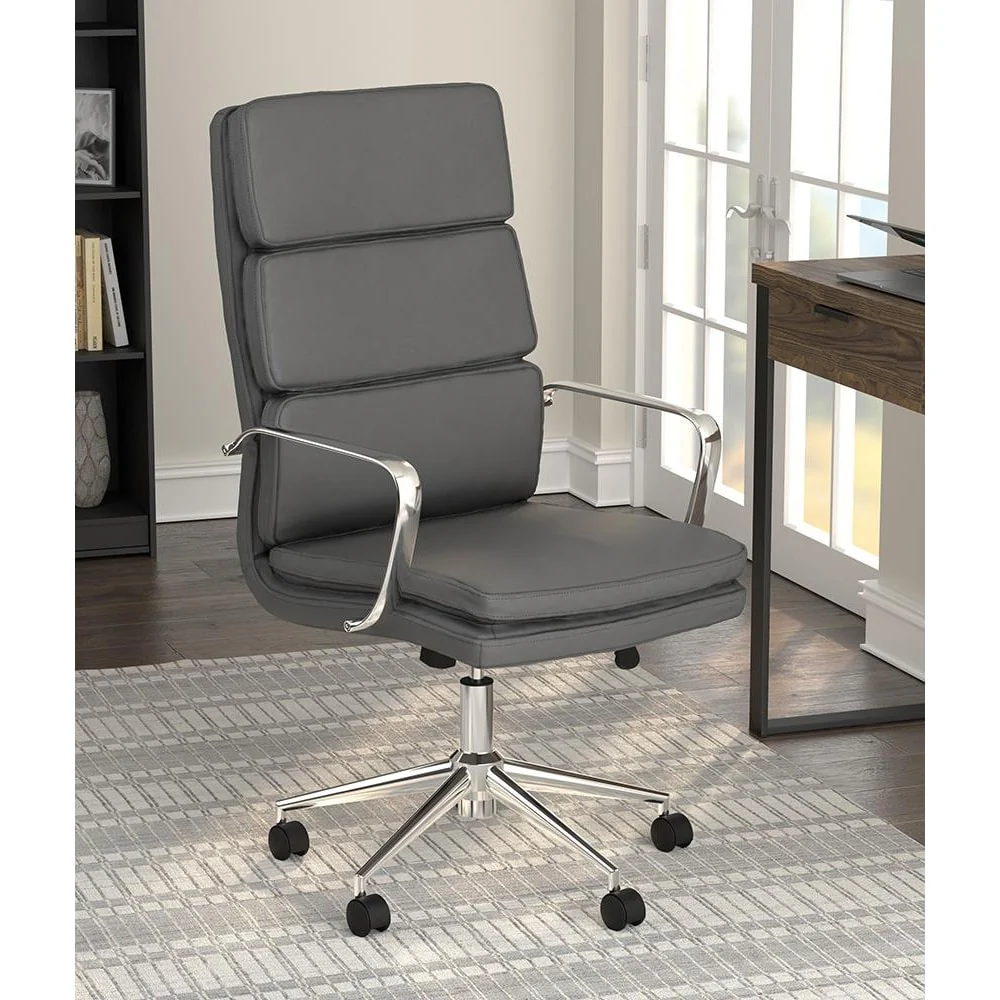 This modern office chair combines style and comfort, featuring horizontal stitching on the seat back for a visually appealing design. Its ergonomically contoured back offers excellent support, promoting good posture and reducing fatigue during long worksessions. With adjustable height and armrests for added support, it's the perfect addition to any workspace.