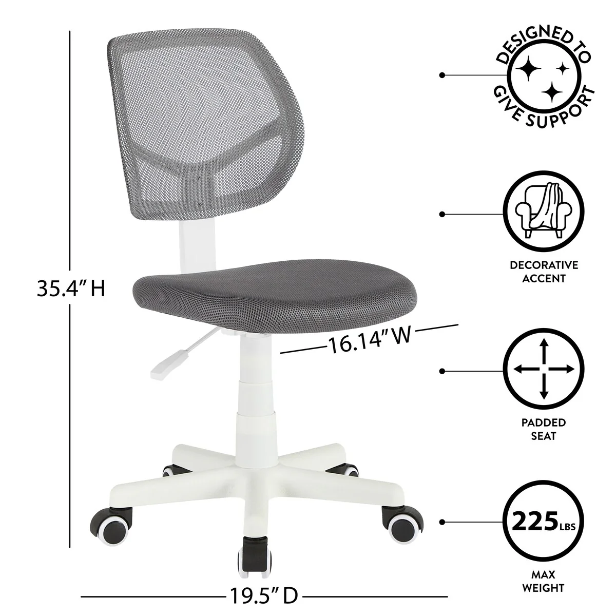 Work more comfortably with the Urban Lifestyle Swivel Mesh Rolling Chair. Suitable for the home or office, it features a mesh back and a padded upholstered cushion. The mesh backrest will keep your back cool and it tilts to a relaxing position. The mesh backrest Is breathable allowing air to circulate to keep you comfortable. This Swivel Office Chair can be adjusted to your preferred height with its easy-to-use lever and pneumatic system. A swivel base means you can easily move around while you are seated and wheel casters ensure mobility. With its adjustable height and comfortable cushion this computer chair is good for studying in your dorm or working at your desk in your home office. This task mesh chair measures 16.14'W x 19.5'D x 35.4'H,making it perfect for kids, teens and adults of any age to use. Suitable for home, offices, dorms, student desks or as an accent chair. Chair supports up to 225 lbs. This item is easy to assemble and is available in various colors.