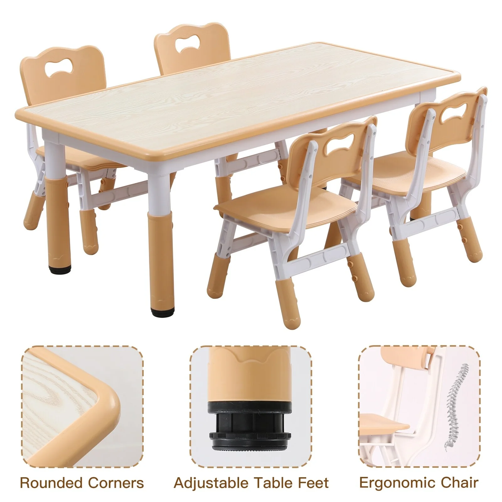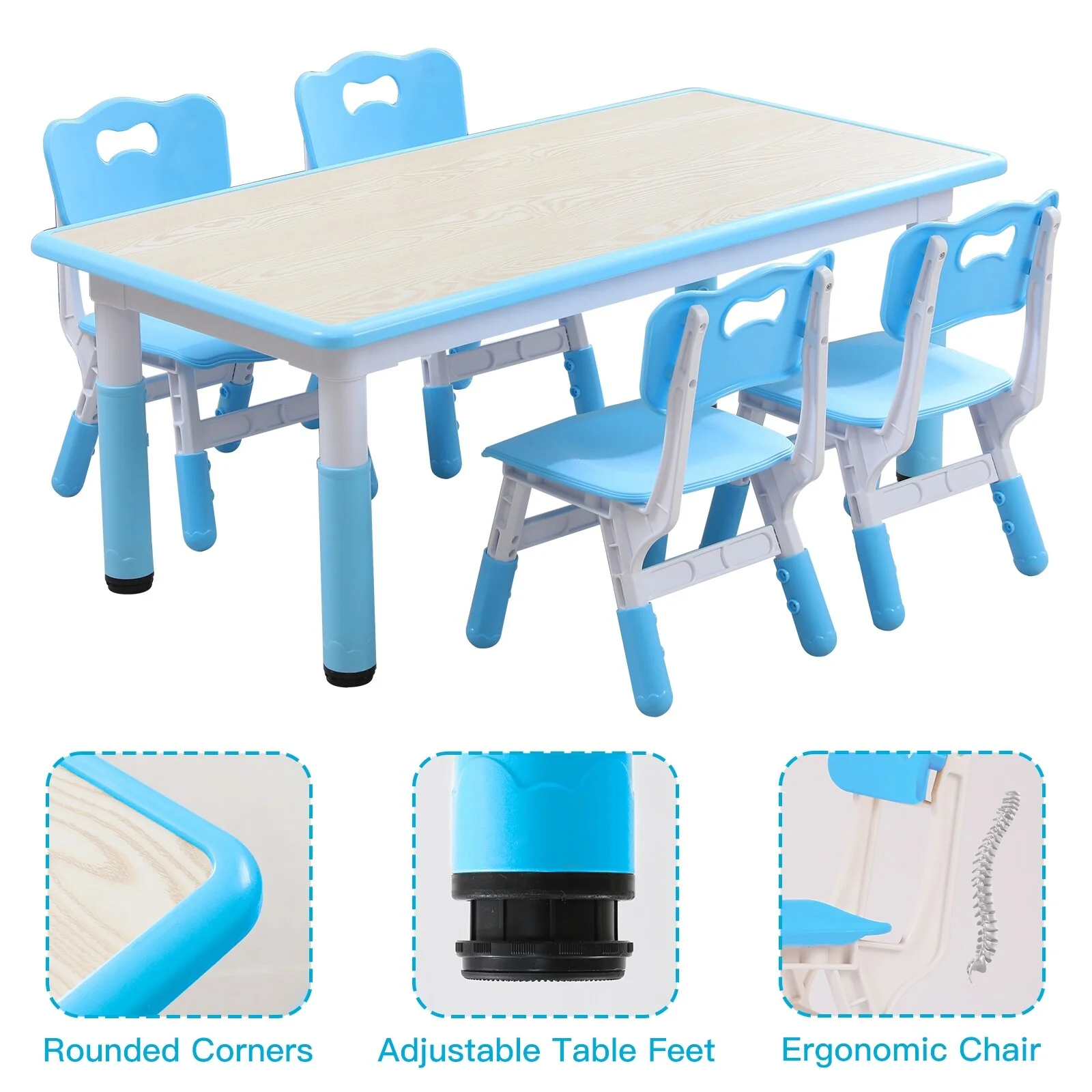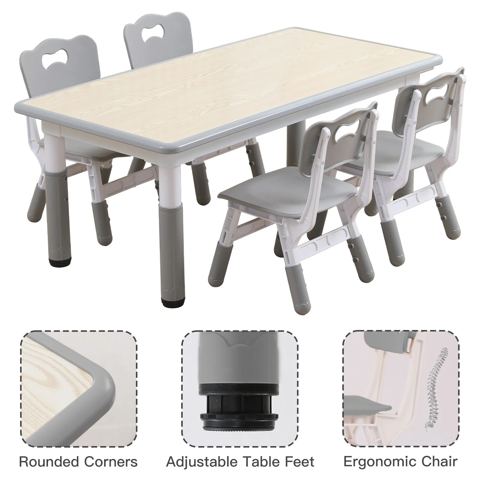 4. Ergonomic Design: Designed with ergonomics in mind, this set promotes healthy sitting posture, protecting your child's spine. The table and chair legs feature non-slip rubber caps for added stability.
