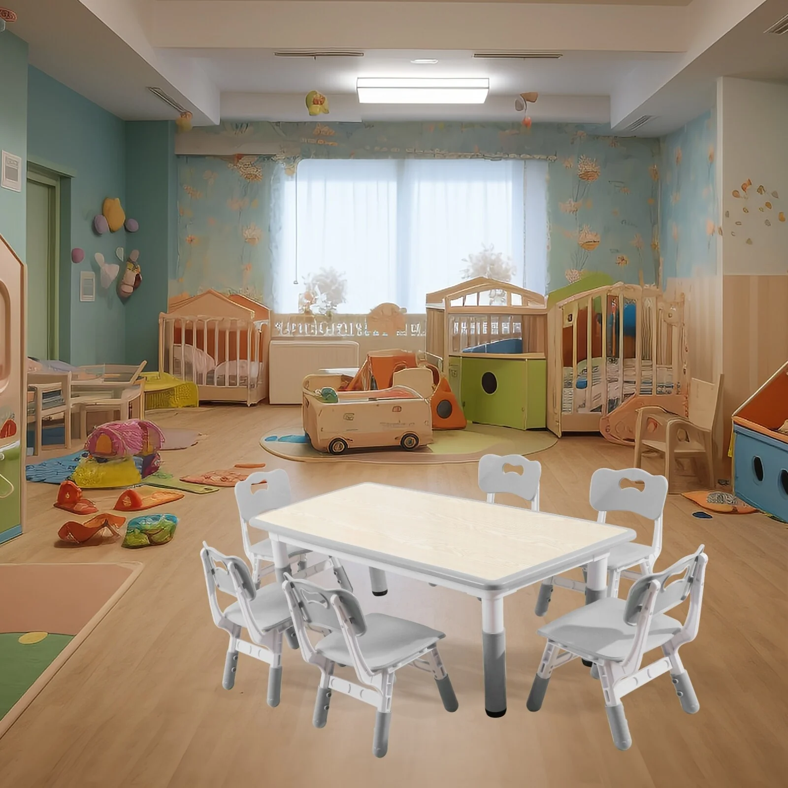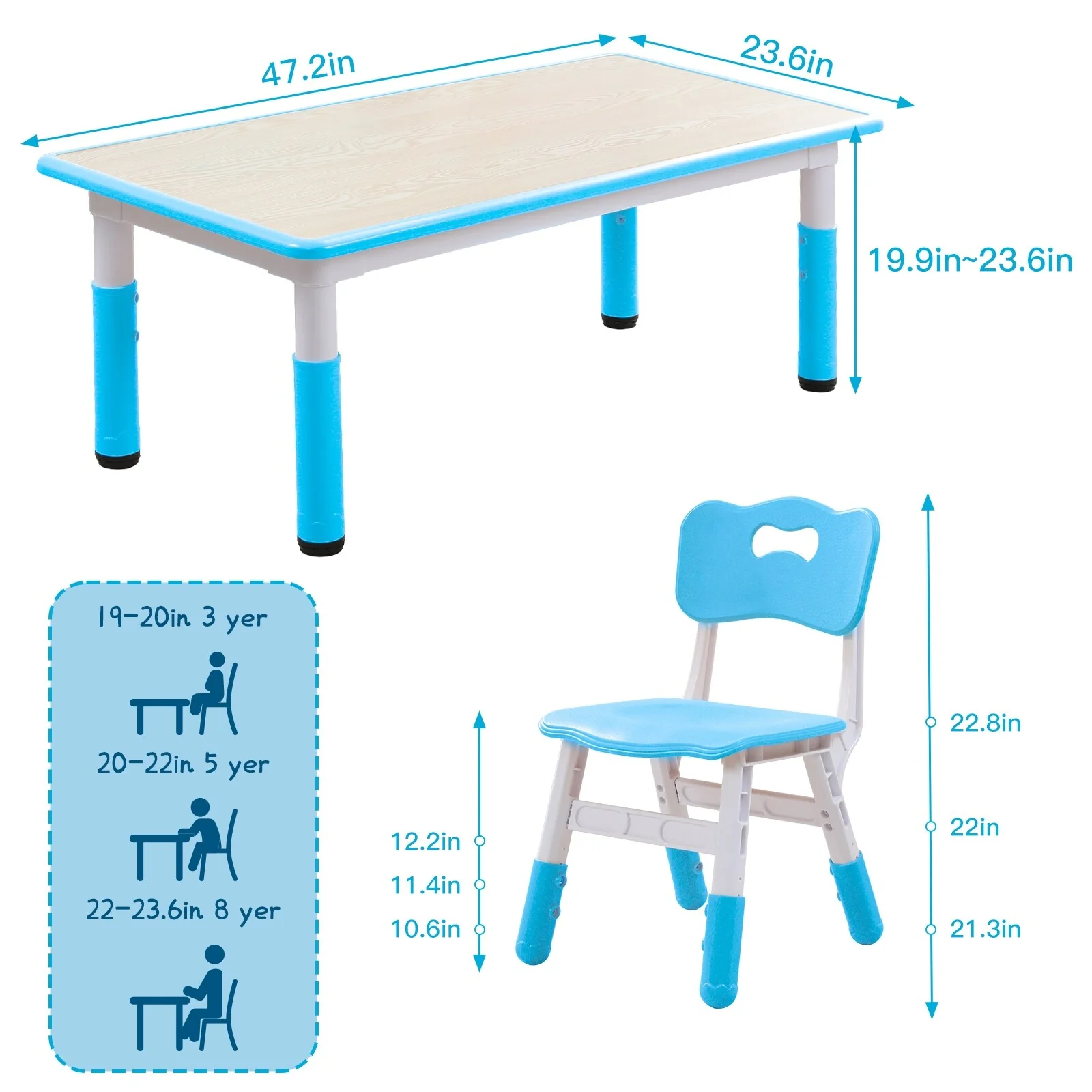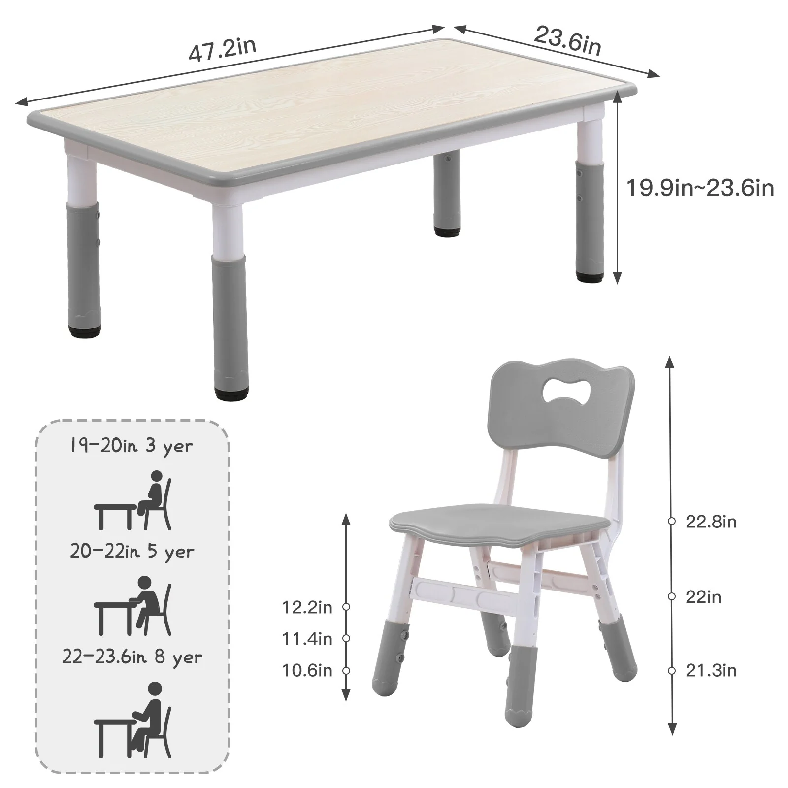 2. Designed for Growing Kids: The table offers five adjustable height options ranging from 18.9 to 23.6 inches, while the chairs feature three height adjustments from 20.8 to 22.4 inches. The table legs also come with horizontal sliding features for added convenience.