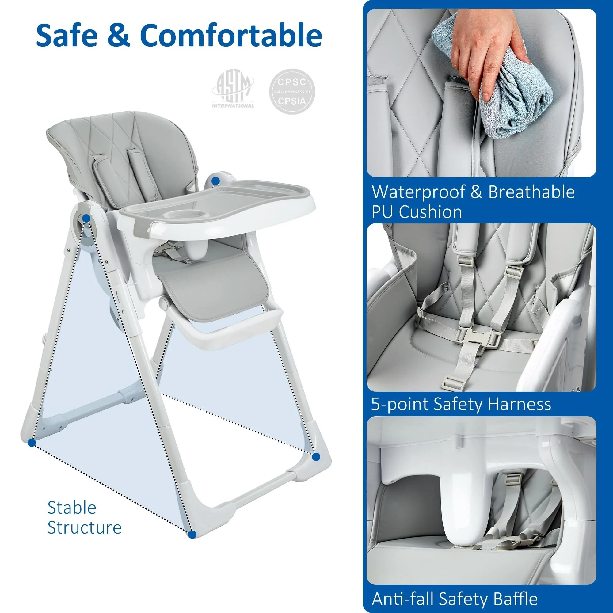 【Easy to Clean】The tray can be removed for dishwasher cleaning, while the smooth, PU seat easily wipes clean with a wet cloth. There are no nooks and crannies to hide food, making a parent's job easier.