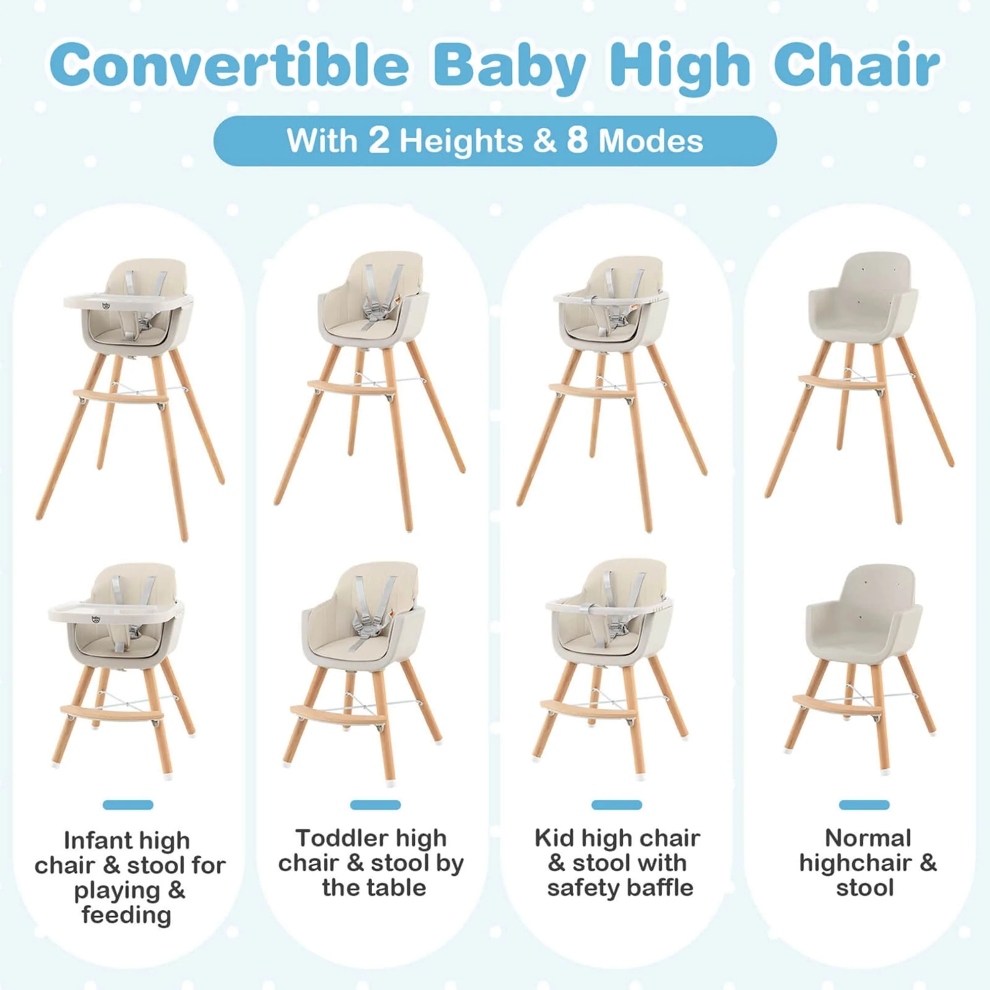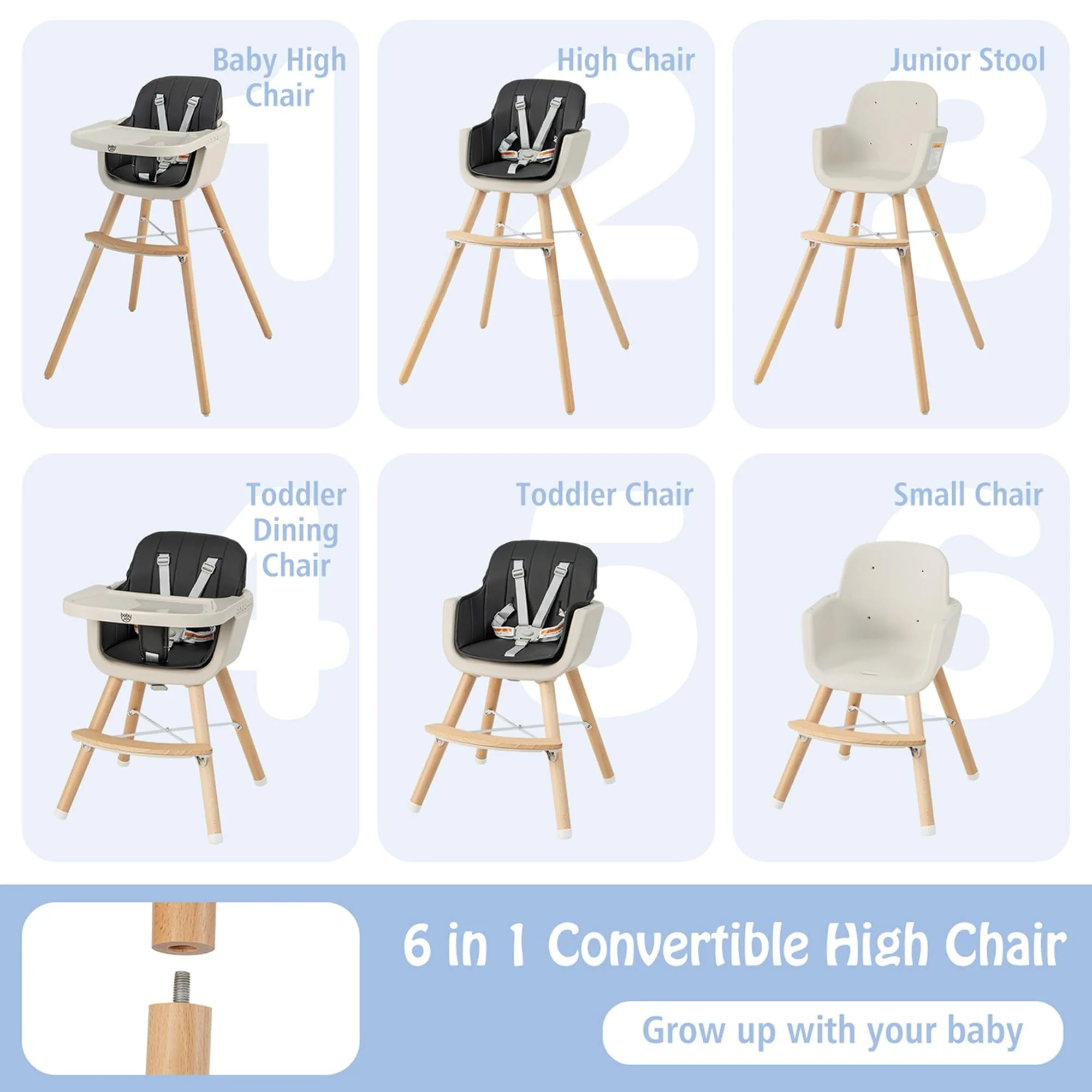 With a detachable and adjustable large tray, it can give your baby a good place to eat, play, learn. The 3 in 1 versatile design allows our high chair to be switched to three different shapes to meet the baby's needs at different ages. Moreover, made of safe and sturdy materials, the quality of the chair is reliable. The five-point seat belt also can effectively prevent your baby from falling out of the chair due to climbing.