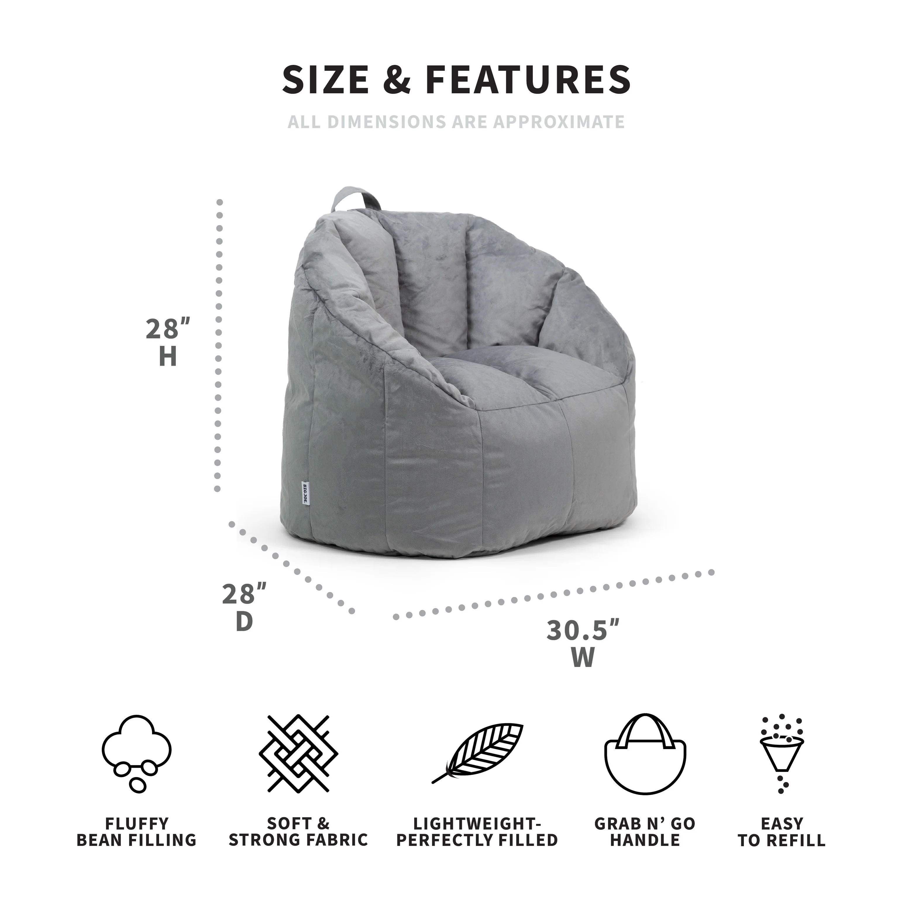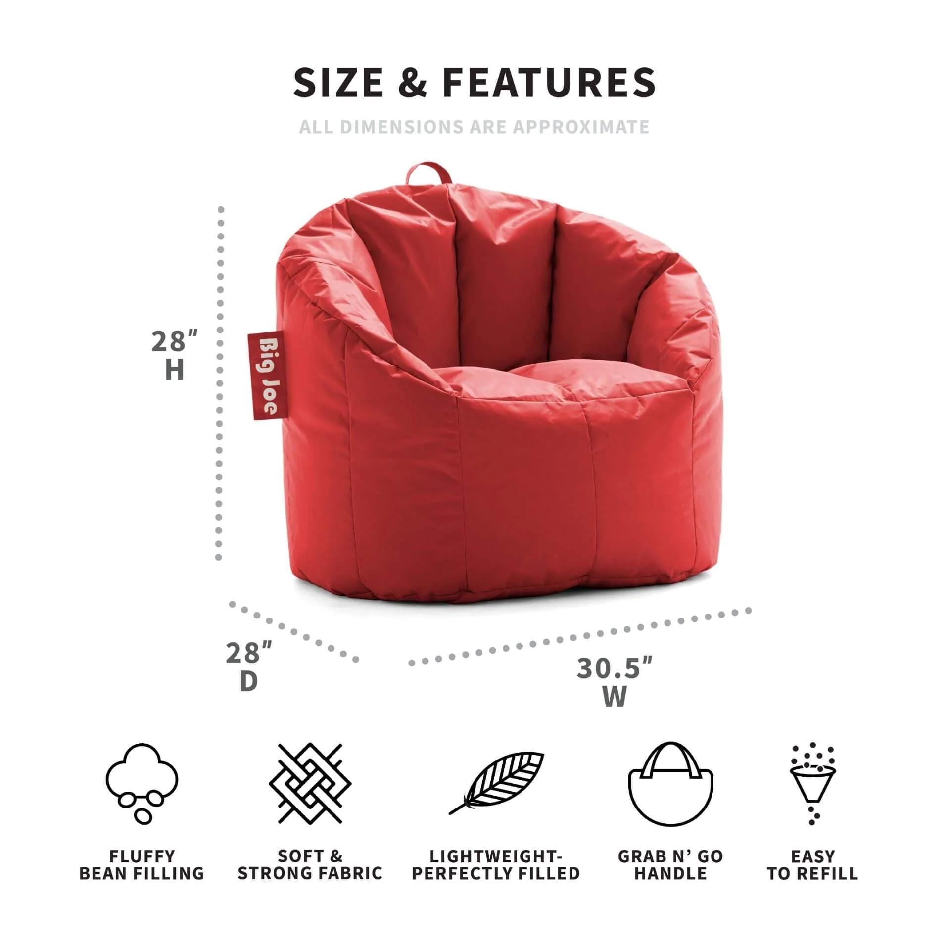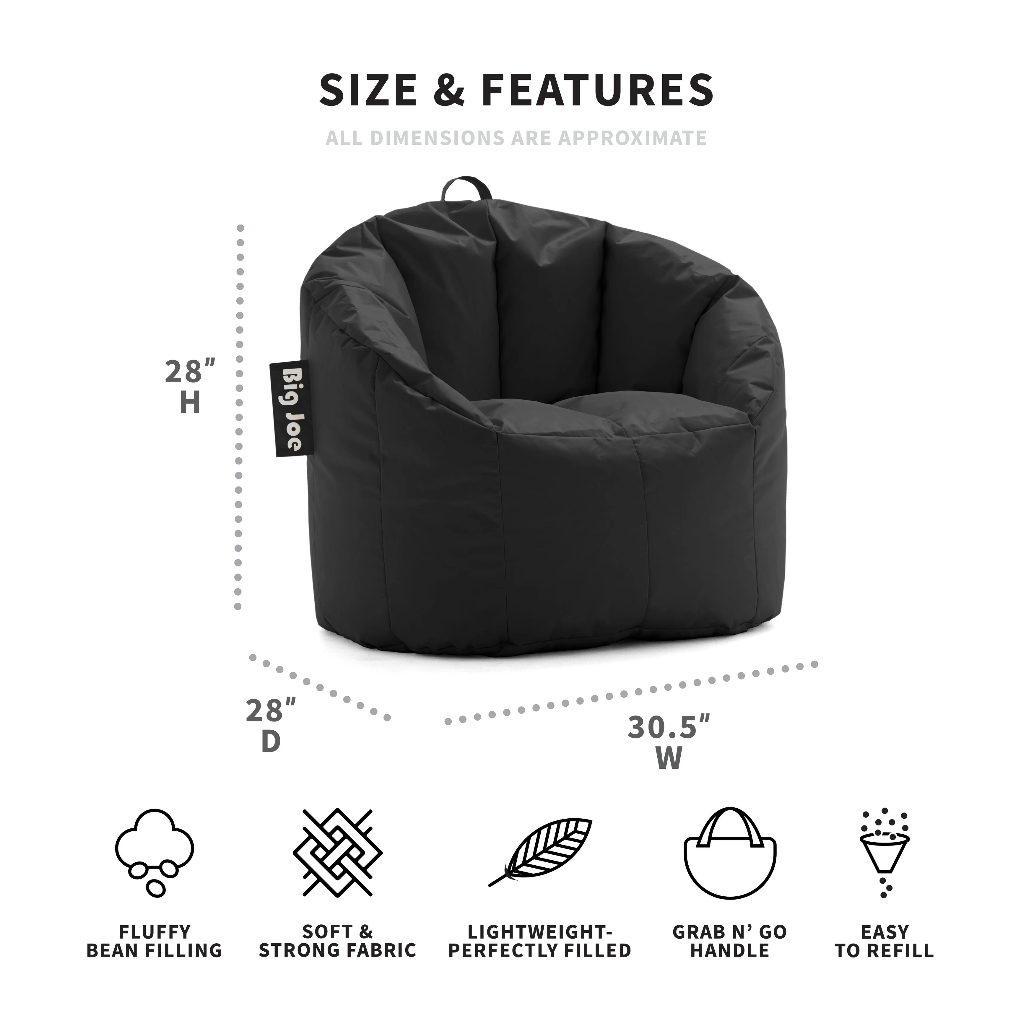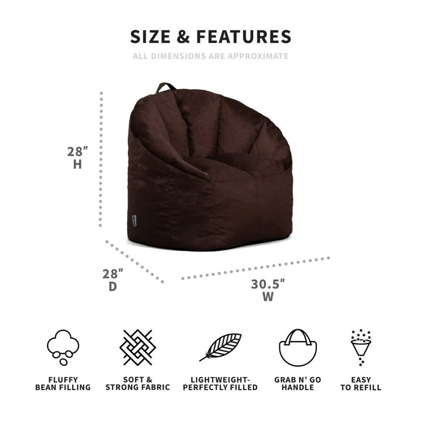 Who knew bean bag chairs could be structured AND incredibly comfy? Say hello to the awesome blend of style and cozy that is the Milano, available in durable and soft SmartMax or Plush fabric. Reinforced stitching on the arms, sides, and back and filled with the perfect amount of fluffy beans, you'll love adding this chair to your den, living room, play room, and more! And, bean refill bags are sold separately so you can give it a pick-me-up whenever needed, since all well-loved bean bags compress over time. For child safety and durability reasons, we intentionally break off the outside zipper pull before shipment. If you need to open your bag, simply use a paperclip to pull it open. Detailed instructions can be found on the warning label attached to your Big Joe. The cover is not removable, but may be spot cleaned as needed.