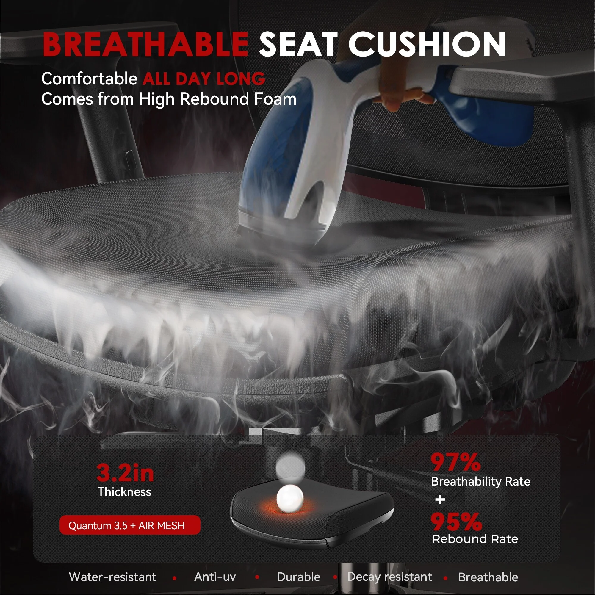 - MOST COMFORTABLE BIG ERGONOMIC CHAIR: The seat cushion of our office chairs for heavy people is 30% larger than other office chairs. 8cm high elastic type cotton cushion, reduces the pressure on the hip and thighs, offers lasting comfort all day, will not collapse after prolonged use. Breathable mesh back keeps you cool all summer long. Pull out the footrest, the ergonomic office chair can be your space to relax