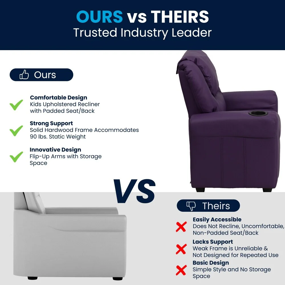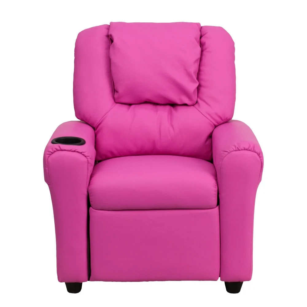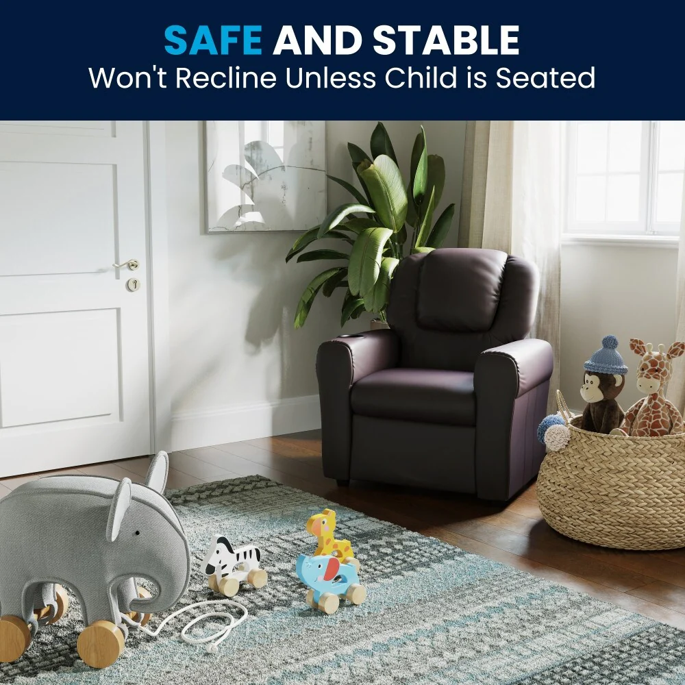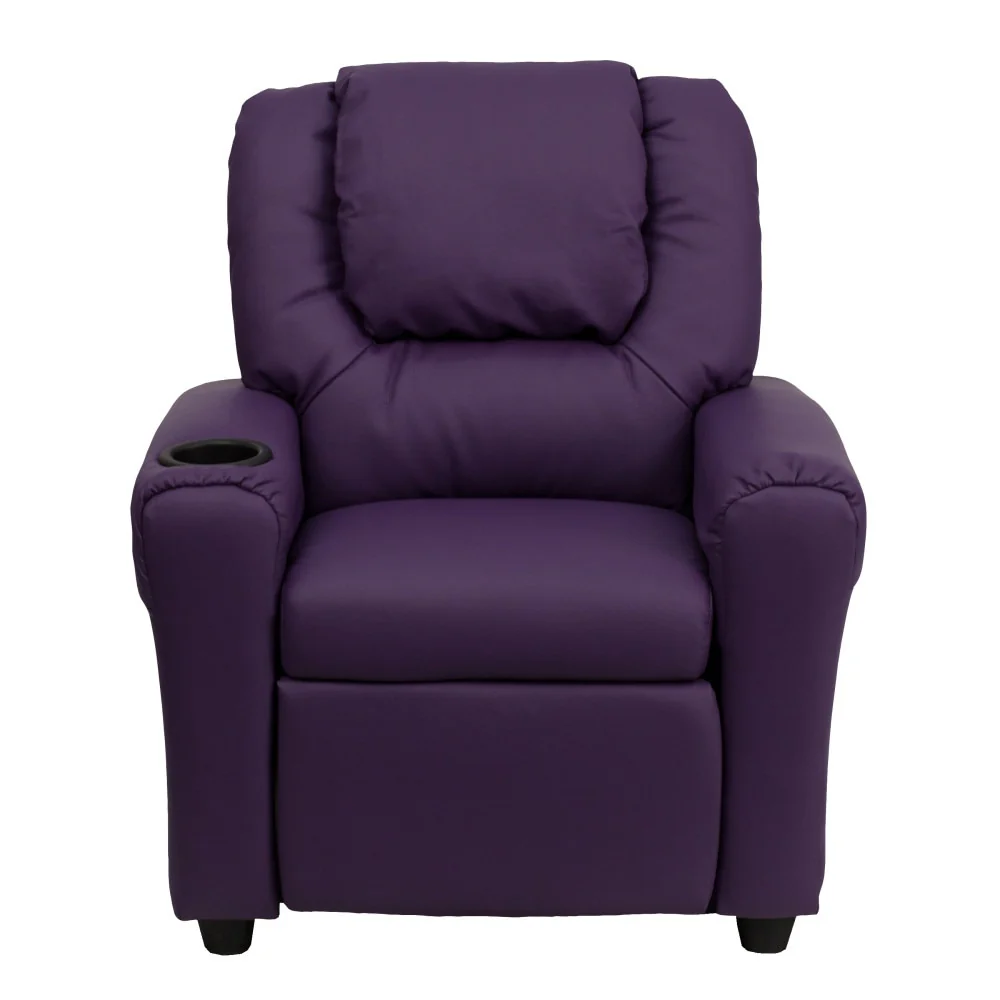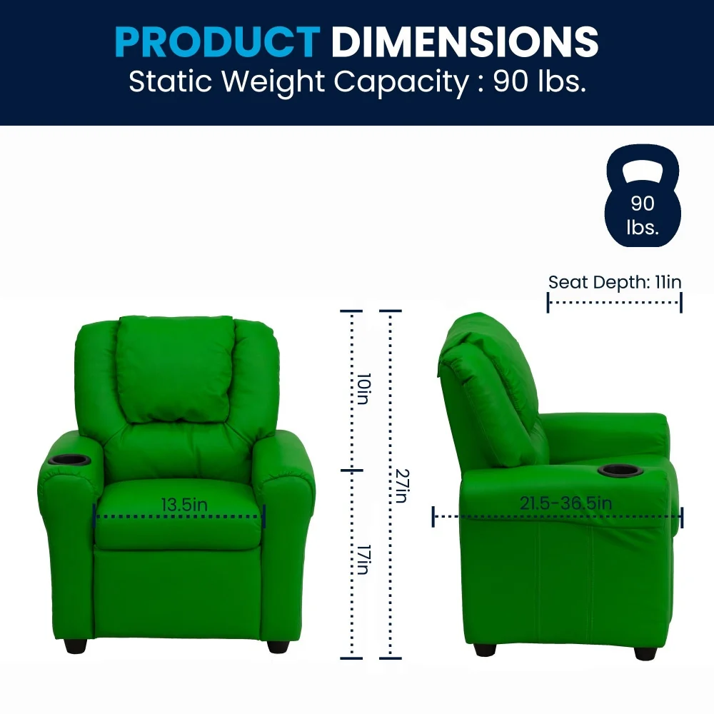 Get your kids their own comfy seating with this Contemporary Kids Recliner with Cup Holder and Headrest. Perfectly sized for young ones, this push back recliner is ideal for their living room, bedroom or playroom. Your little ones can sit comfortably on the plush back and seat upholstered with fire retardant foam, while also having their favorite beverage at arm's reach with the built-in cup holder. Cleanup is easy with the durable vinyl upholstery. With a solid hardwood frame construction, this chair can hold up to 90 pounds and includes a safety feature ensuring that the recliner will not function unless the child is in a seated position. This child-sized recliner is a great addition to your home and comes in multiple colors to fit any decor.