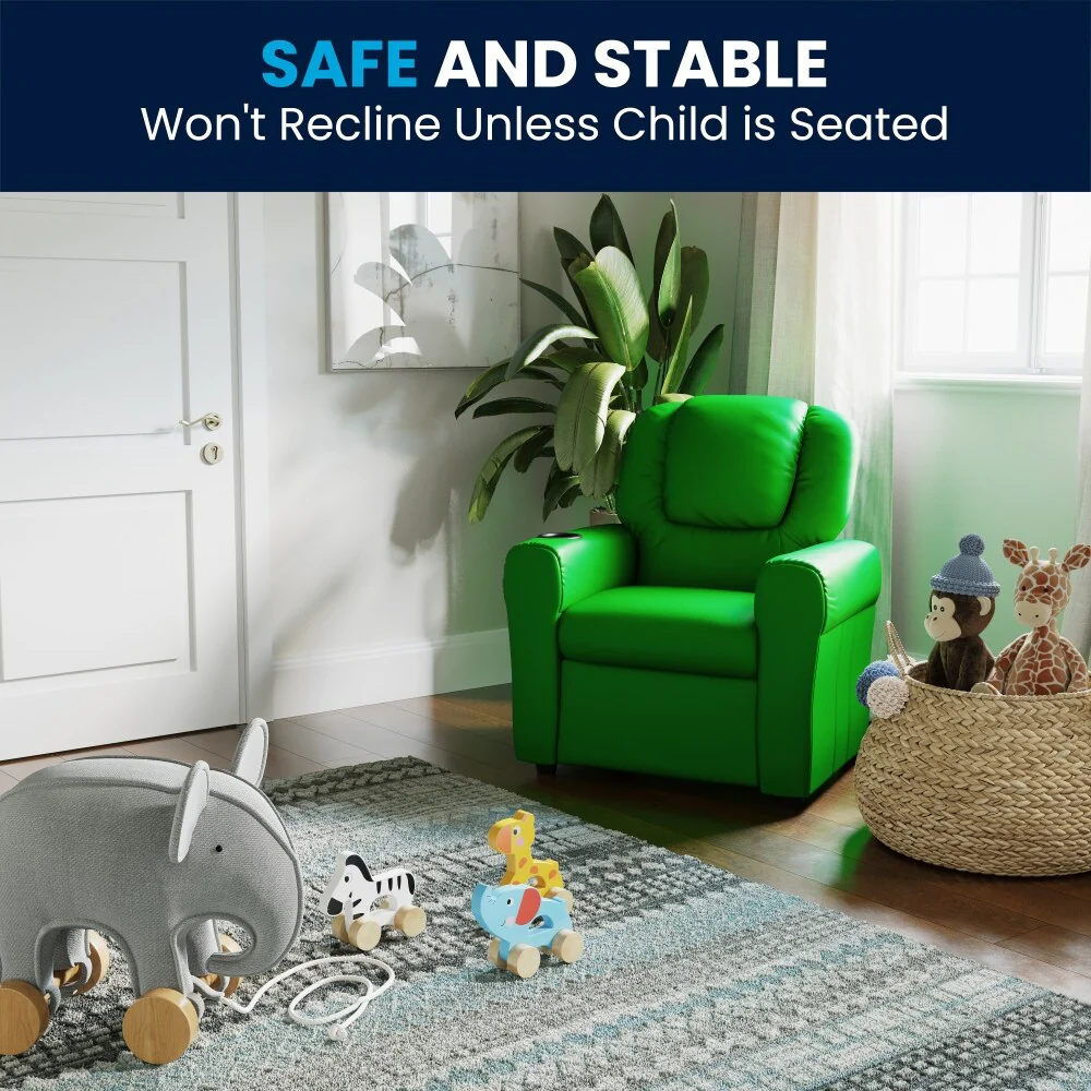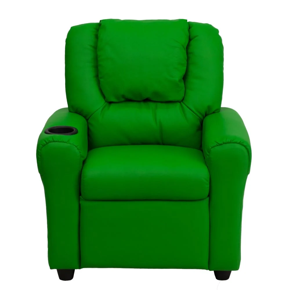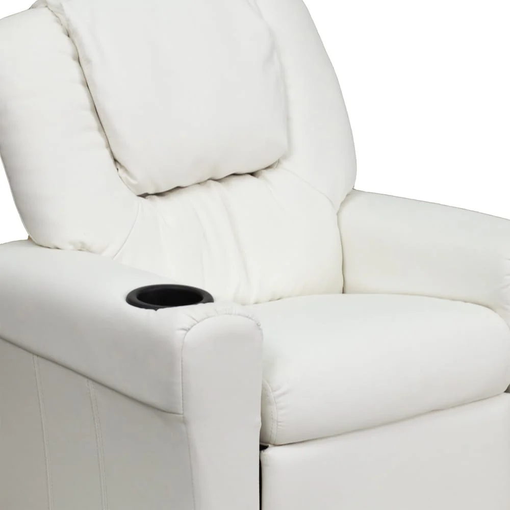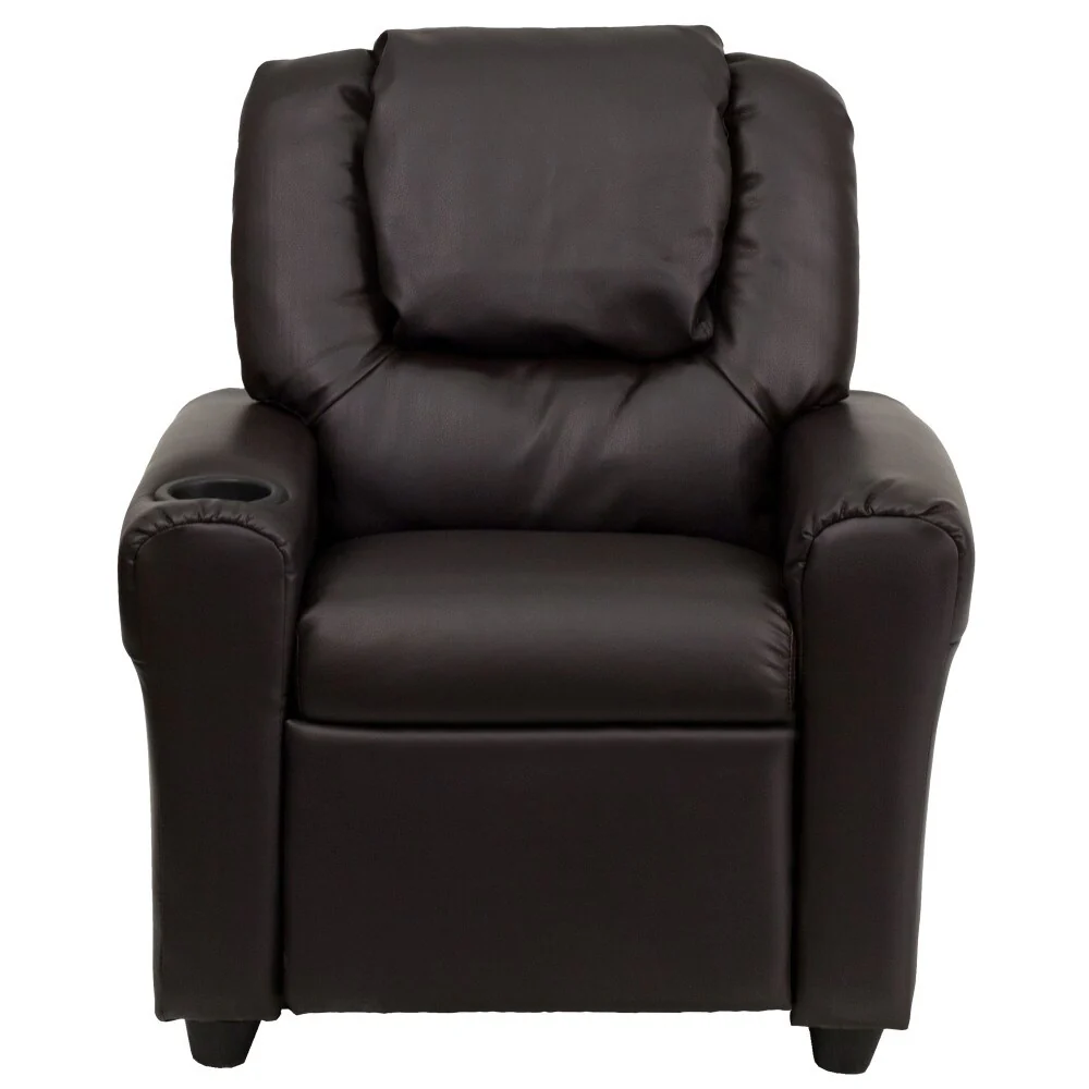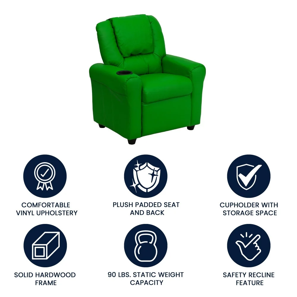 Get your kids their own comfy seating with this Contemporary Kids Recliner with Cup Holder and Headrest. Perfectly sized for young ones, this push back recliner is ideal for their living room, bedroom or playroom. Your little ones can sit comfortably on the plush back and seat upholstered with fire retardant foam, while also having their favorite beverage at arm's reach with the built-in cup holder. Cleanup is easy with the durable vinyl upholstery. With a solid hardwood frame construction, this chair can hold up to 90 pounds and includes a safety feature ensuring that the recliner will not function unless the child is in a seated position. This child-sized recliner is a great addition to your home and comes in multiple colors to fit any decor.