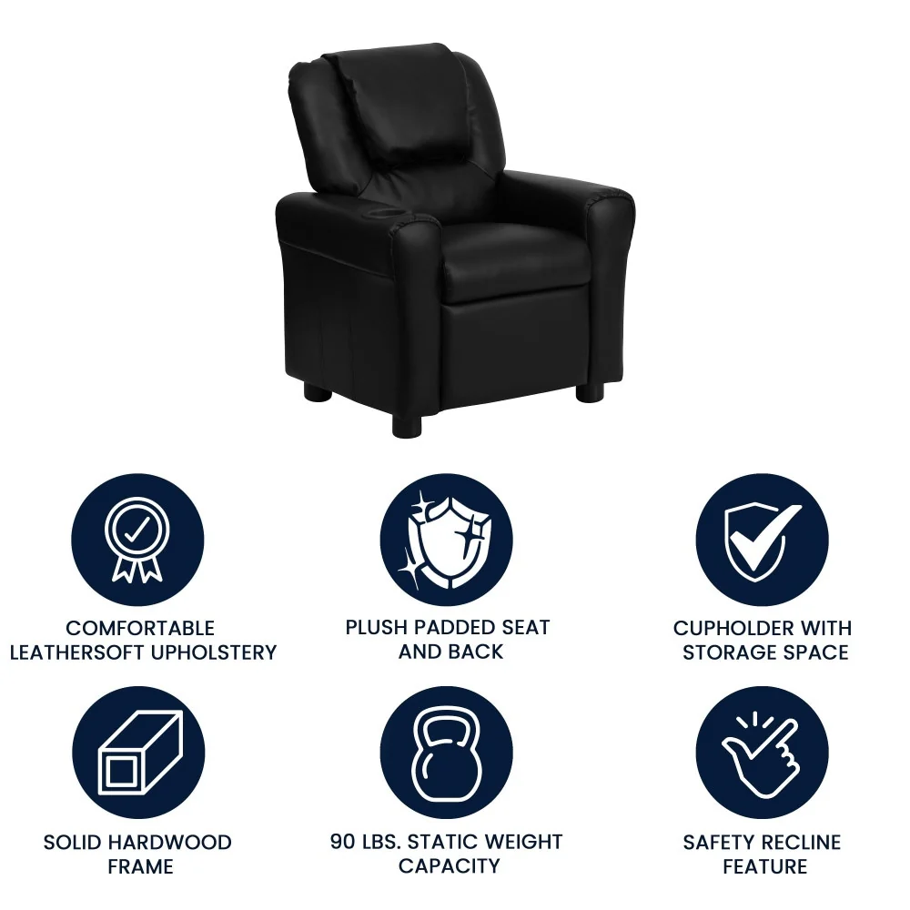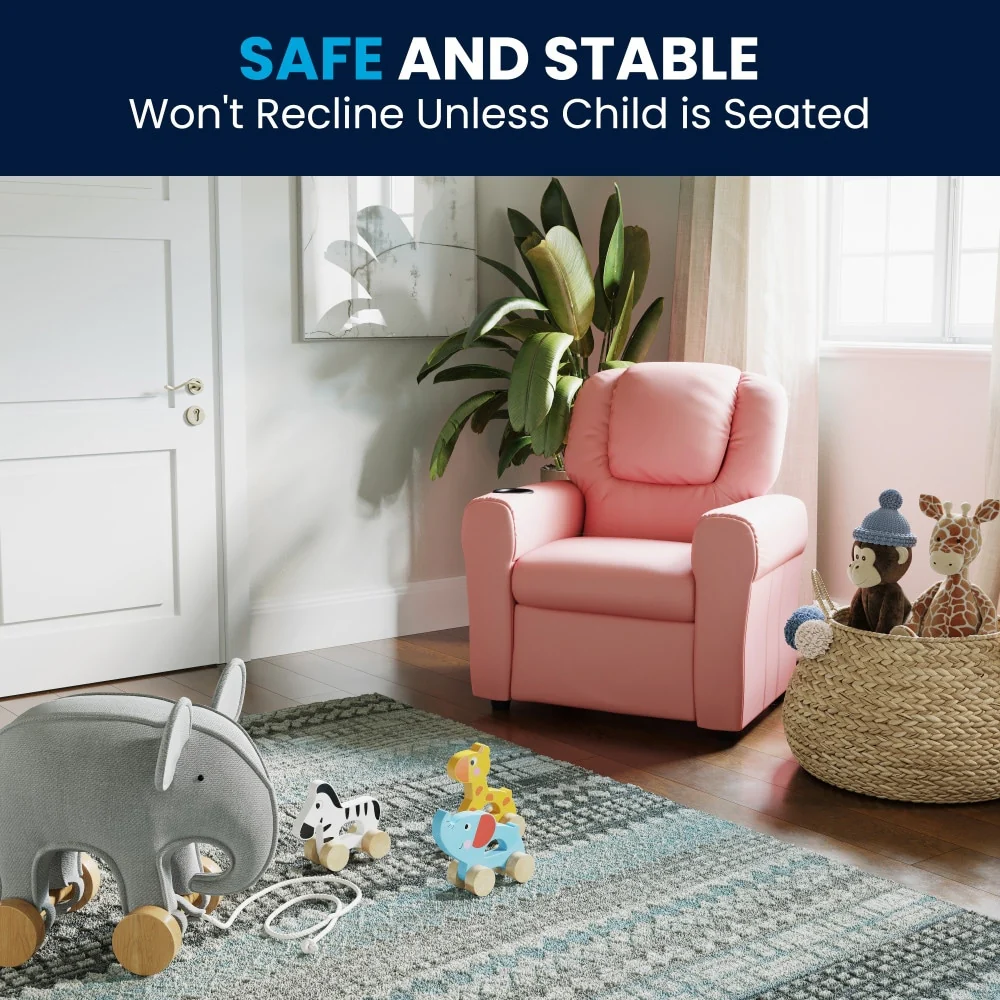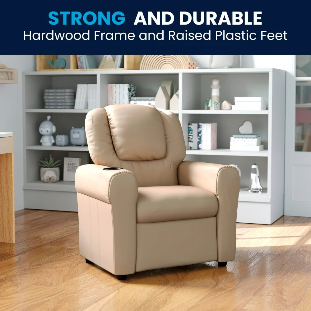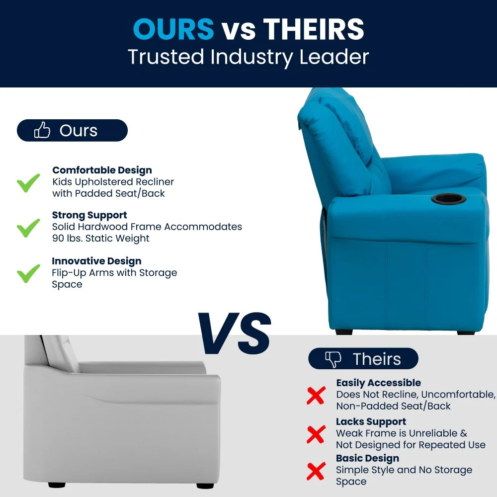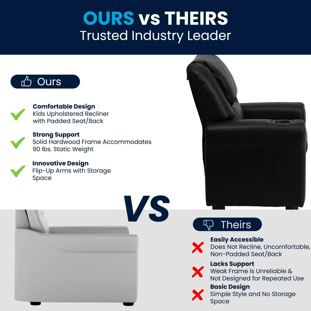 Get your kids their own comfy seating with this Contemporary Kids Recliner with Cup Holder and Headrest. Perfectly sized for young ones, this push back recliner is ideal for their living room, bedroom or playroom. Your little ones can sit comfortably on the plush back and seat upholstered with fire retardant foam, while also having their favorite beverage at arm's reach with the built-in cup holder. Cleanup is easy with the durable vinyl upholstery. With a solid hardwood frame construction, this chair can hold up to 90 pounds and includes a safety feature ensuring that the recliner will not function unless the child is in a seated position. This child-sized recliner is a great addition to your home and comes in multiple colors to fit any decor.