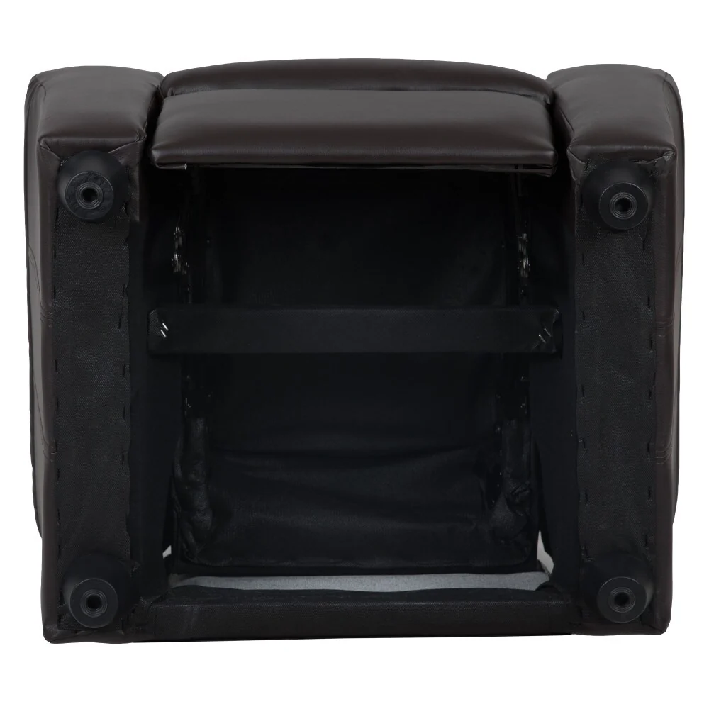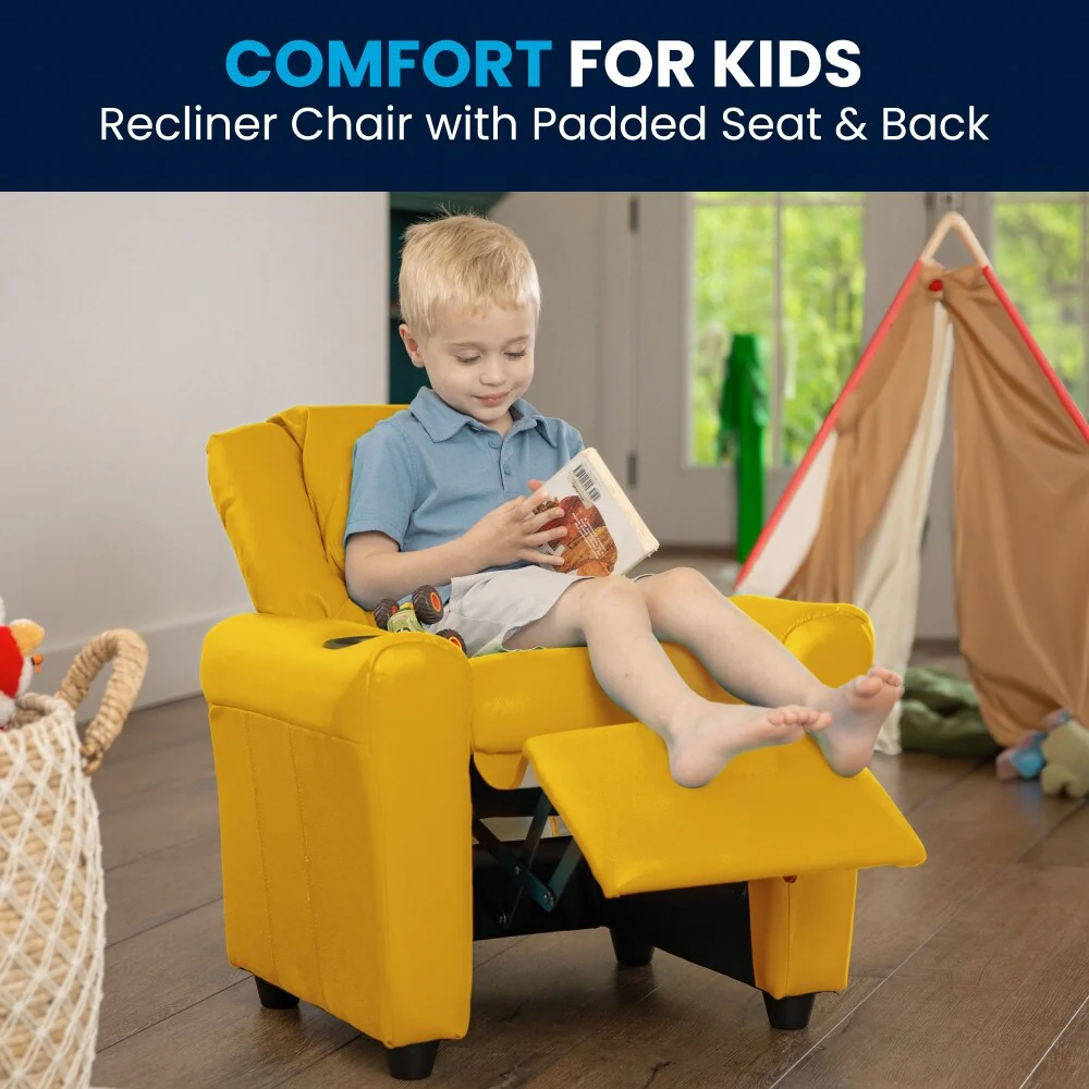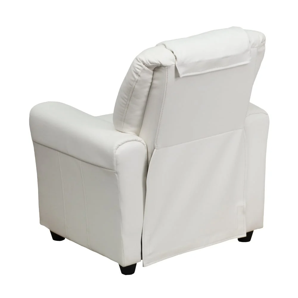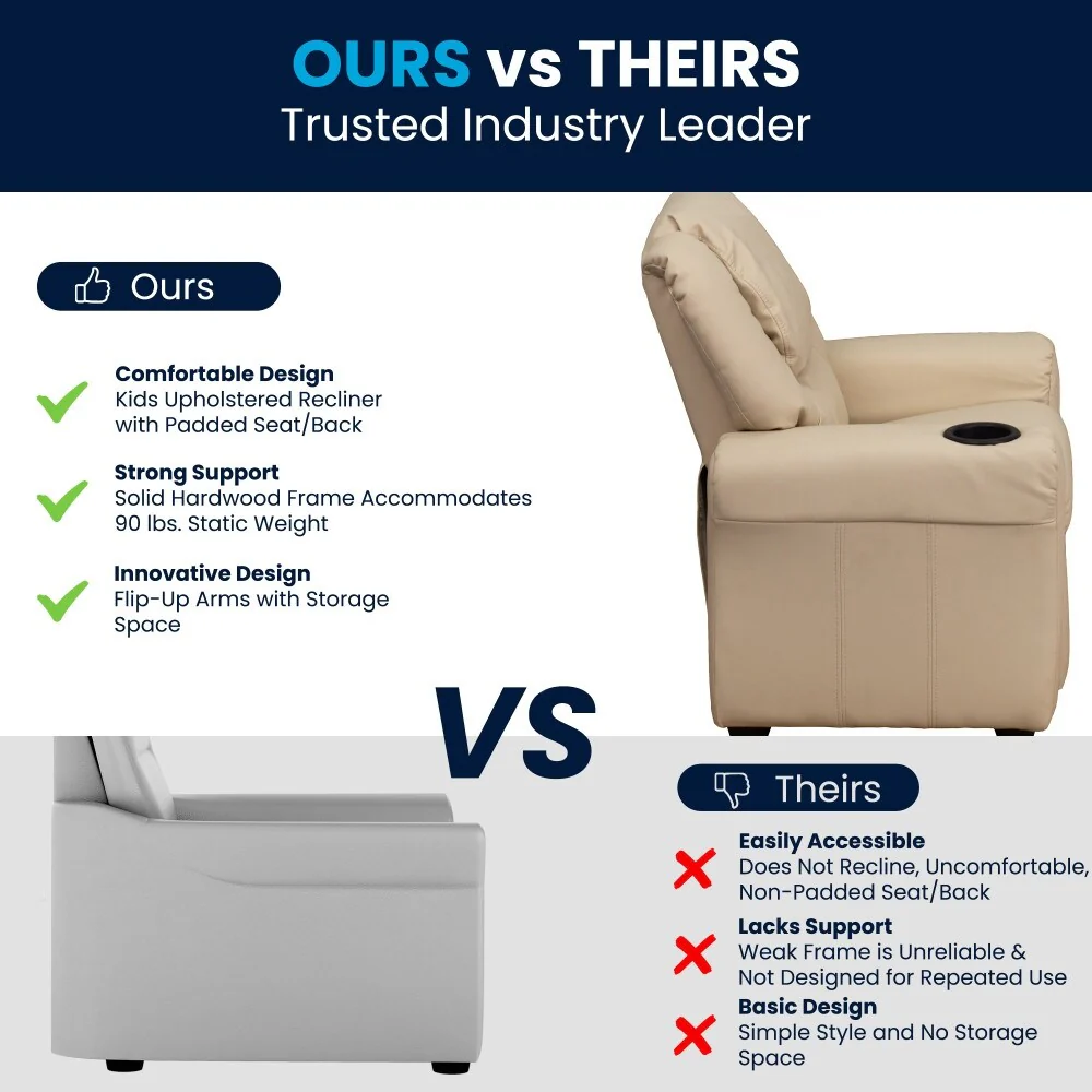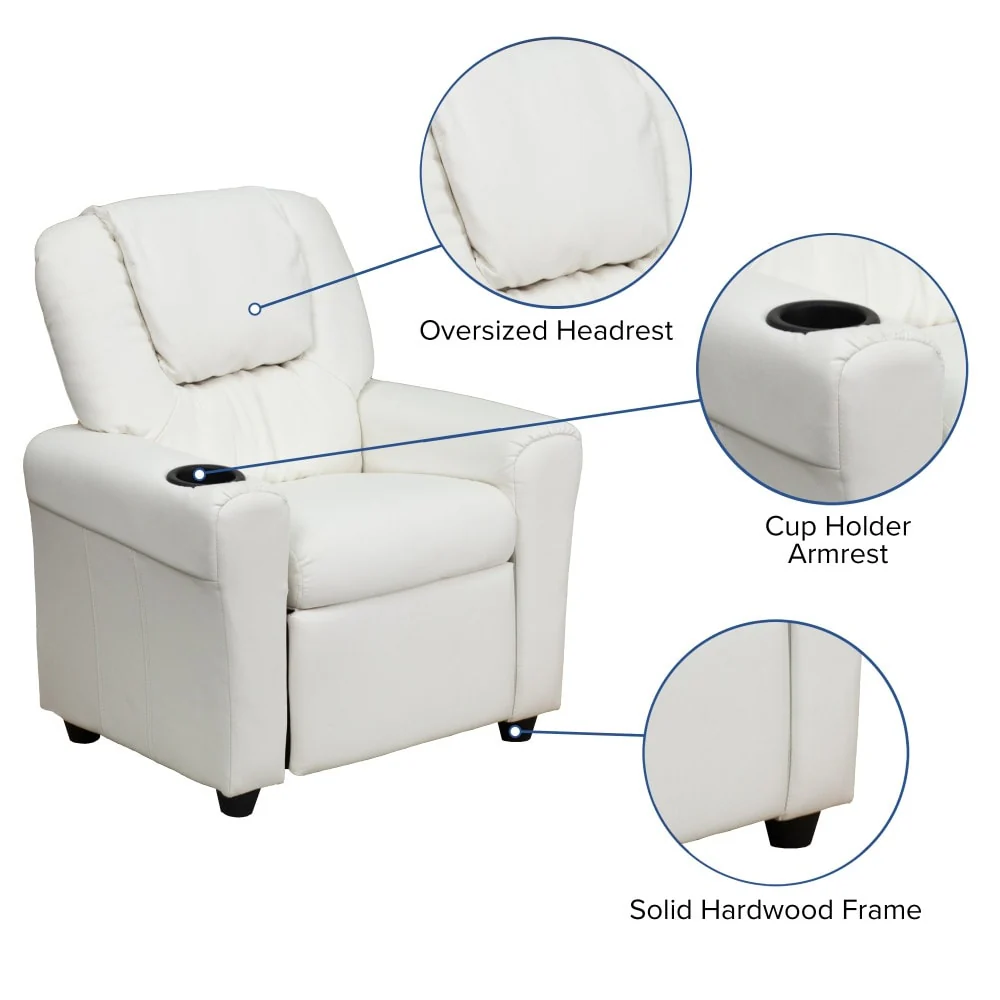 Get your kids their own comfy seating with this Contemporary Kids Recliner with Cup Holder and Headrest. Perfectly sized for young ones, this push back recliner is ideal for their living room, bedroom or playroom. Your little ones can sit comfortably on the plush back and seat upholstered with fire retardant foam, while also having their favorite beverage at arm's reach with the built-in cup holder. Cleanup is easy with the durable vinyl upholstery. With a solid hardwood frame construction, this chair can hold up to 90 pounds and includes a safety feature ensuring that the recliner will not function unless the child is in a seated position. This child-sized recliner is a great addition to your home and comes in multiple colors to fit any decor.