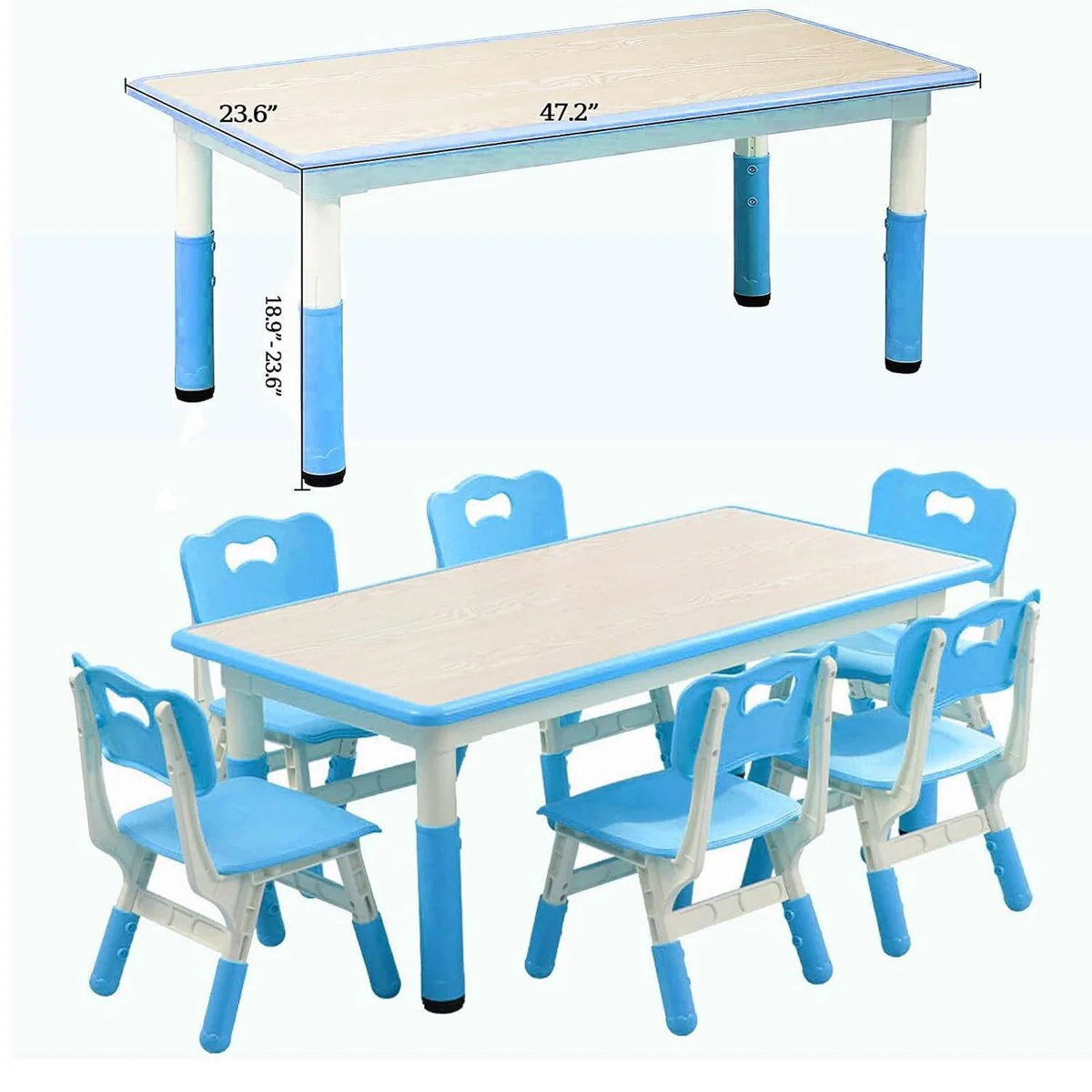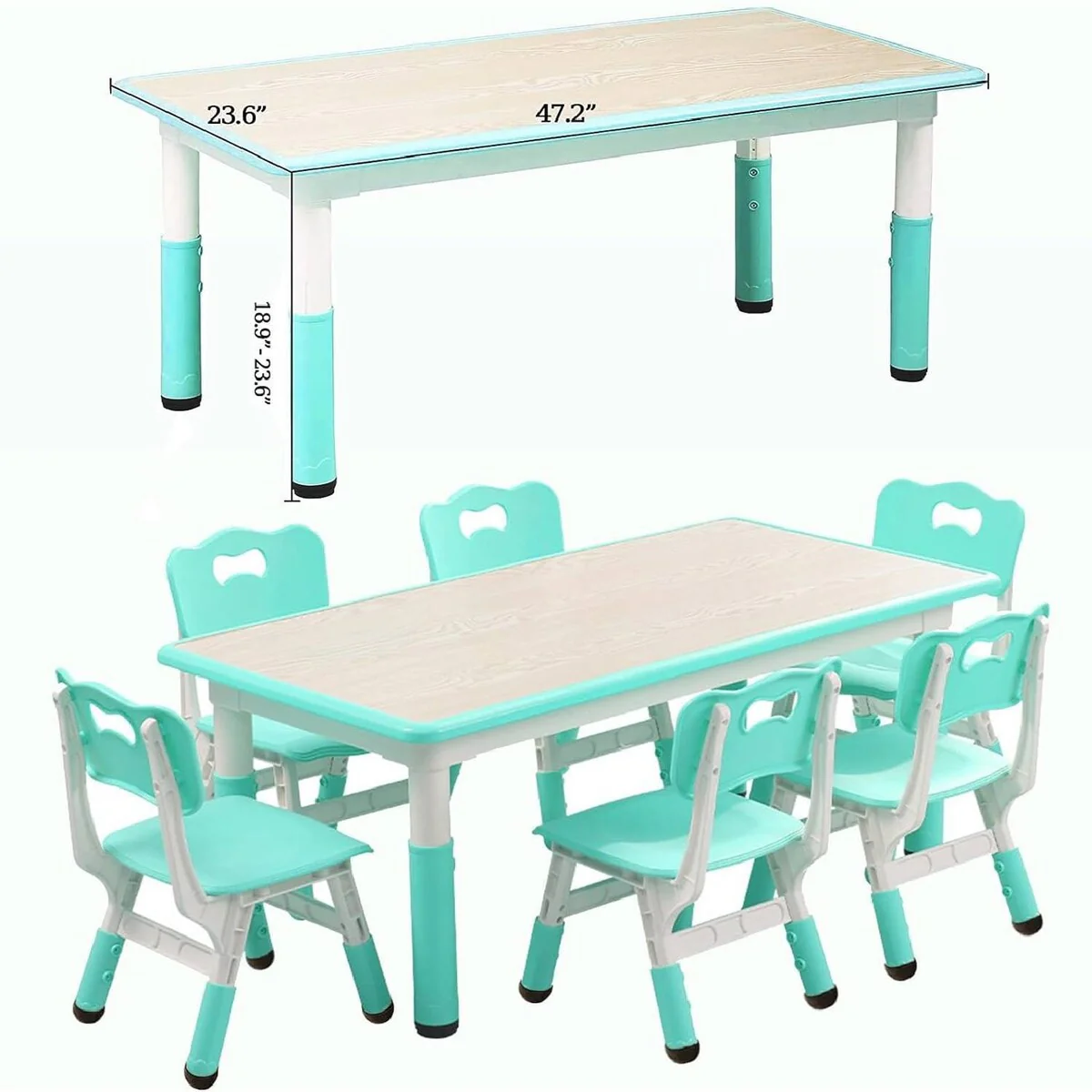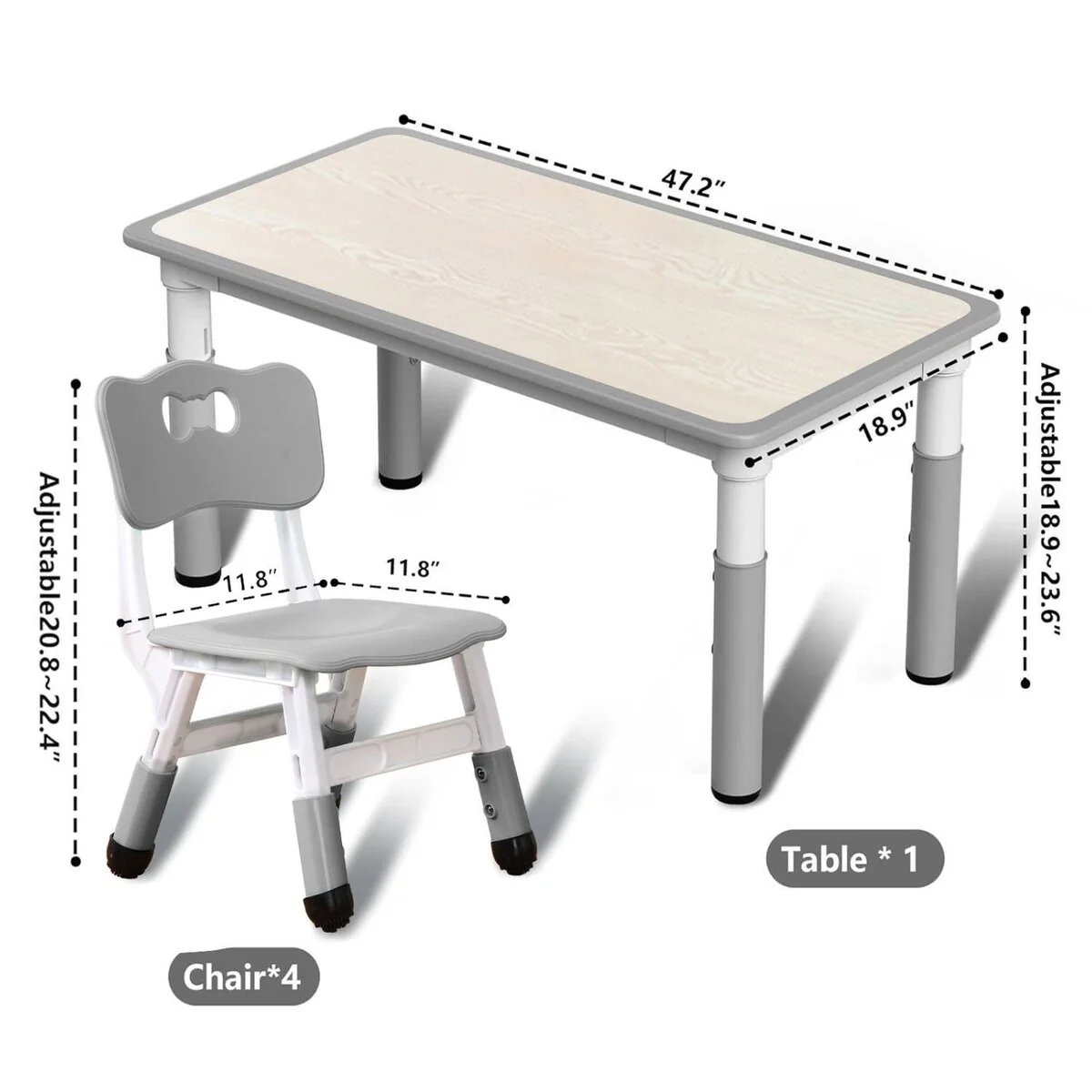 - Adjustable heights for both table (18.9' to 23.6') and chairs (10.6' to 12.2')