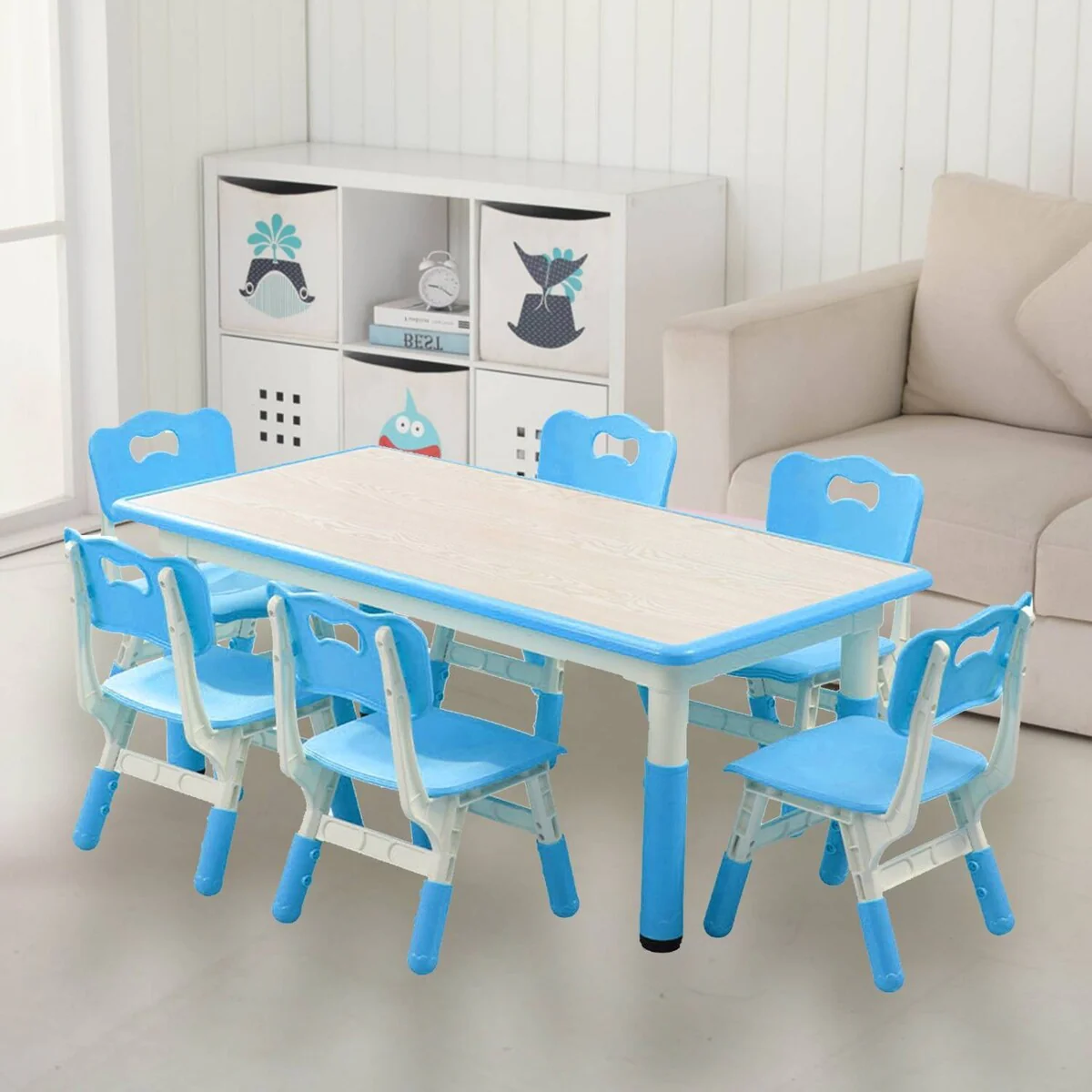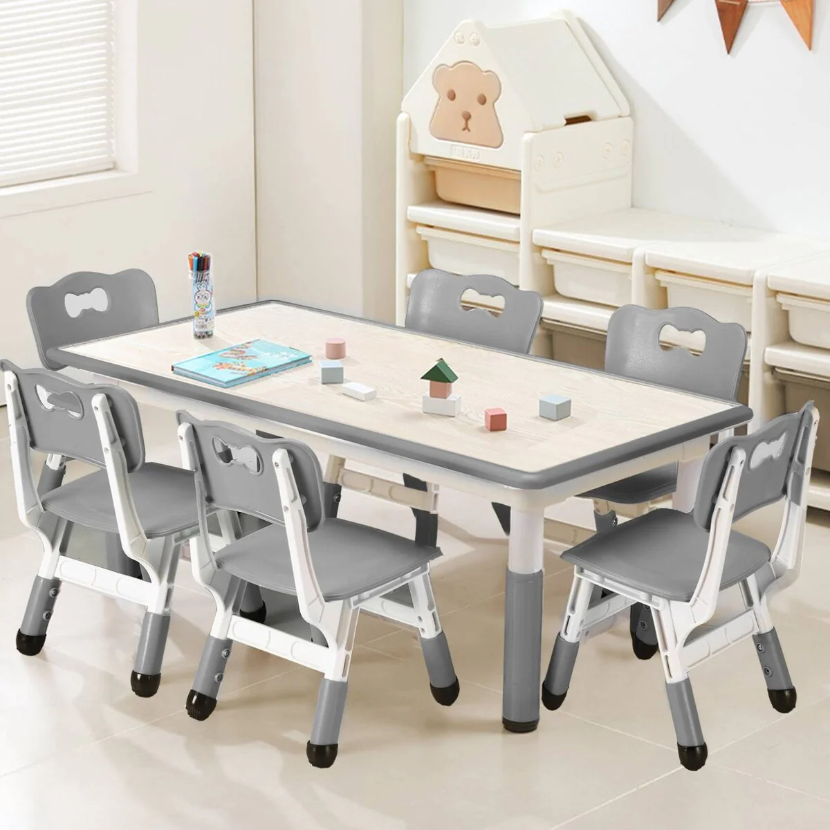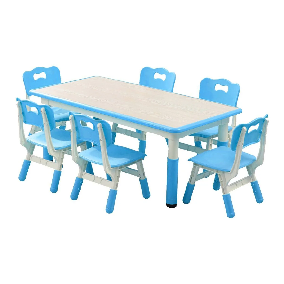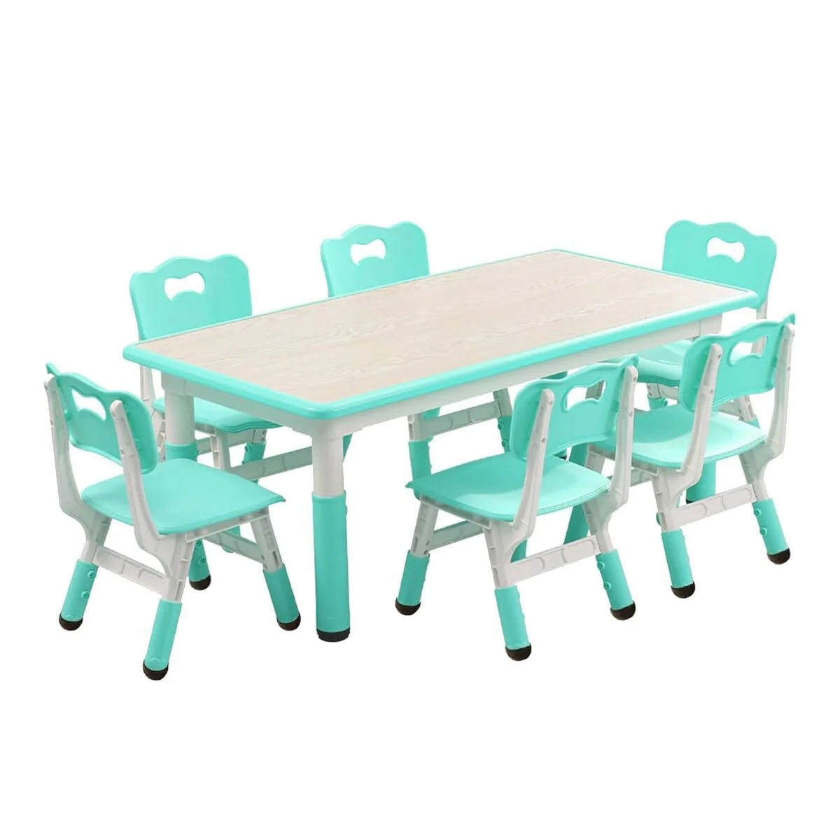 This Kids Table and 6 Chair Set offers a versatile and ergonomic design suitable for various activities and age groups, providing a comfortable and safe space for children to engage in different tasks.