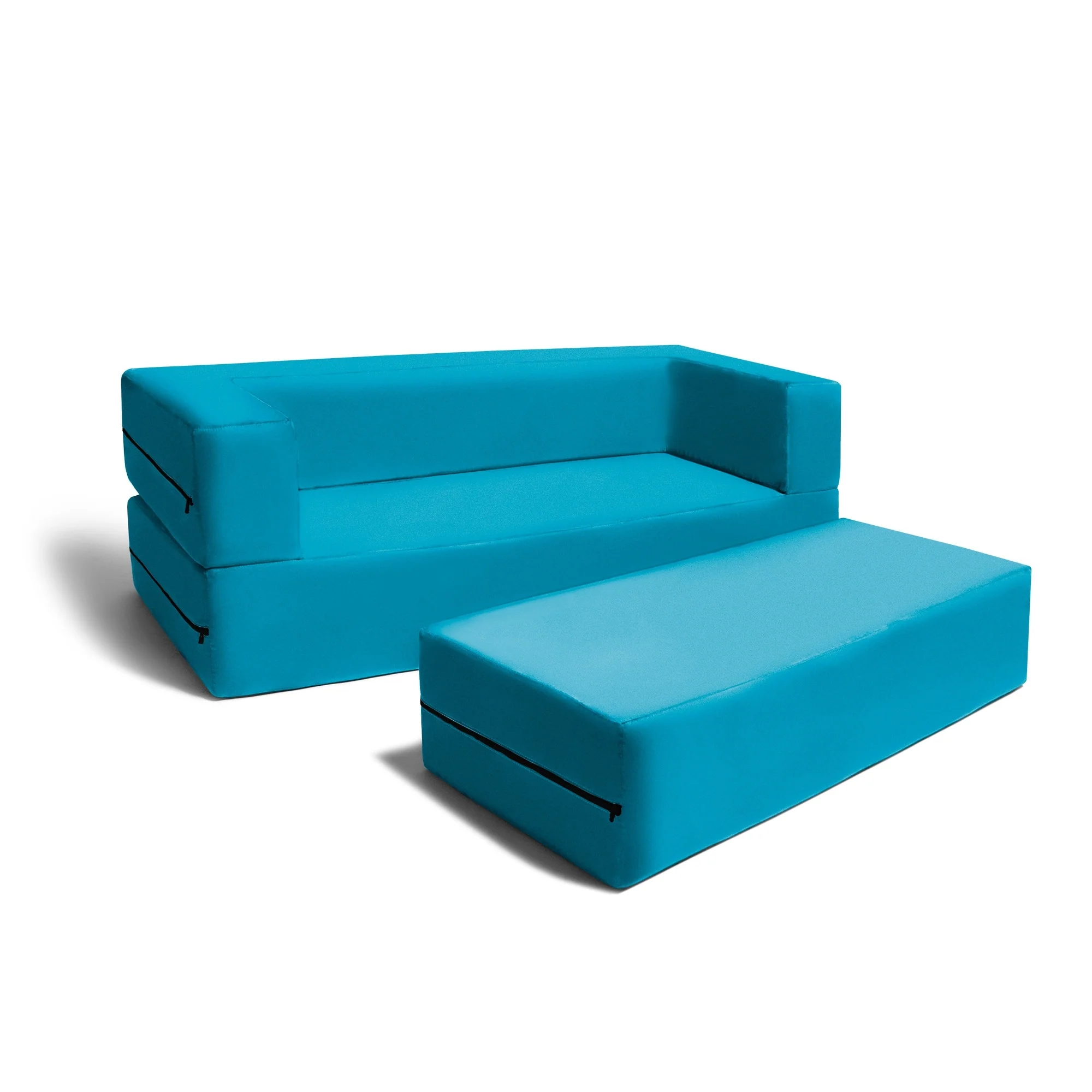 - Multi-position convertible kids sofa with ottoman that easily converts into a child sized bed, bench, or play table