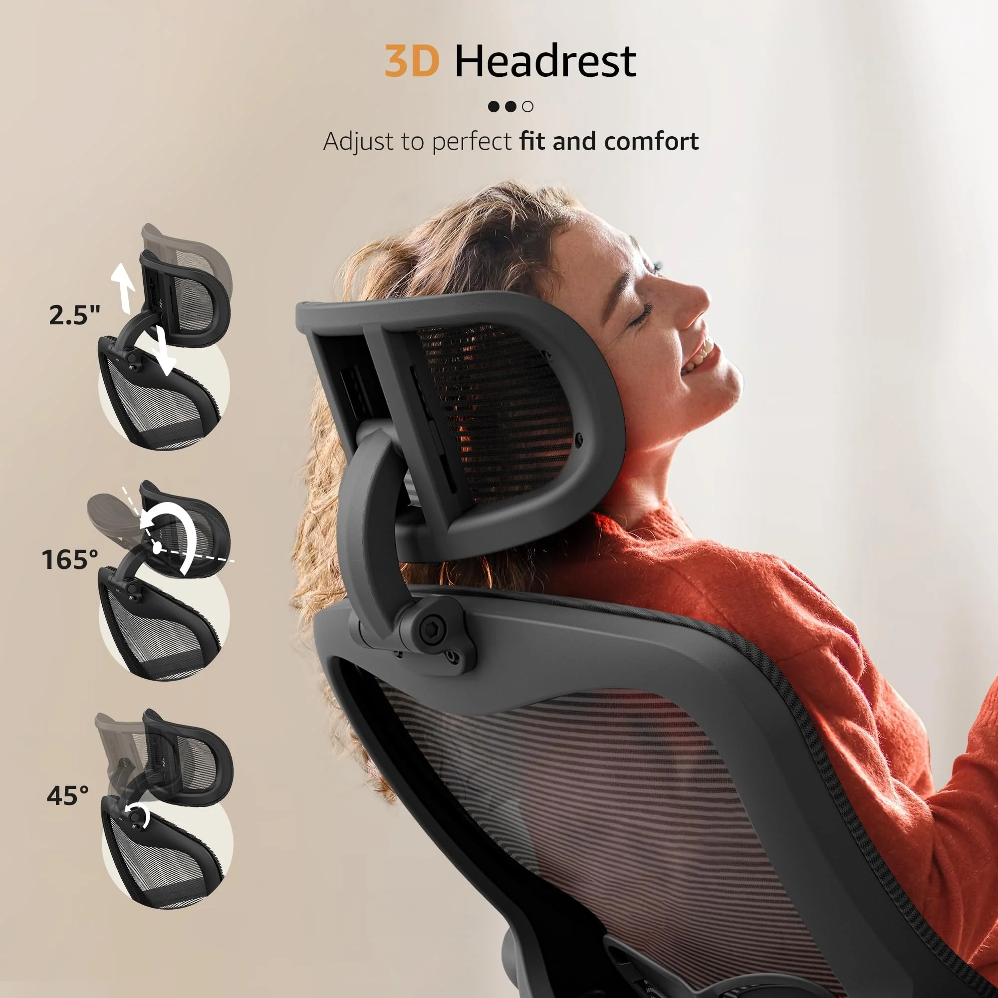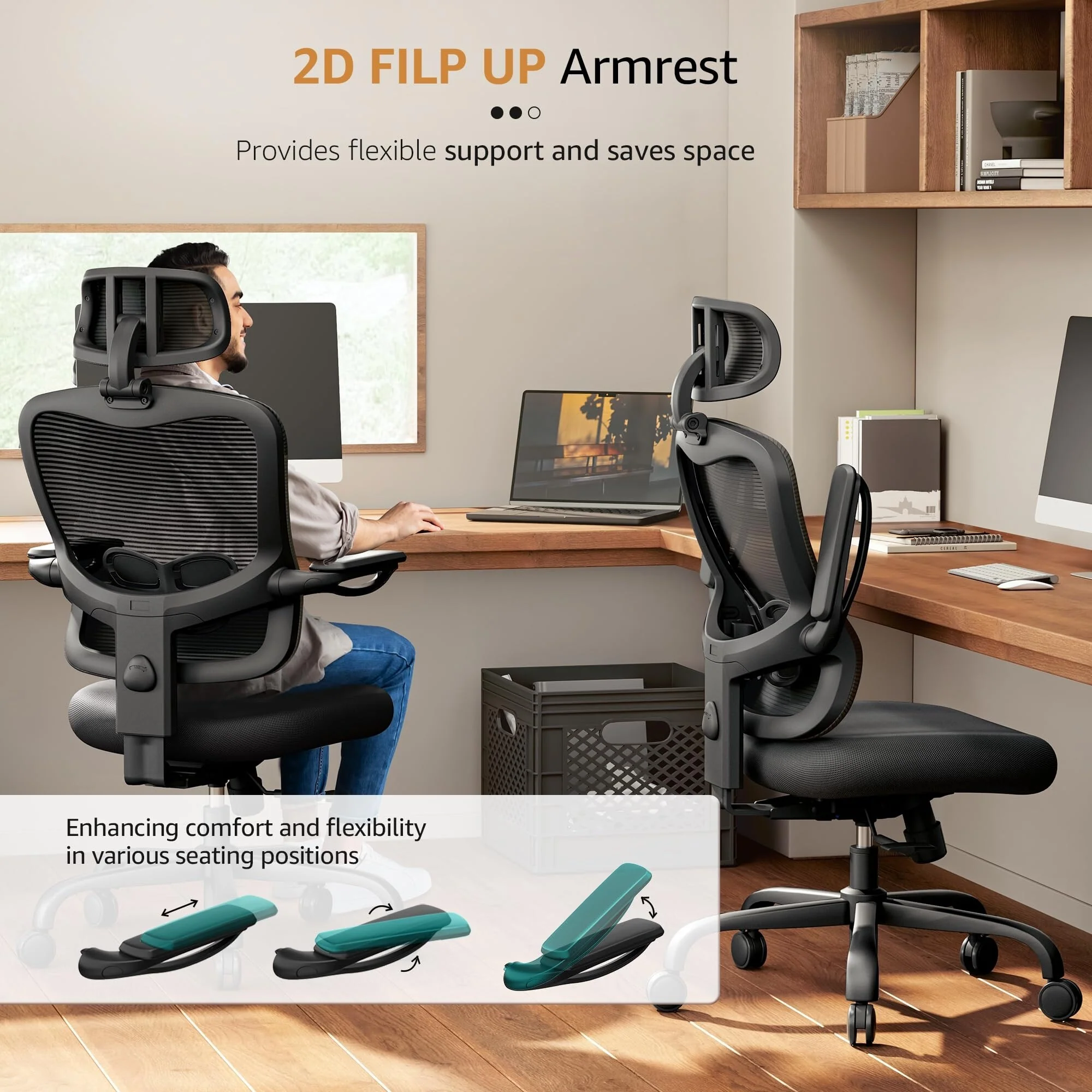 LANDOMIA S-shaped ergonomic office chair provides 5 supporting points(Neck/ shoulders/ back/ hips/ hands). The headrest, backrest, and arms are adjustable so that people of different heights can be properly supported.3 ways to flexibly adjust to support your neck/head, preventing lean forward and relieving fatigue.Our extra wide office chair with a big seat cushion is designed to relieve thigh pressure and provide all-day sitting comfort.The padded armrests designed to support your arms and flip up to save space. The PU surface is skin-friendly and won't make your skin sensitive.The mesh backrest provides just the right amount of support and stretch to keep your back cool and comfortable.