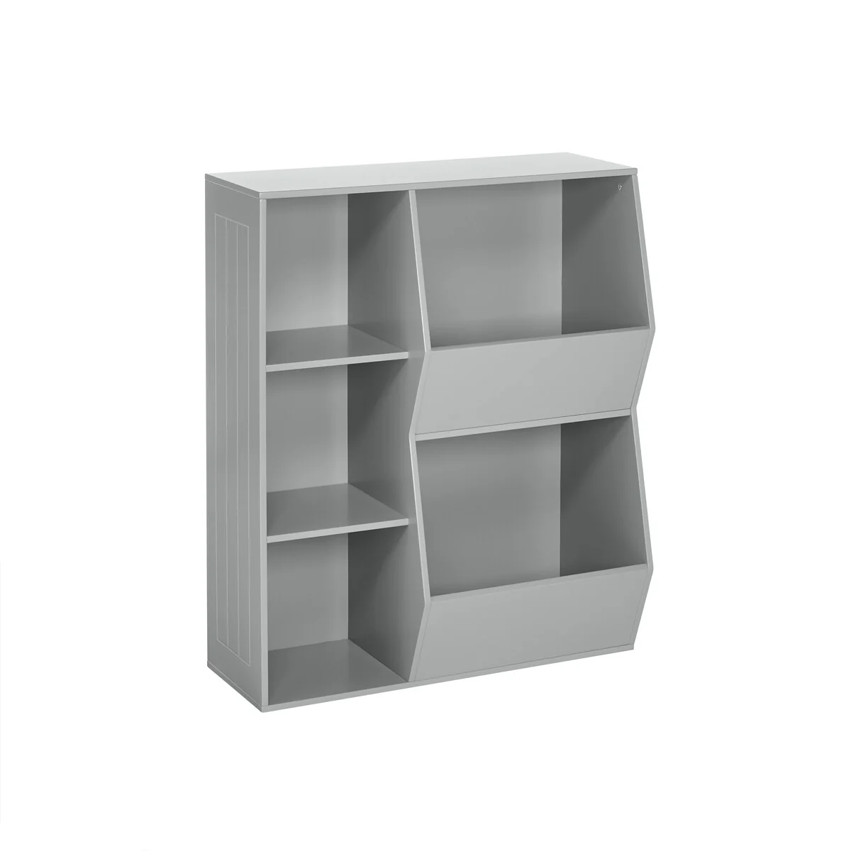 The RiverRidge Kids Playroom Toy Organizer and Bookcase with 3 Cubbies and 2 Veggie Storage Bins has never looked so stylish! Our RiverRidge Toy Storage Organizer with Bookcase Multi Shelf Cubby and Bins combines functionality and aesthetic appeal. The clean, geometric design seamlessly integrates into any room, elevating your toddler's storage game. Secure it to the wall for added stability, and voilà – a stylish solution for taming the toy chaos! Bid farewell to scattered playthings with our clever toy storage shelves unit. The two spacious bins provide ample space for stashing plush animals, games, and larger toys, while the three cubbies offer convenient homes for smaller items. Embrace an organized sanctuary where every toy finds its rightful place, fostering a serene environment for your little ones. Unleash your creativity with our RiverRidge Toy Storage Organizer! Complement its sleek design with our RiverRidge 2-Piece Folding Storage Bins, available in various colors to suit your decor (bins sold separately). This kids' storage organizer grows with your family, adapting to changing needs.