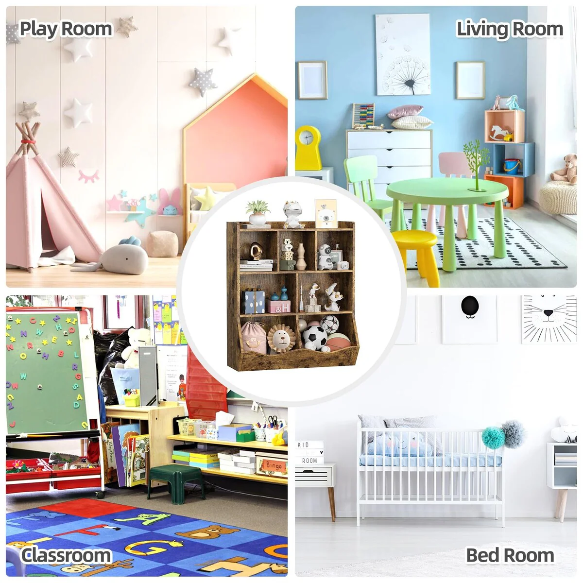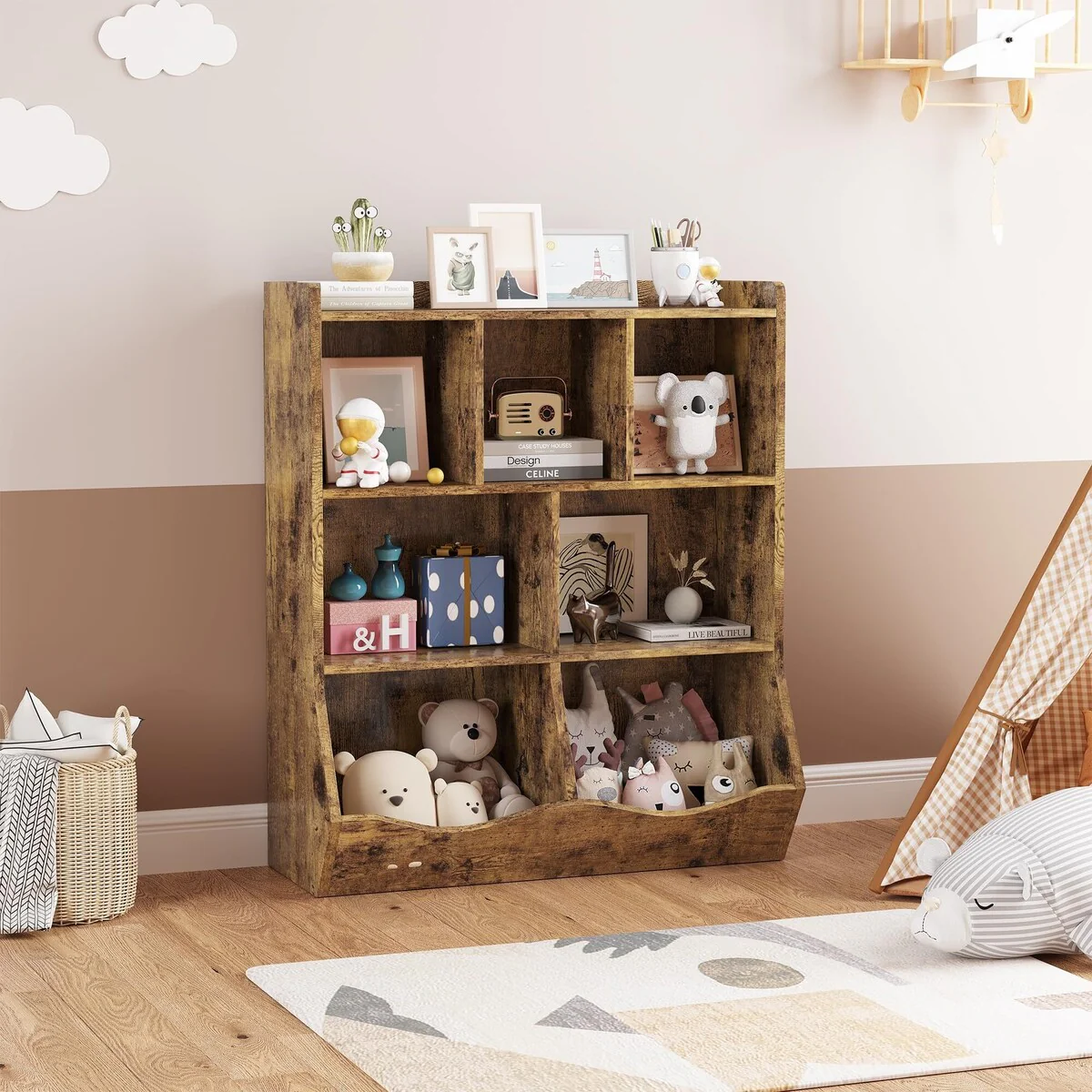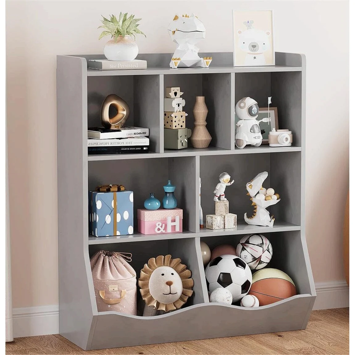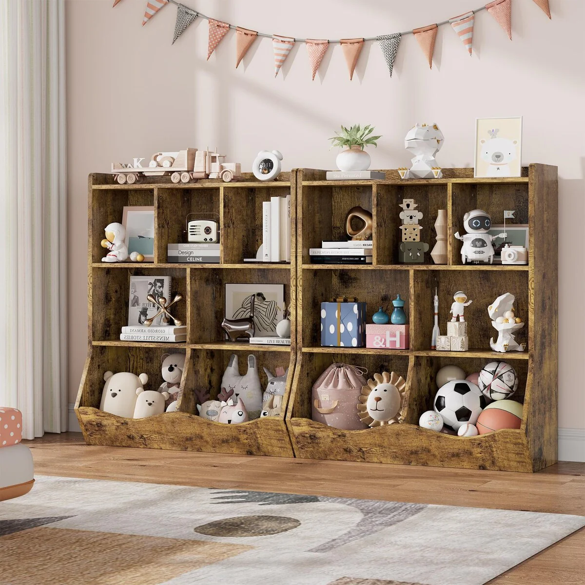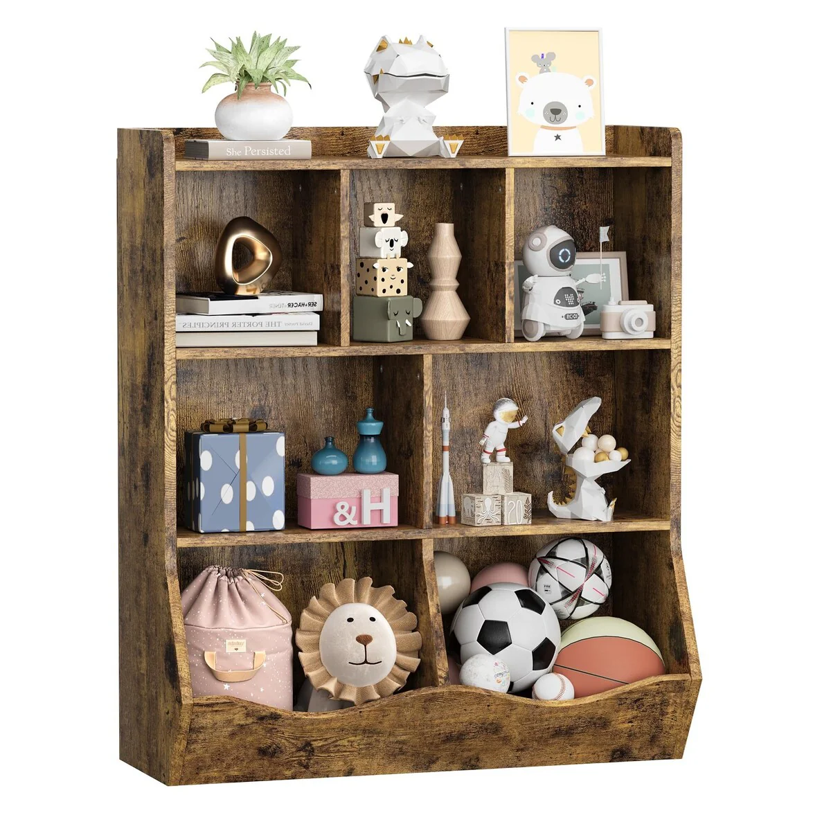 【Practical and Personalized Storage】With 5 open compartments and 2 tilting storage boxes, this toy storage cabinet allows you to neatly organize books, toys, and personal items, while also showcasing your unique style with decorative items on top. 【Durable and Secure Construction】Made of strong and safe particle board with a wide base and low center of gravity, ensuring stability and durability, even during active use.