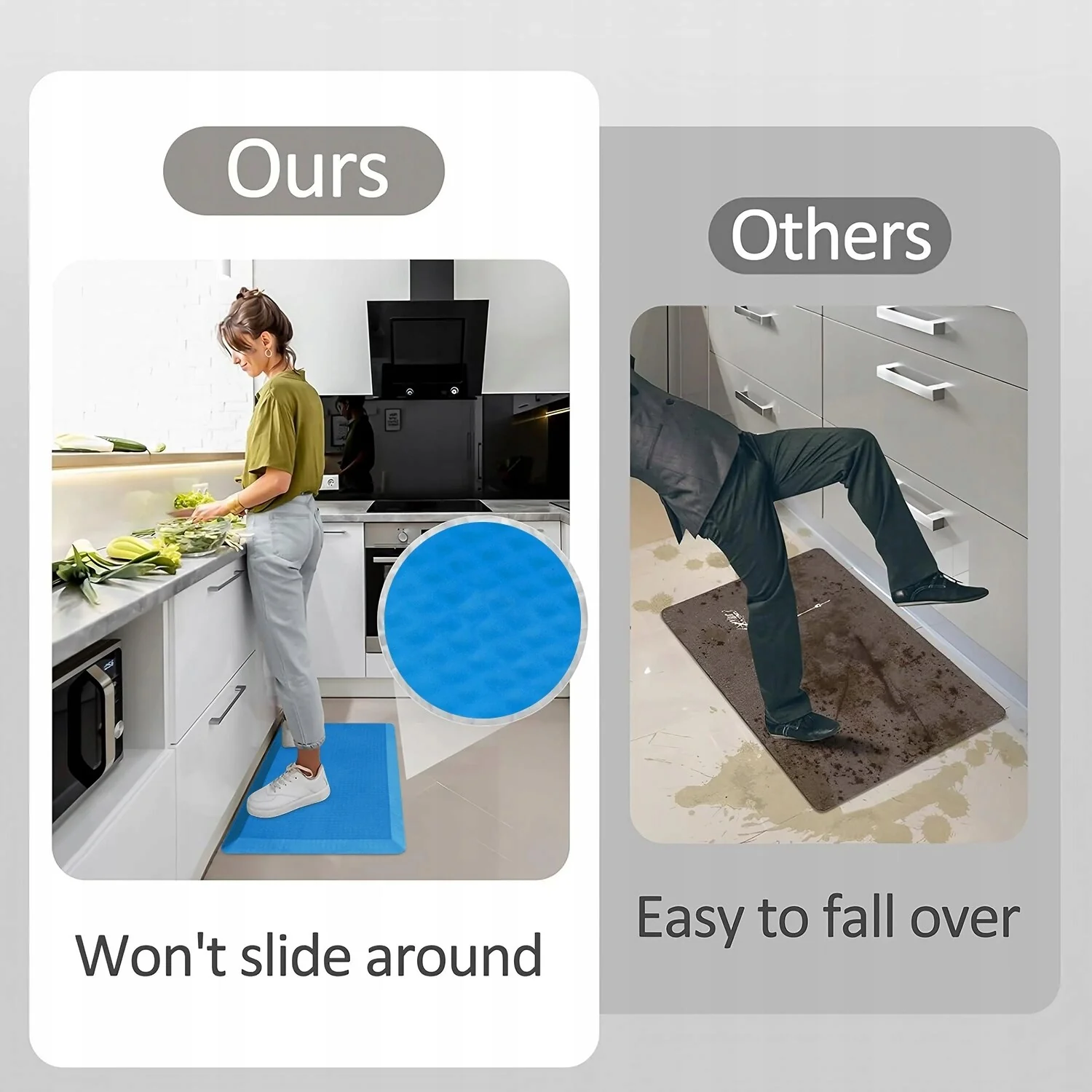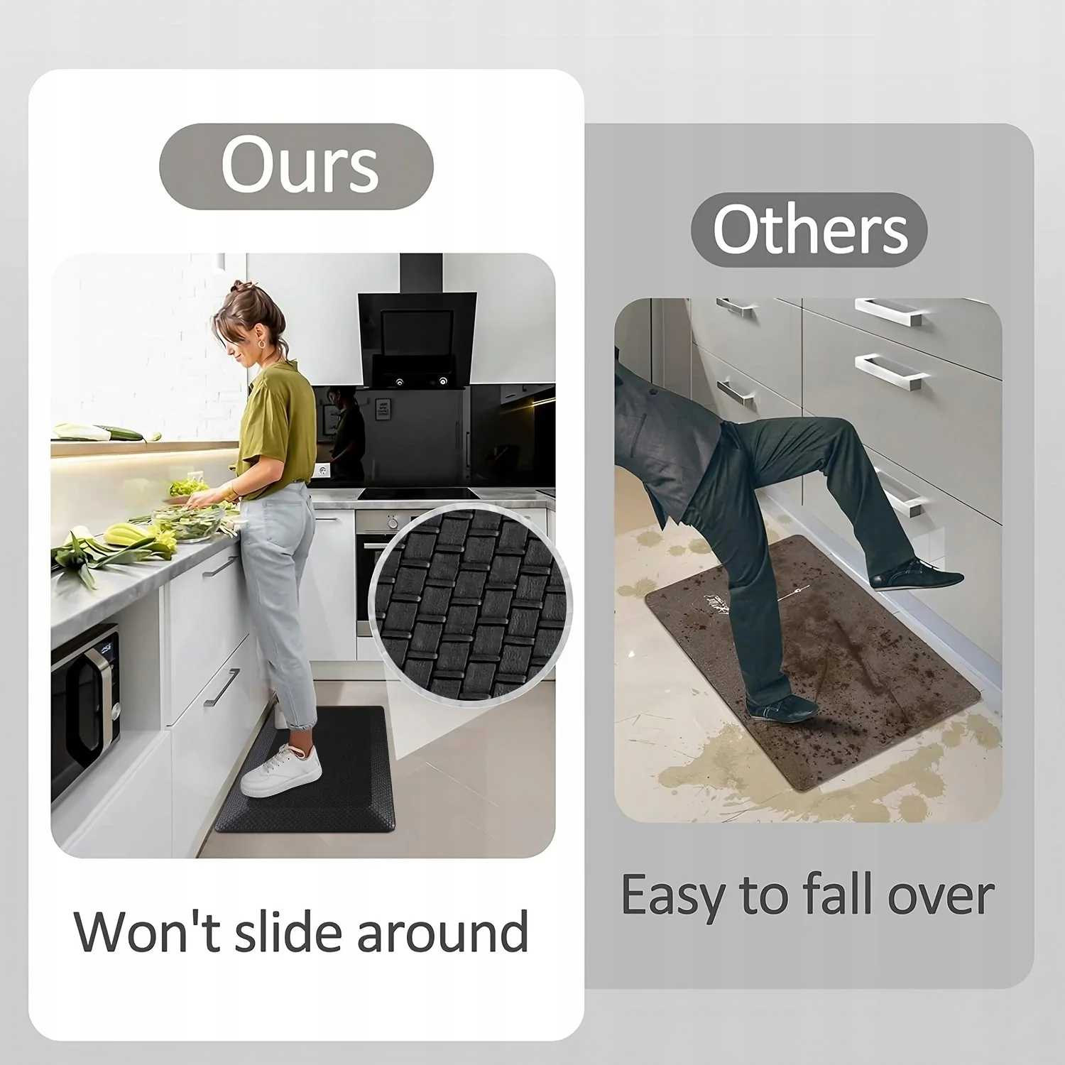 - Non-Slip Design: Safety is paramount in the kitchen and bathroom, which is why our mats feature a non-slip backing to keep them securely in place, reducing the risk of slips and falls even on slick surfaces.