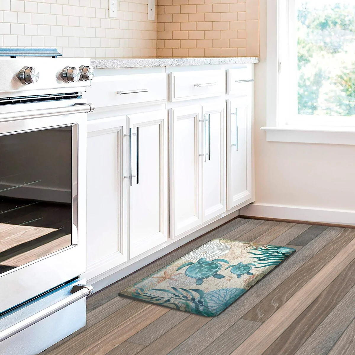 Surf's up with this 'Bay Turtles' anti-fatigue kitchen mat. A pair of sea turtles float off into the sea, framed for the viewer with waving blue and green seaweed. Coral colored starfish and spiky shells add a contrast to the cool blues throughout the design. The background of this kitchen mat is an antique map with latitude lines and whimsical illustrations. This complex ocean design is perfect for any coastal and nautical decor.The anti-fatigue cushioned comfort mat is made with durable PVC to be long lasting for continuous use. Ideal for kitchen, bathroom, laundry, standing desks and standing stations.Measures 20' x 30'Supportive Foam CushionAnti Fatigue100% PVCImportedWipe Clean