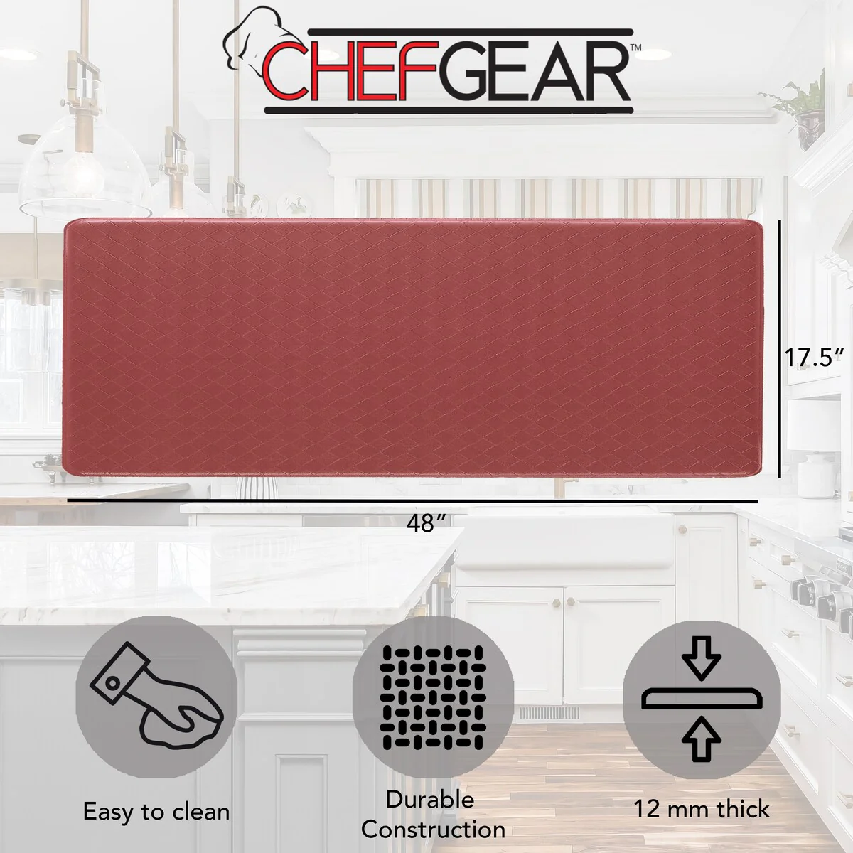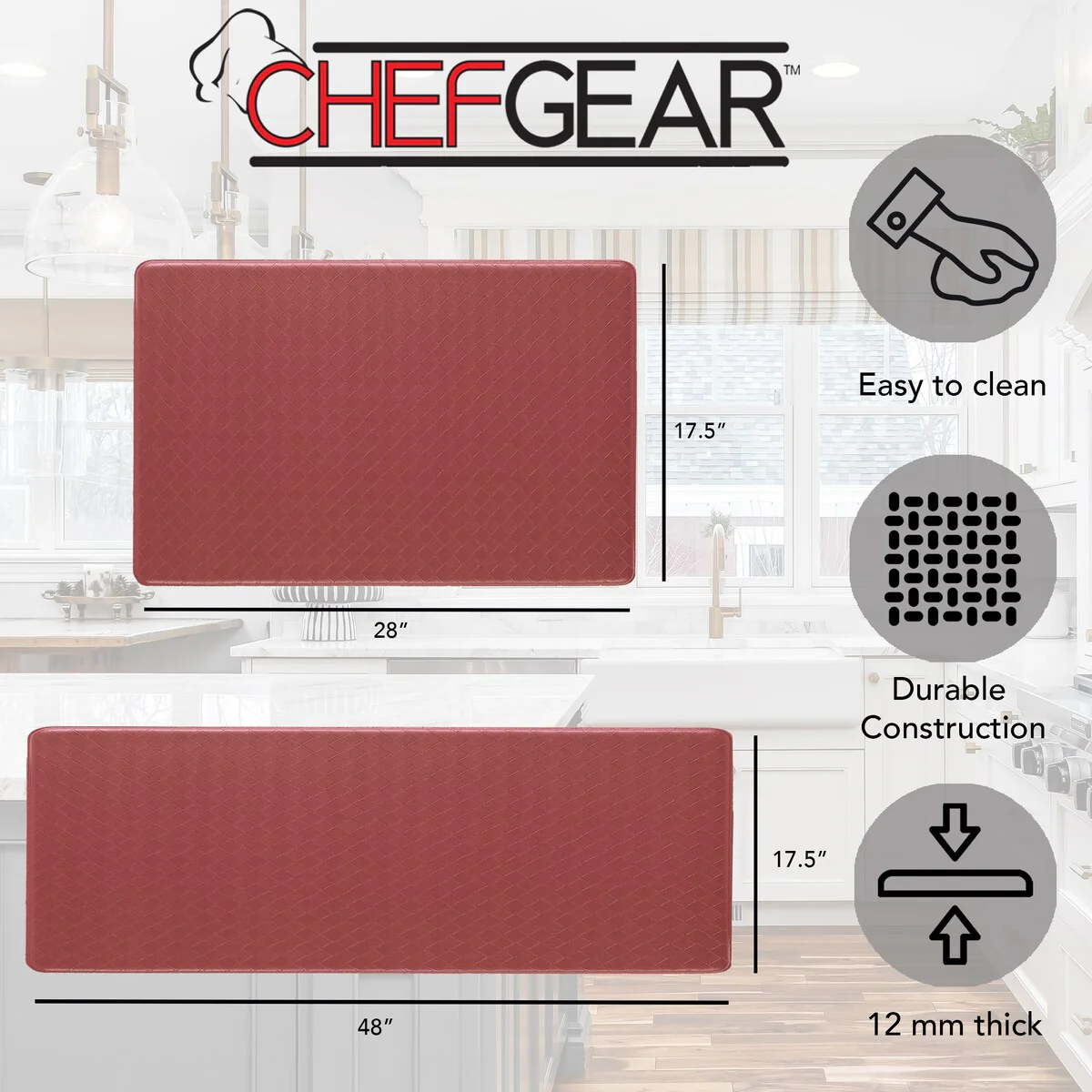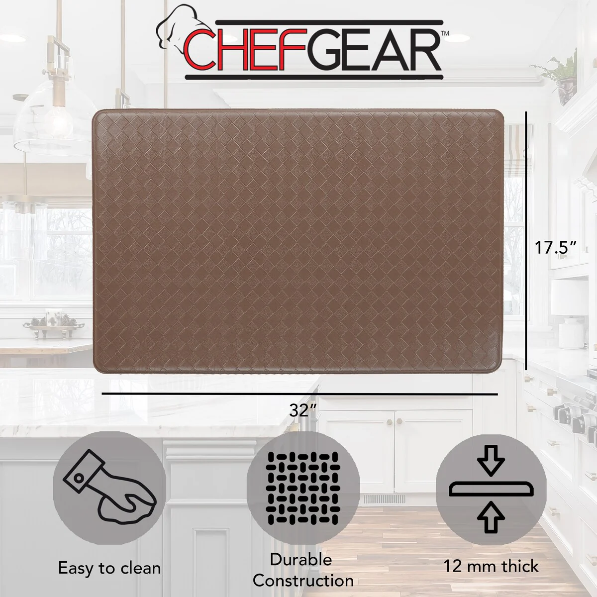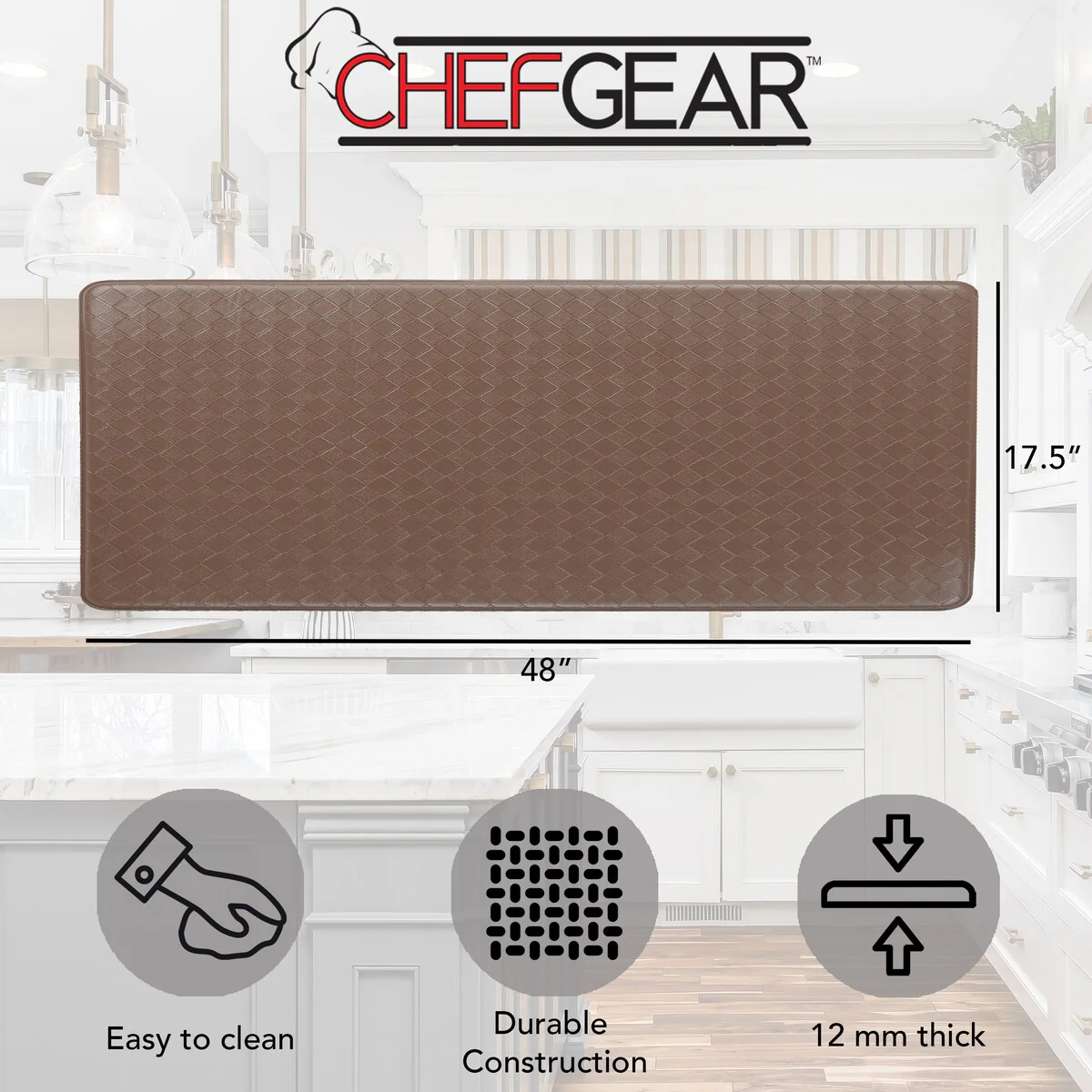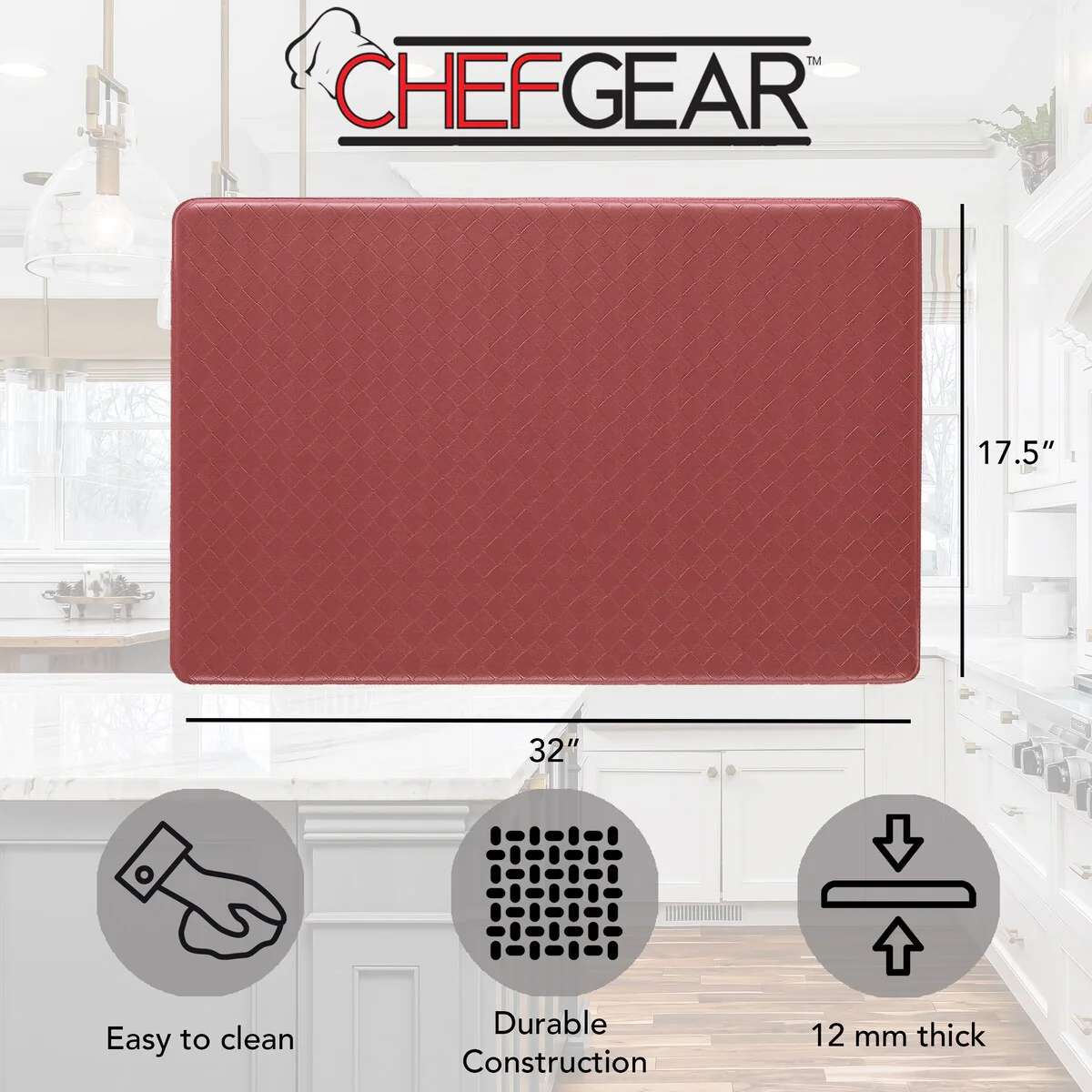 Say goodbye to sore feet and hello to comfort with Chef Gear Playa Basketweave Anti-Fatigue Kitchen Wellness Mats by Creative Home Ideas. These long-lasting mats come in various sizes, including 18 x 30, 17.5 x 32, and a 2-Piece Set measuring 17.5 x 48 / 17.5 x 28, providing a perfect fit for any space. The cushioned construction promotes better posture, circulation, and muscle conditioning while cooking or working in your kitchen or laundry room. The slip-resistant backing ensures safety, while the fade-resistant cover makes cleaning a breeze. Imported.