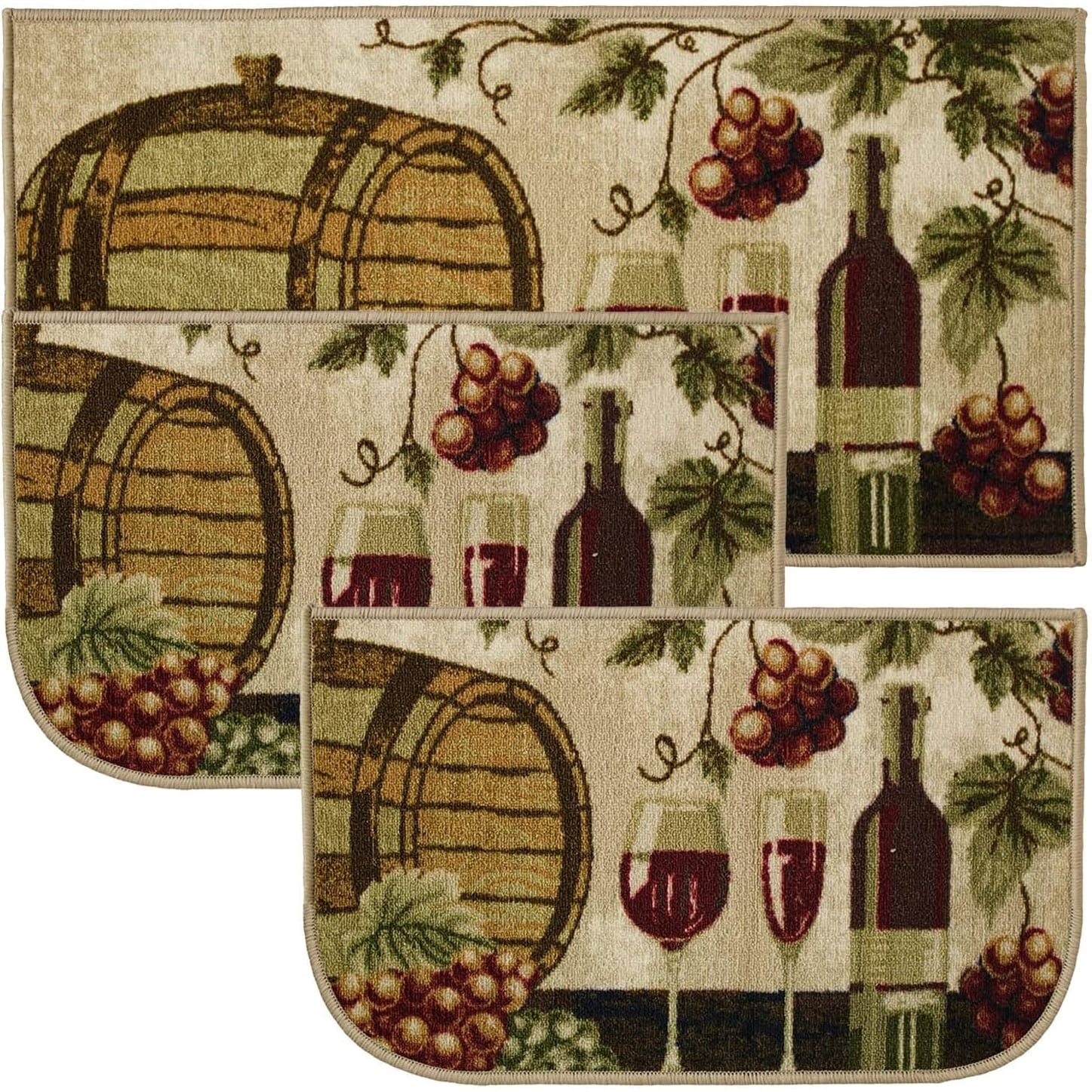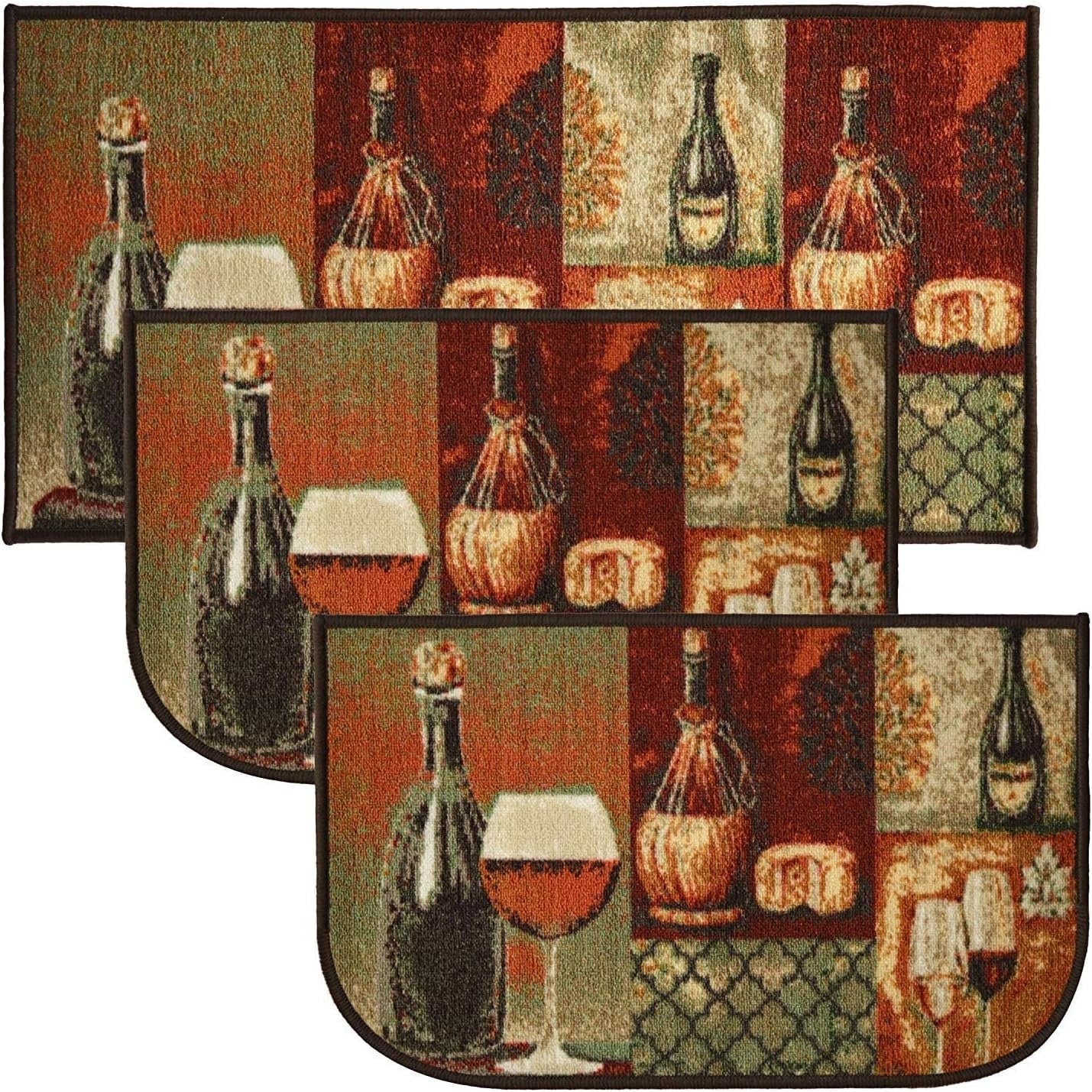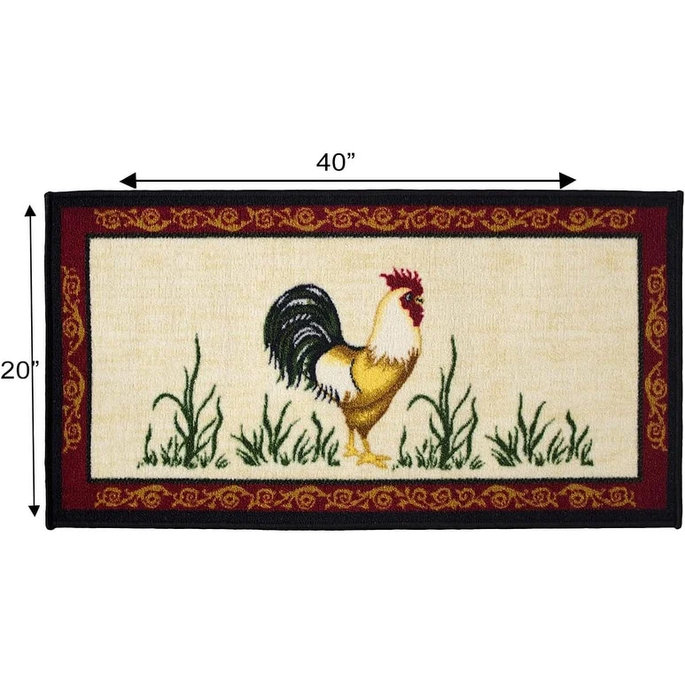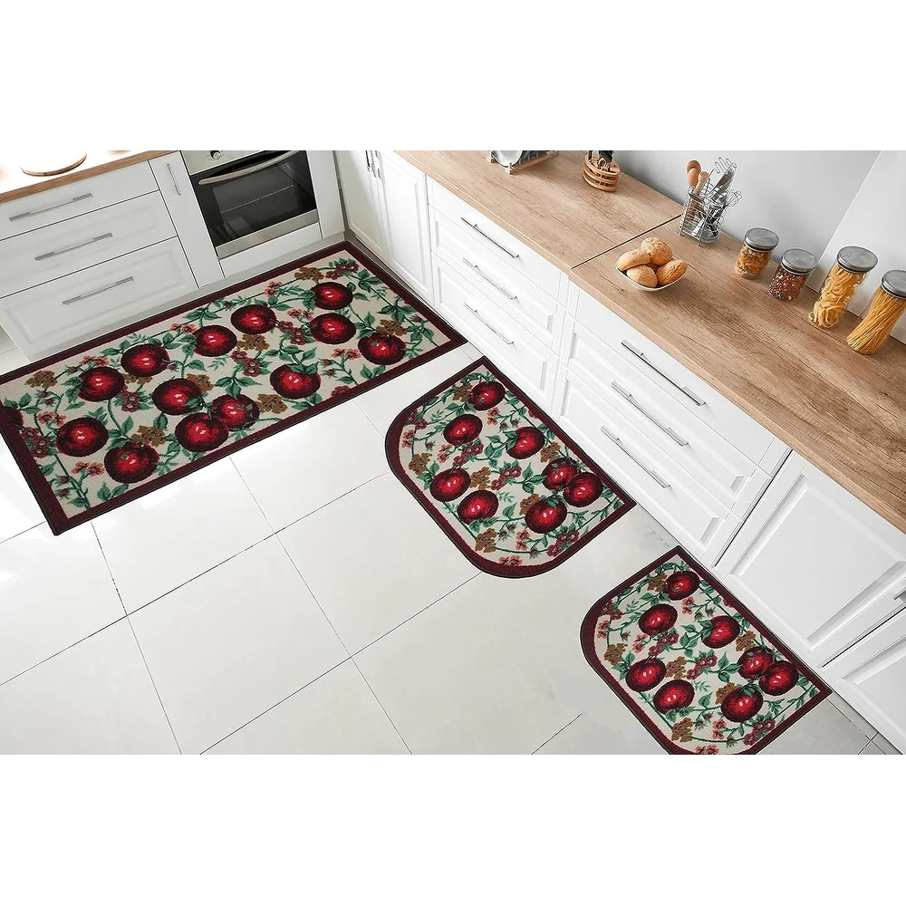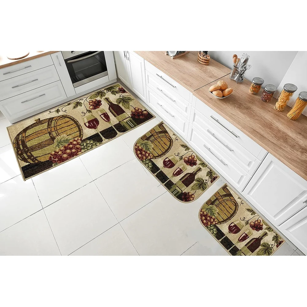 Add a new look to your kitchen with this decorative printed kitchen rug by Kashi Home and feel comfortable as you clean dishes, prepare vegetables, or while. Rugs feature built-in latex backing on the bottom of the kitchen rug that will help prevent it from slipping and sliding its way around the kitchen and keep you stationary. Available in a variety of beverage, food, fruit, vegetable, and farmhouse designs. Made with soft and durable polyester and built with a durable layer of latex on the bottom. To ensure a better grip on the floor it is recommended to use a rug pad with the kitchen rug. These printed rugs are decorative in addition to almost any kitchen decor, the collection of deep colors creates a wonderful image that adds a finishing touch to the kitchen look and feels. Great for Farmhouse, and country house decorations. Set includes: 3 Piece Set (2 18x30 D-Shape & 20x40 rectangle) Please note that packaging may. Hand wash, drip dry. Not recommended to machine wash.