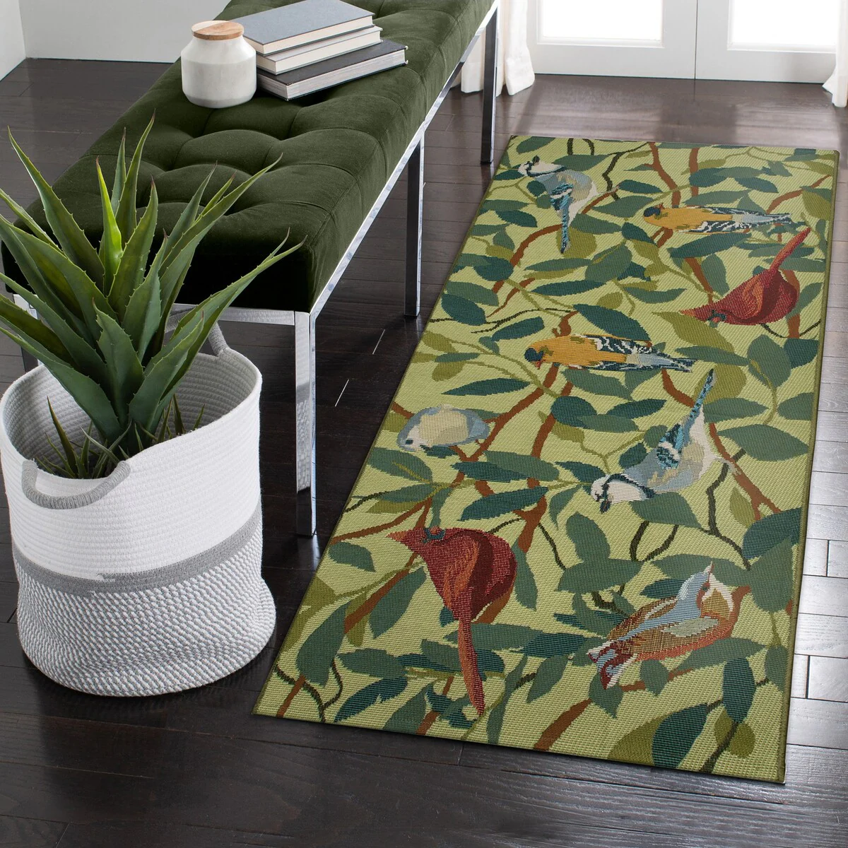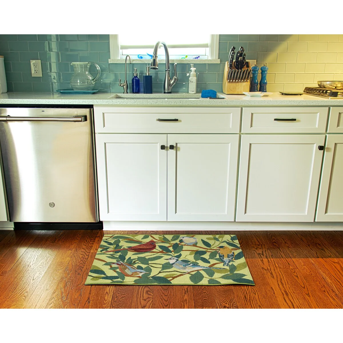 Bring the beauty of nature into your home with our Liora Manne Esencia Birds Of A Feather Indoor/Outdoor Mat. This mat features multi-colored song birds joyfully singing in a tree surrounded by deep green leaves on a light green background. Made in Egypt from 75% polypropylene/25% polyester, the material is flatwoven and low profile, making it durable and ideal for high traffic areas like your kitchen, entryway, hallway, living room, bedroom, patio or sunroom. With a latex non-skid backing, this mat is weather-resistant and UV-stabilized for enhanced fade resistance. The Esencia Collection is Power Loomed to create intricate designs with a broad color spectrum and a high-quality finish. Choose from a variety of detailed patterns in tropical, coastal, geometric, contemporary and traditional styles to complement your home decor. Limiting exposure to rain, moisture and direct sun will prolong rug life.