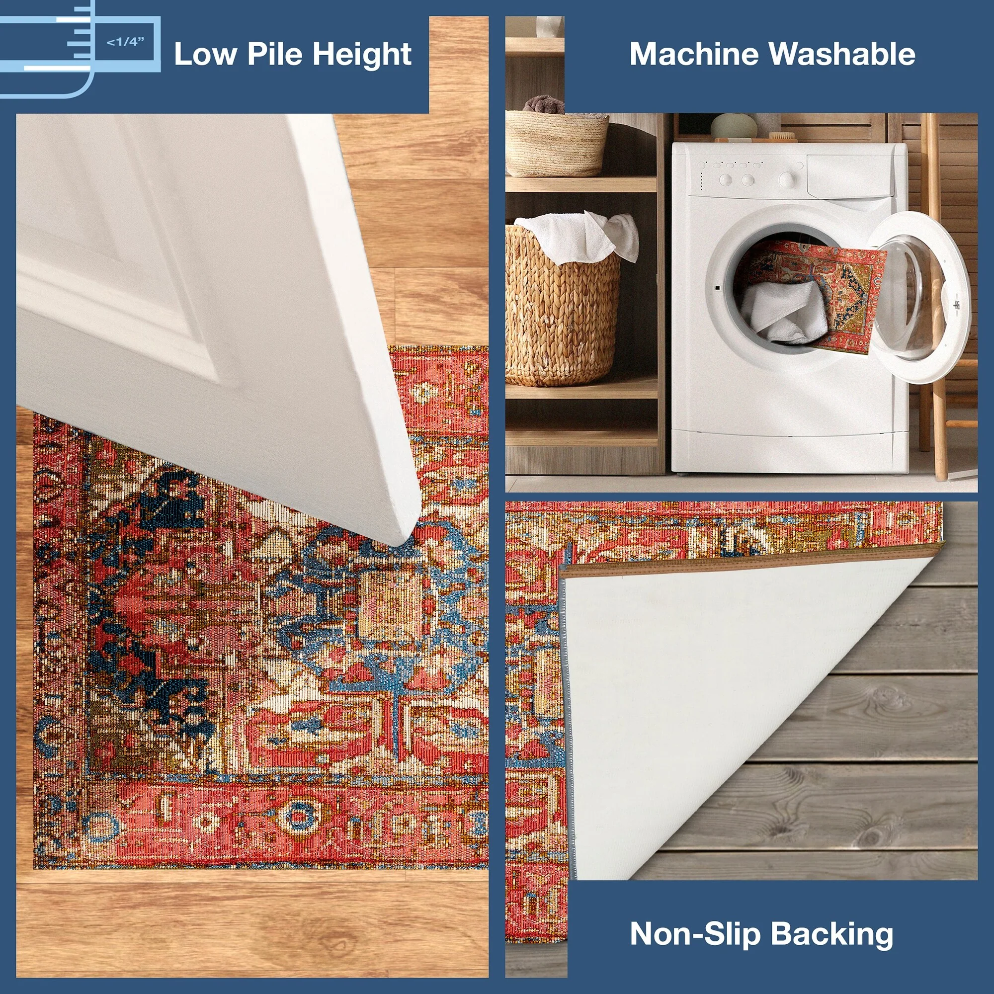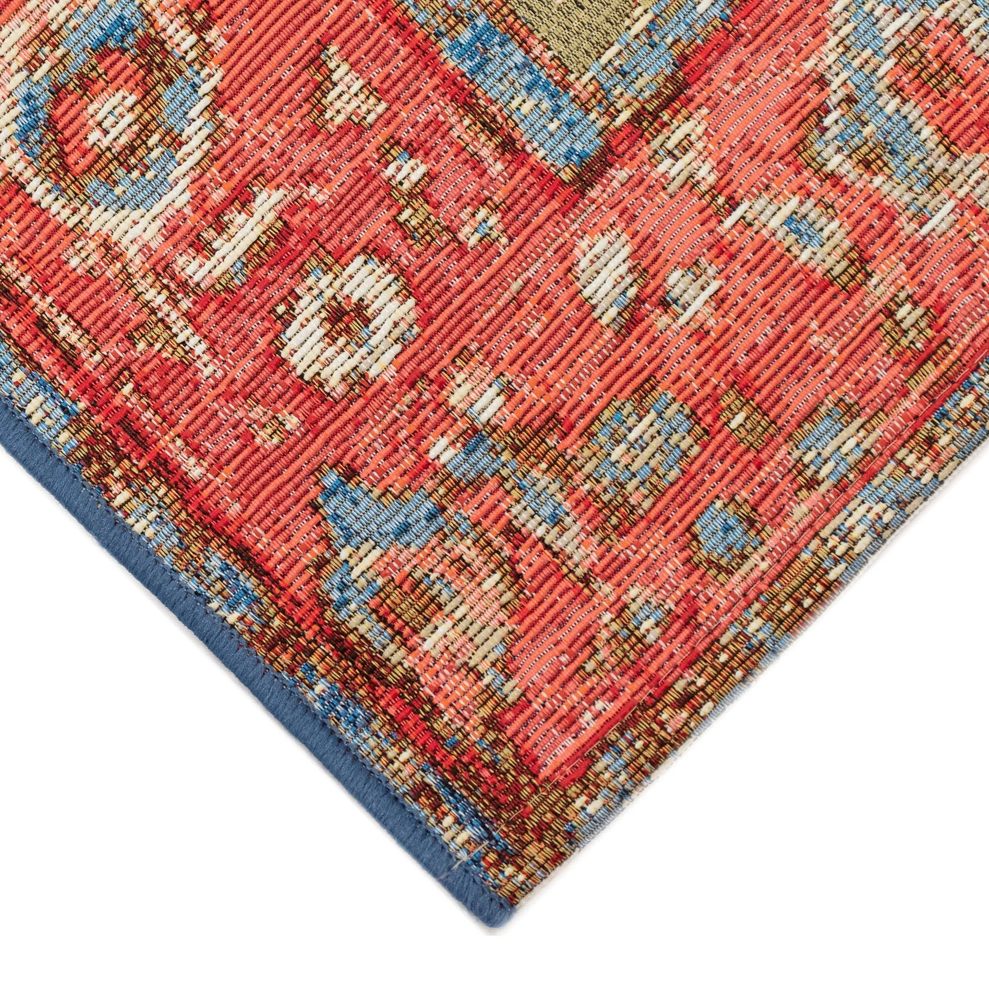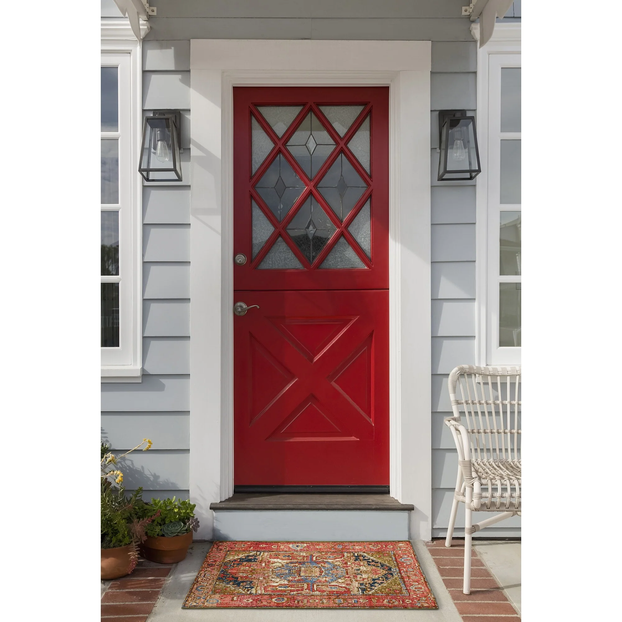 Add a touch of traditional charm to your decor with the Liora Manne Esencia Heriz Indoor/Outdoor Mat. The salmon pink, gold, and navy backgrounds with intricate shapes in contrasting colors create a warm and textural appeal. Made in Egypt from 75% polypropylene/25% polyester, this mat is reinforced with a latex non-skid backing and is weather-resistant and UV stabilized. Power-loomed to create intricate designs, this durable and low-profile mat is perfect for high-traffic areas like your patio, sunroom, kitchen, entryway, hallway, living room, and bedroom. With an eclectic mix of tropical, coastal, geometric, contemporary, and traditional designs, this mat is sure to be a perfect accent for your home.