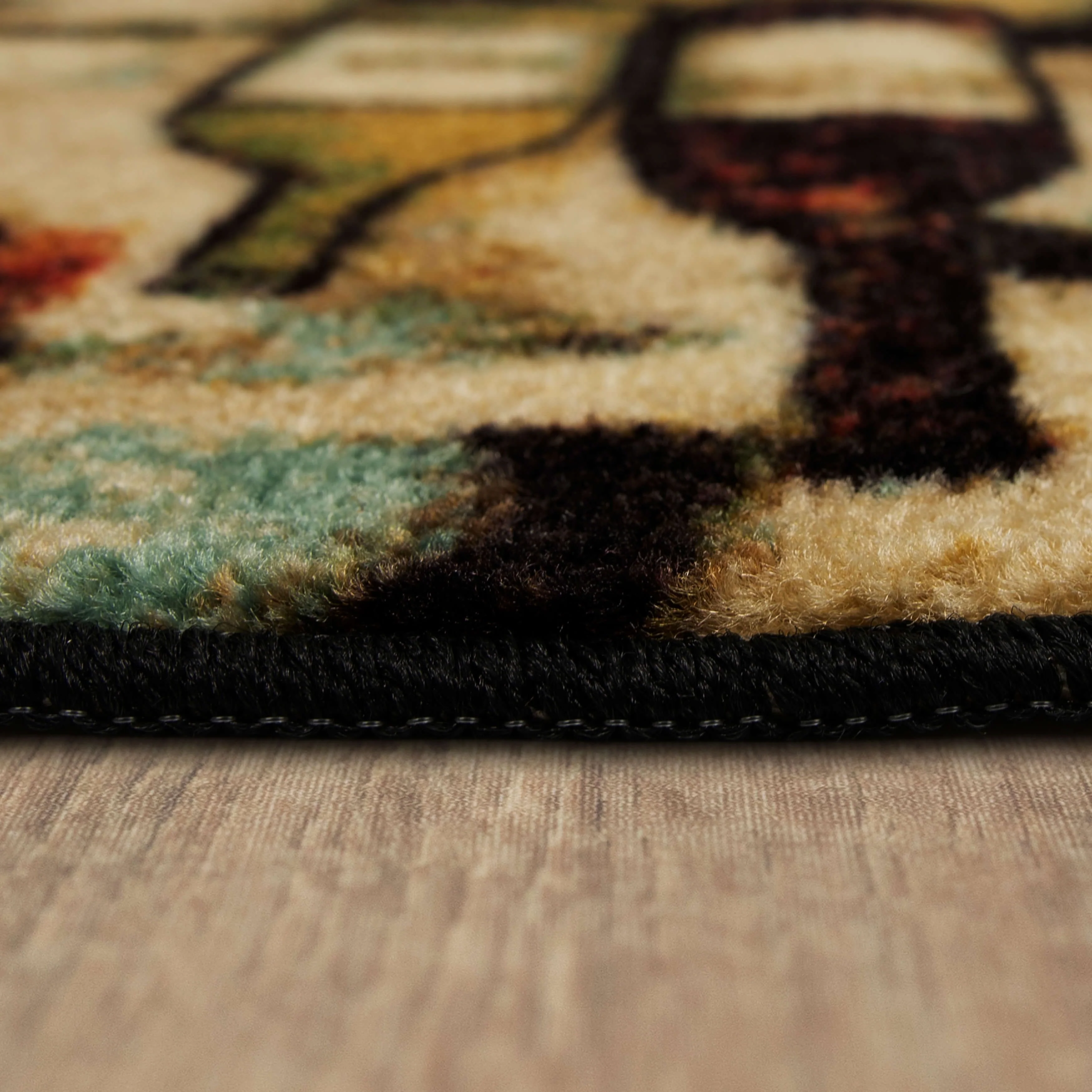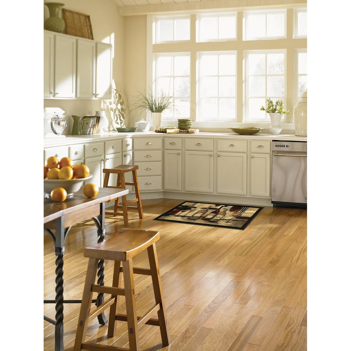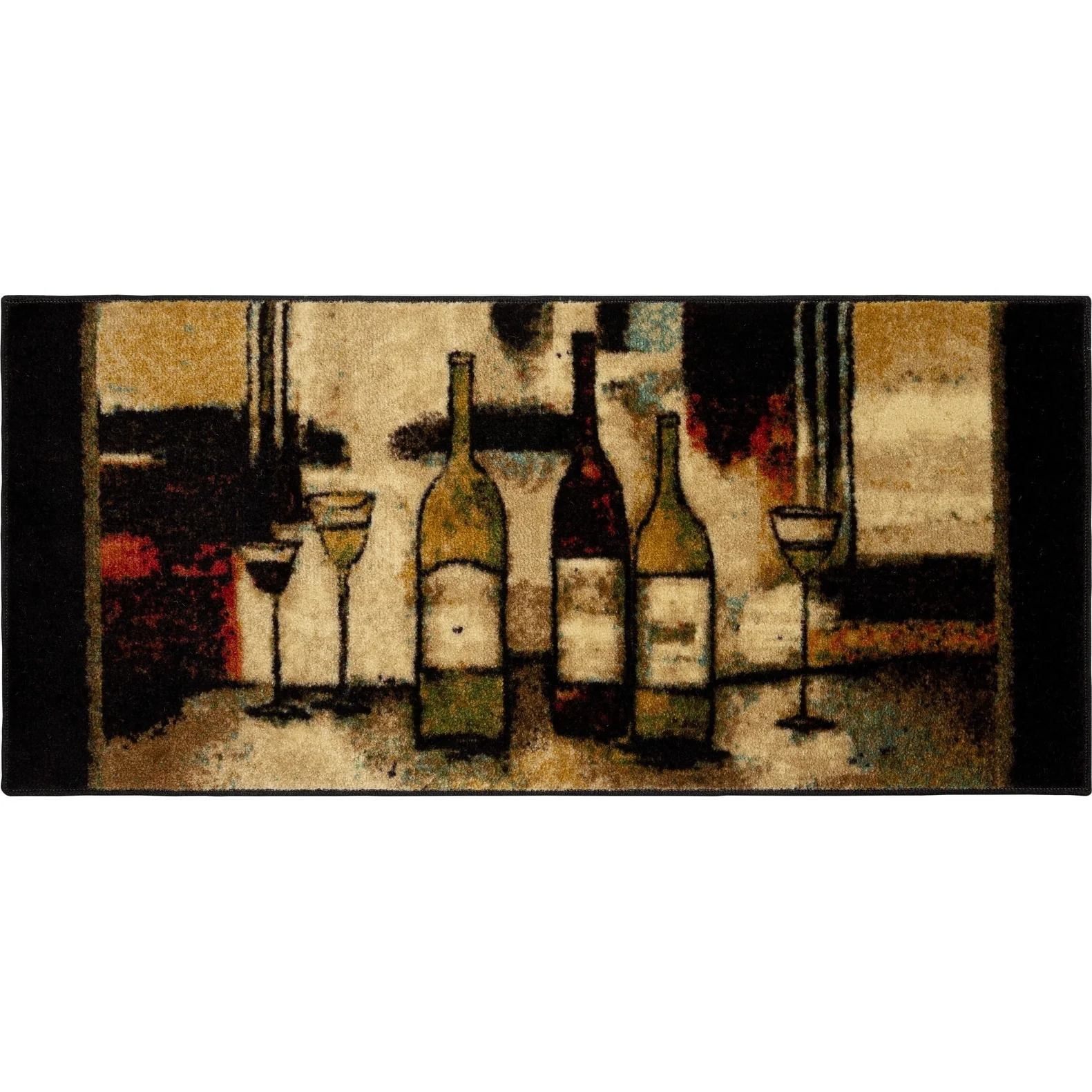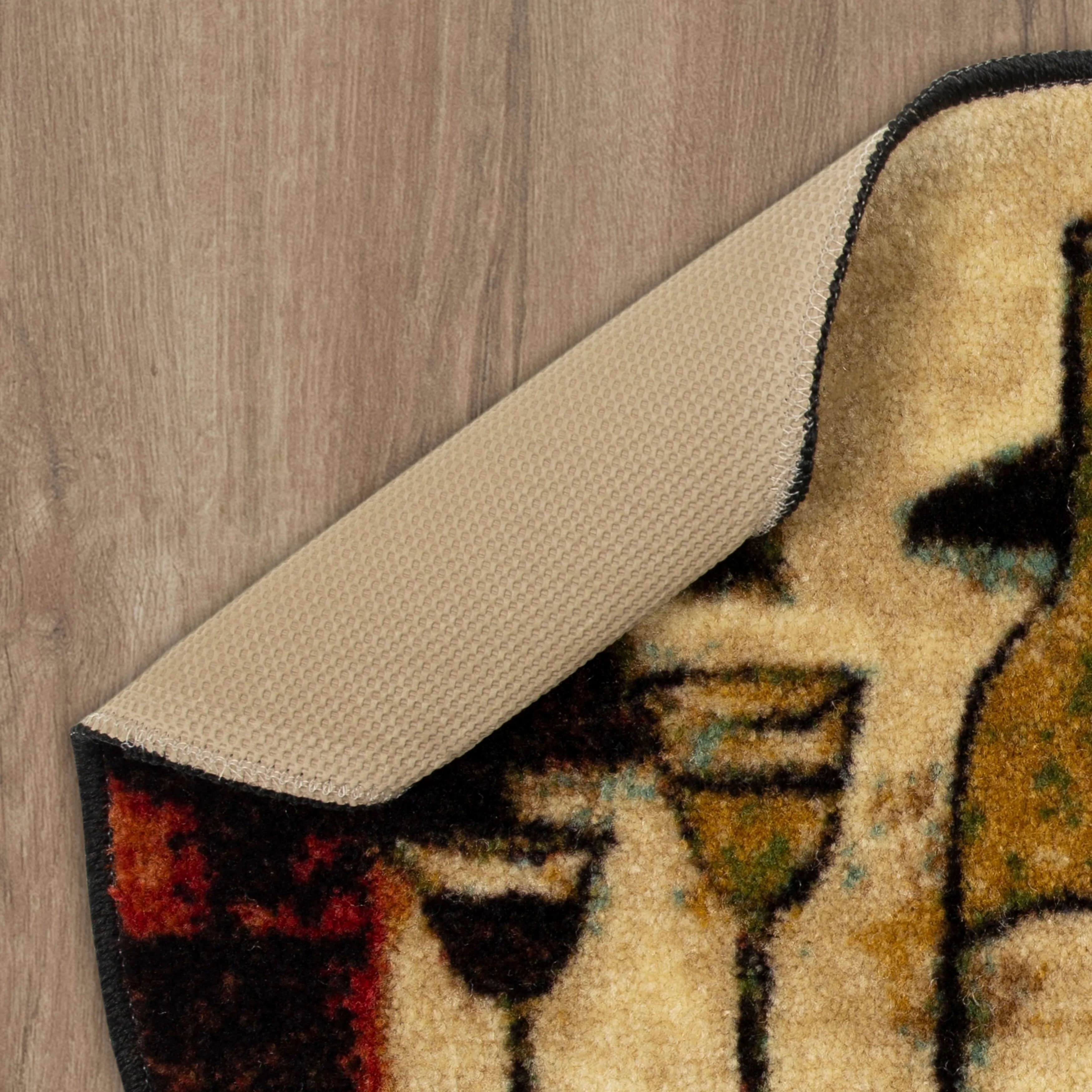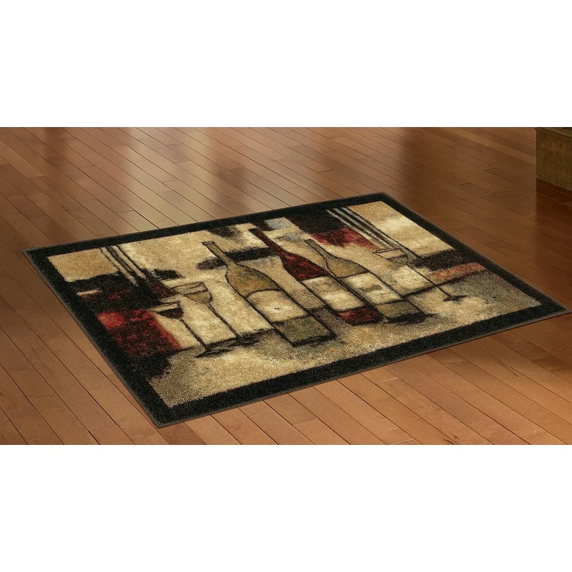 This charming accent rug featuring wine bottles and glasses in hues of red and black with gold accents will brighten your kitchen decor. Made with 100% Wear-Dated Nylon, this rug fiber features the perfect balance of plush feel and dependable durability, making it an ideal choice for any family's busy household. Available in and rectangle and slice sizes as well as a 3 piece set, this modern design will add class to your kitchen.