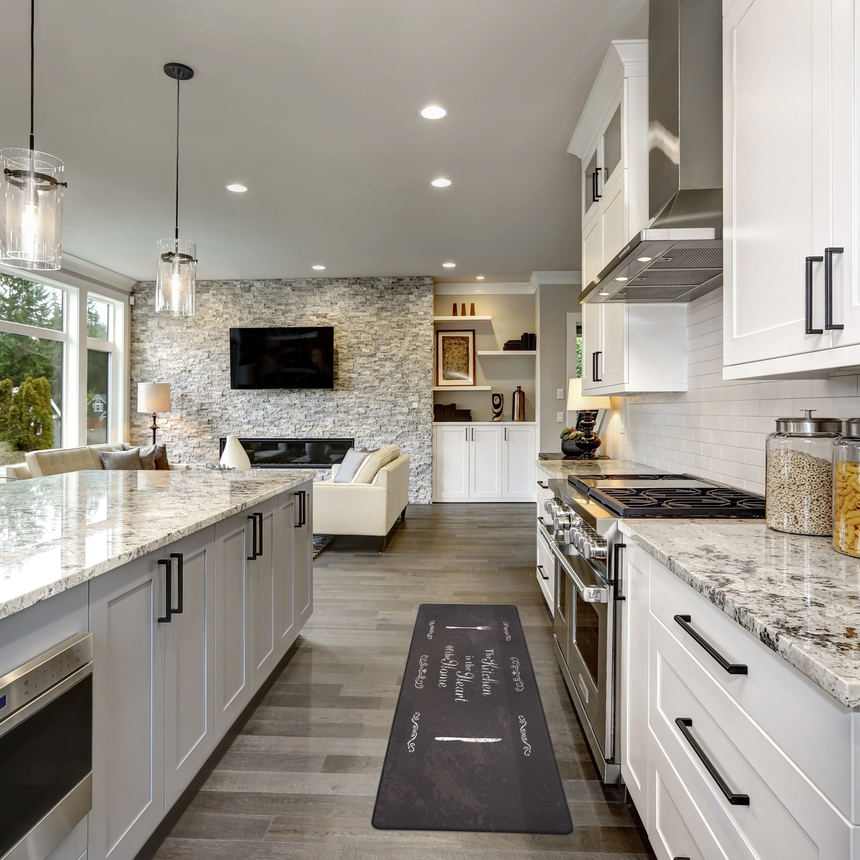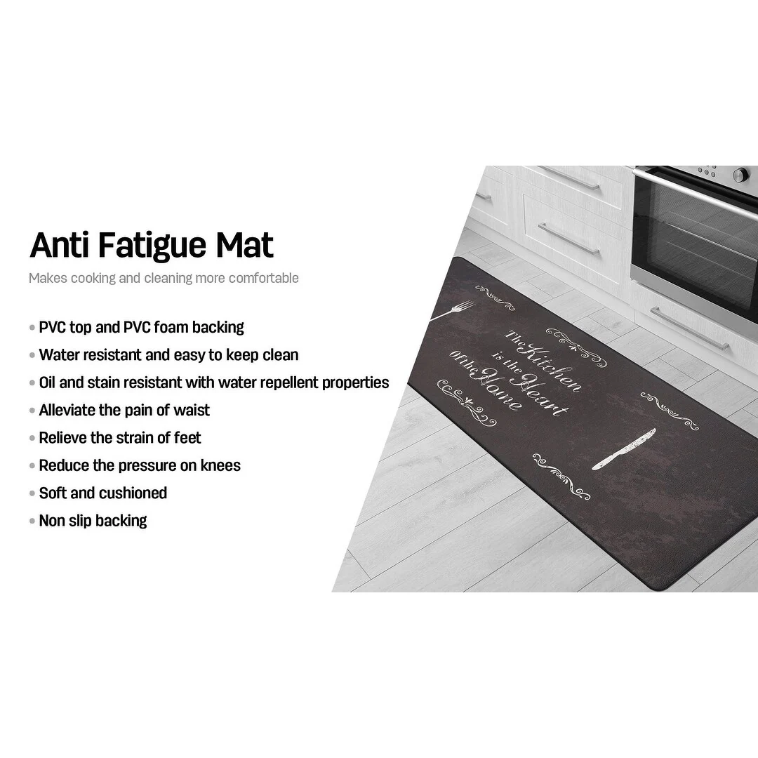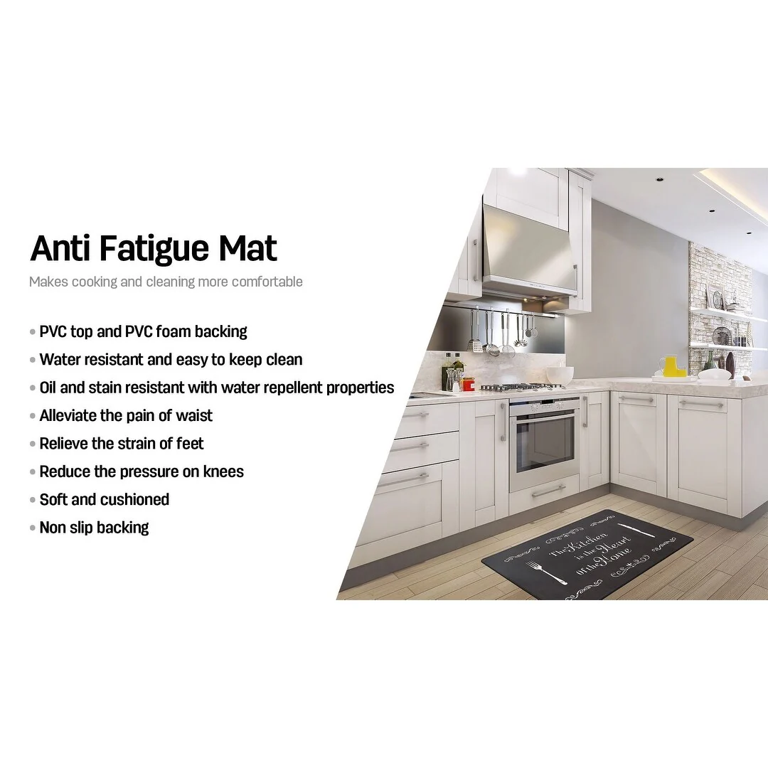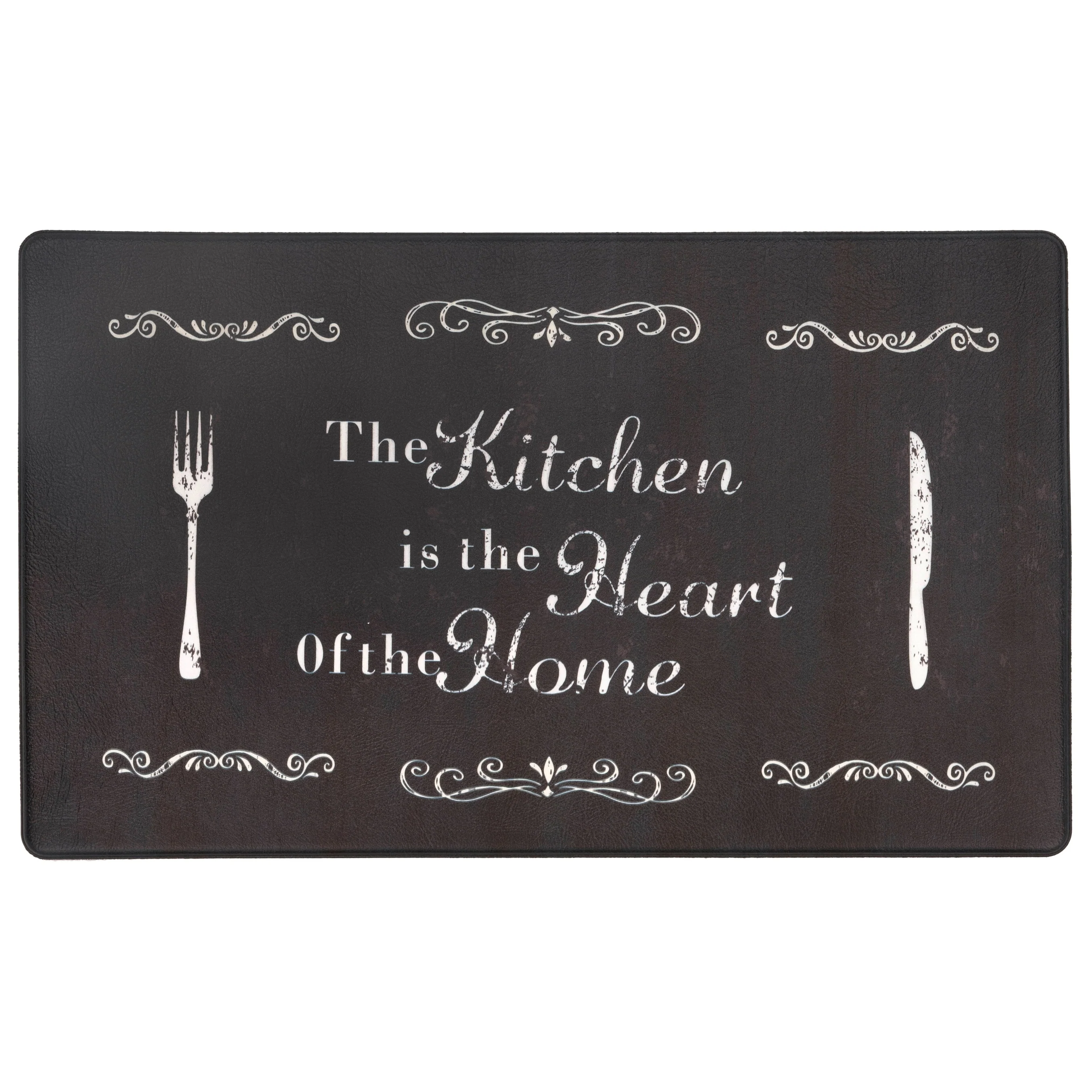 Celebrate the warmth of your kitchen with this inviting anti-fatigue mat. Made of the highest grade PVC material, this mat provides cushioned support and includes non-skid backing to keep it firmly in place. Featuring a stylish black and white design with 'The Kitchen is the Heart of the Home' print and a fork and knife, this mat is water-repellant, stain- and oil-resistant, and pet-friendly. Available in multiple sizes to fit your space perfectly.