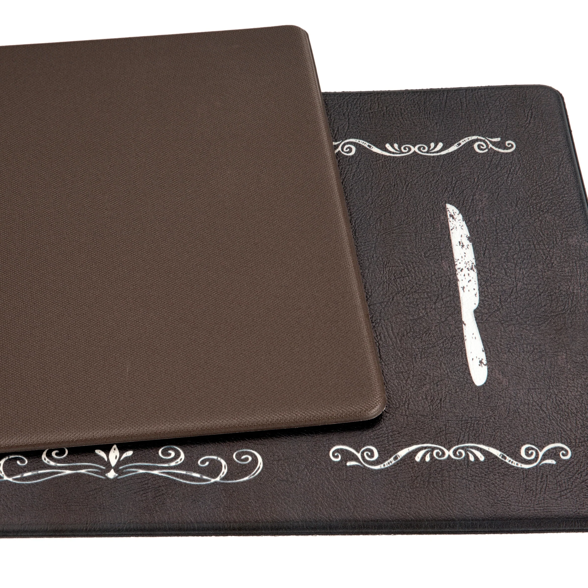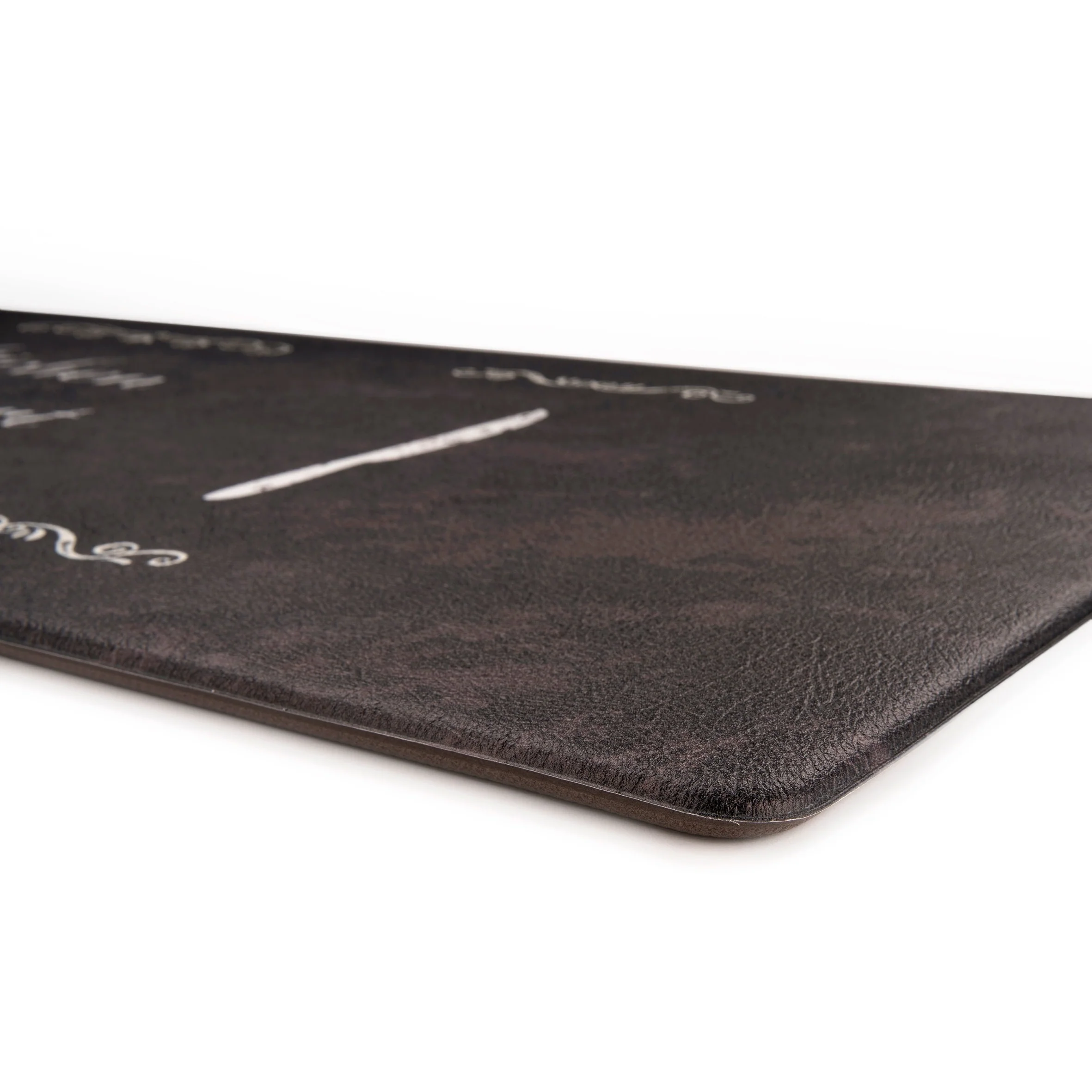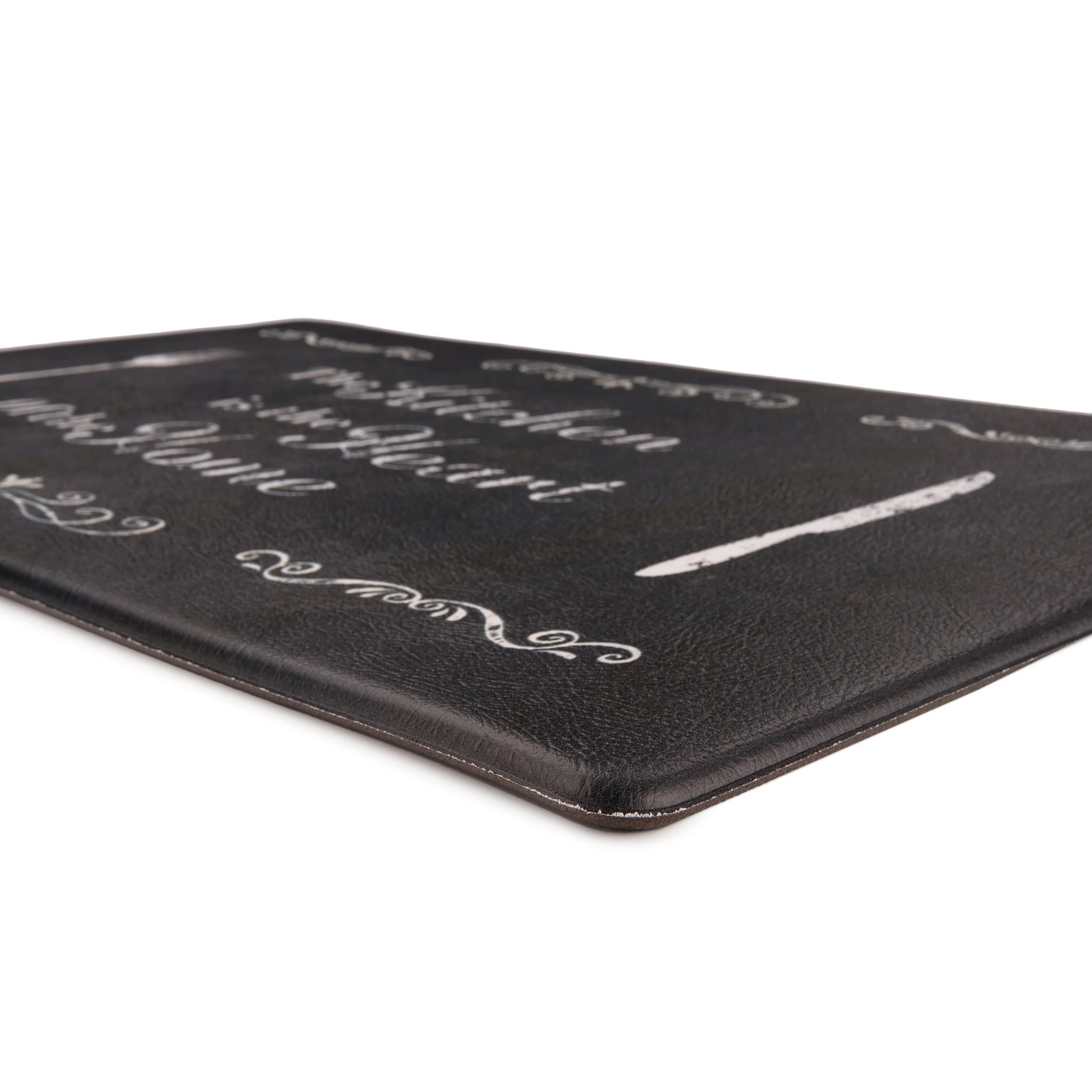 Celebrate the warmth of your kitchen with this inviting anti-fatigue mat. Made of the highest grade PVC material, this mat provides cushioned support and includes non-skid backing to keep it firmly in place. Featuring a stylish black and white design with 'The Kitchen is the Heart of the Home' print and a fork and knife, this mat is water-repellant, stain- and oil-resistant, and pet-friendly. Available in multiple sizes to fit your space perfectly.