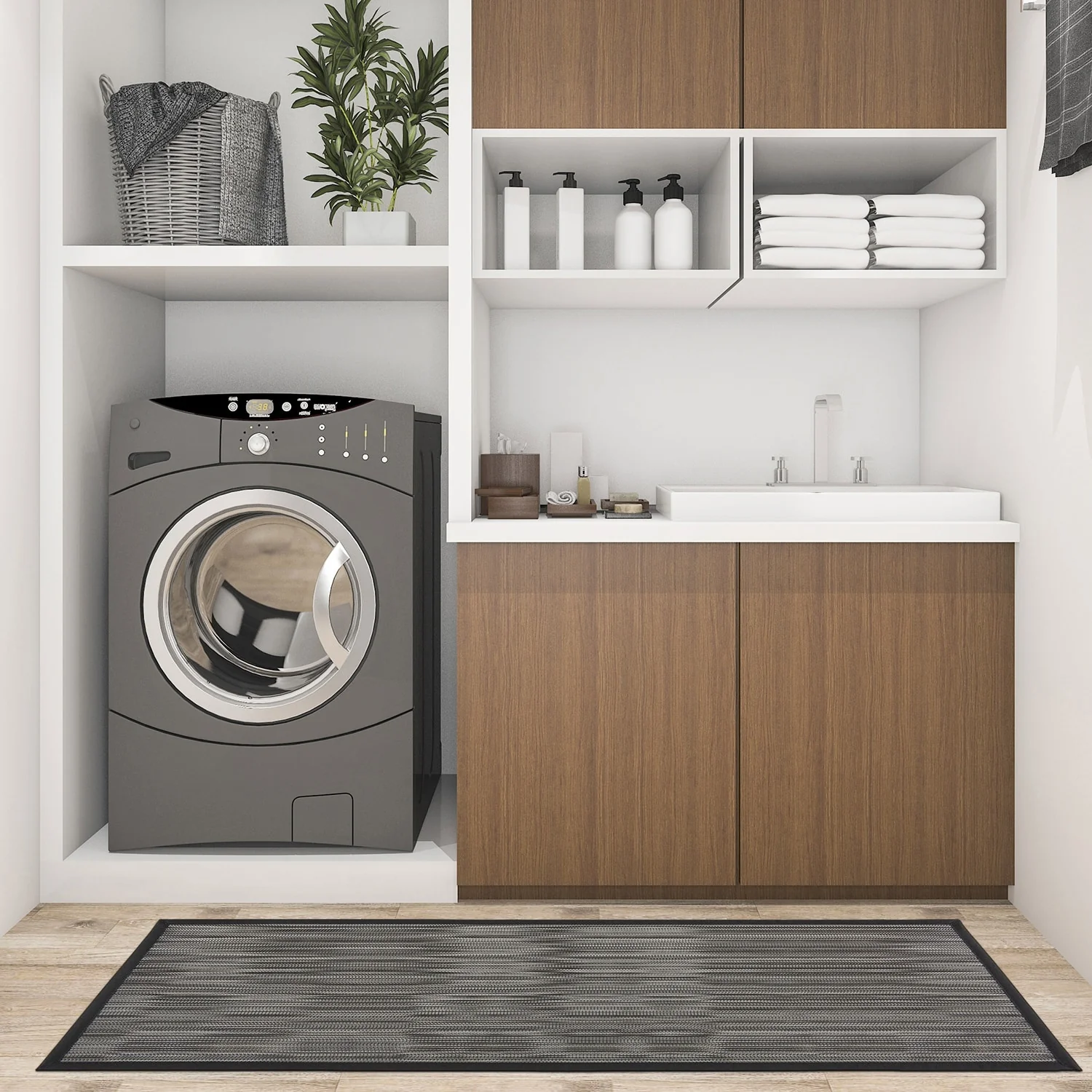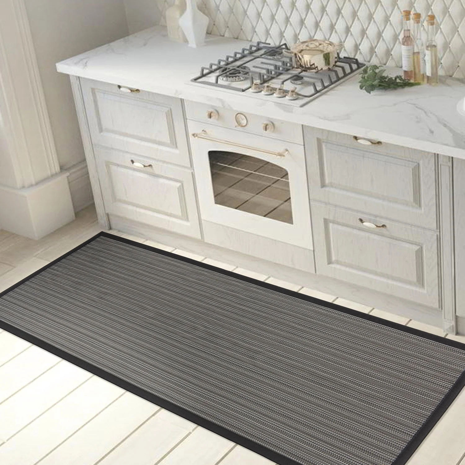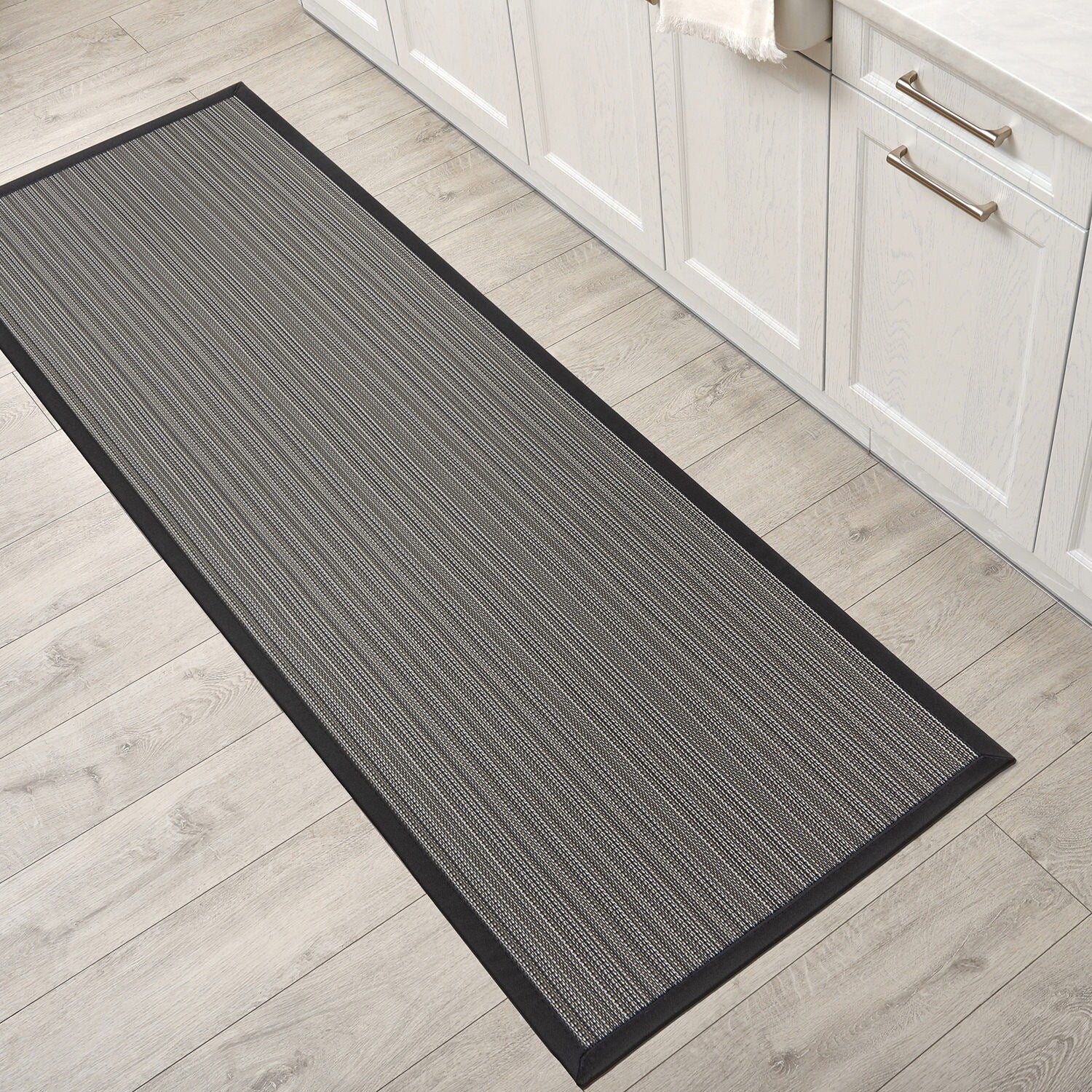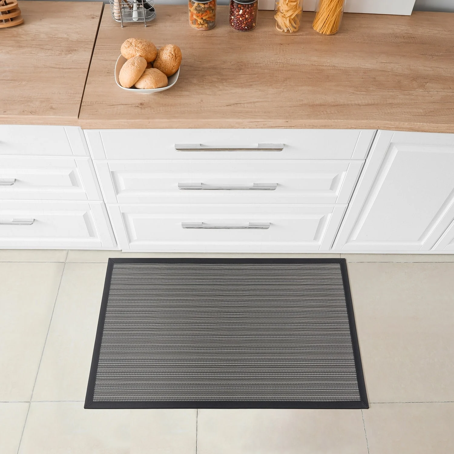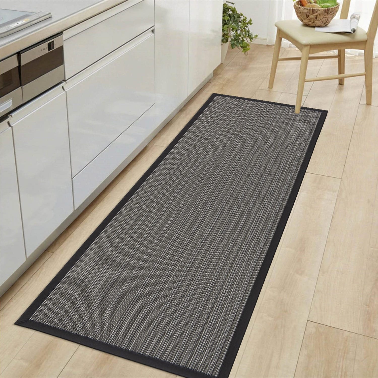 This World Rug Gallery Stripe Textline Anti-Fatigue Standing Mat brings comfort and style to any high foot traffic area of your home. The durable rubber backing keeps it securely in place, and its neutral design seamlessly fits into any decor. Perfect for use in the kitchen, bathroom, laundry room, or entryway, this mat provides ample support for your feet and knees over long periods of standing. Additionally, it is water repellent, stain/oil resistant, slip-resistant, and easy to clean.