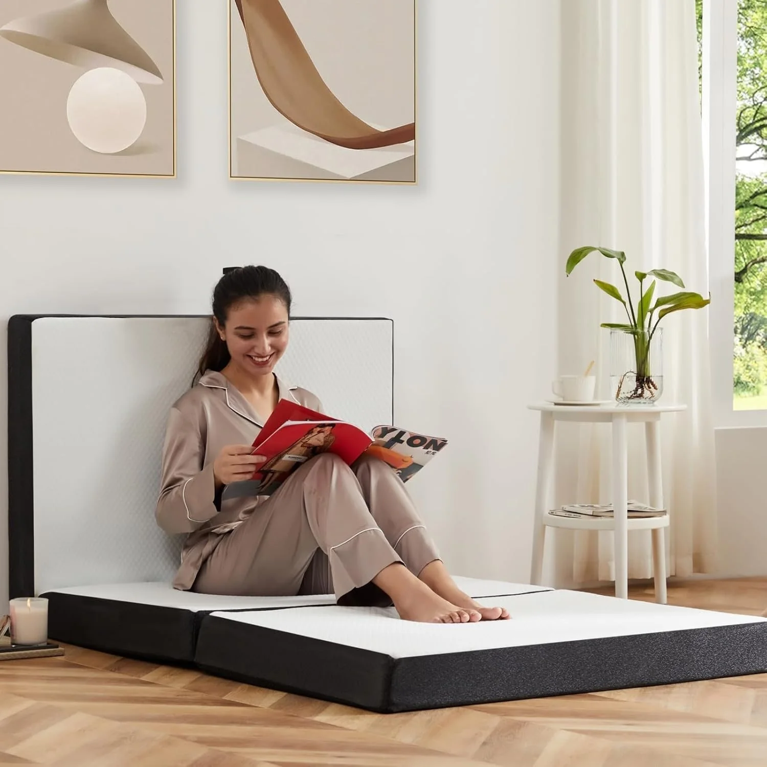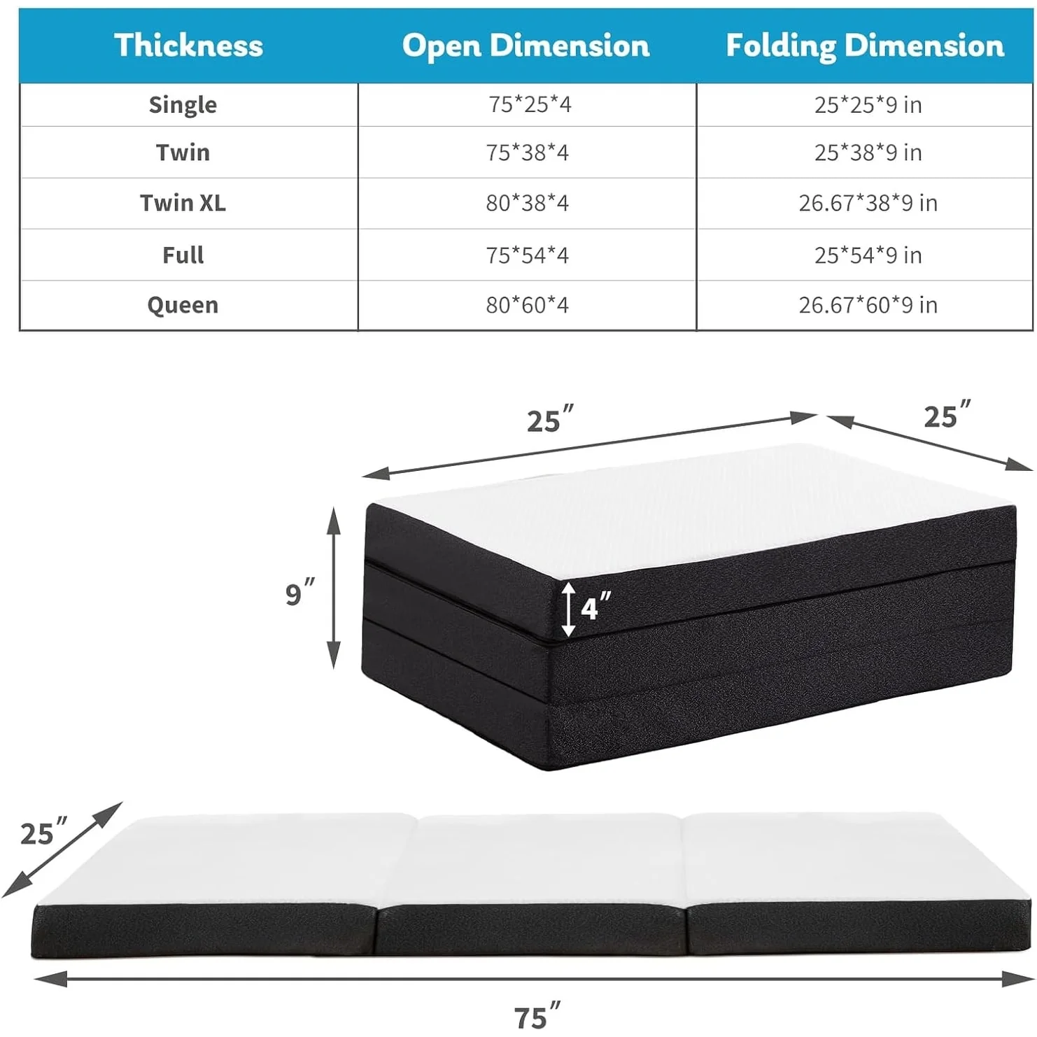 Product details:What makes our tri-fold mattress so different? Designed with all-foam system, the 4-inch folding mattress will give you quiet and deep sleep experience..Our mattress helps to relieve pain and reduce pressure points which make you feel refreshed and energized. More, you can unfolding the mattress, fold 1 or 2 sections and lean the rest against the wall to be used as a portable bed, lounger, sofa and extra seat. In addition, It's easy to transport or store in a closet or other storage area. Its portability and storage capabilities make it convenient for camping and road trip.