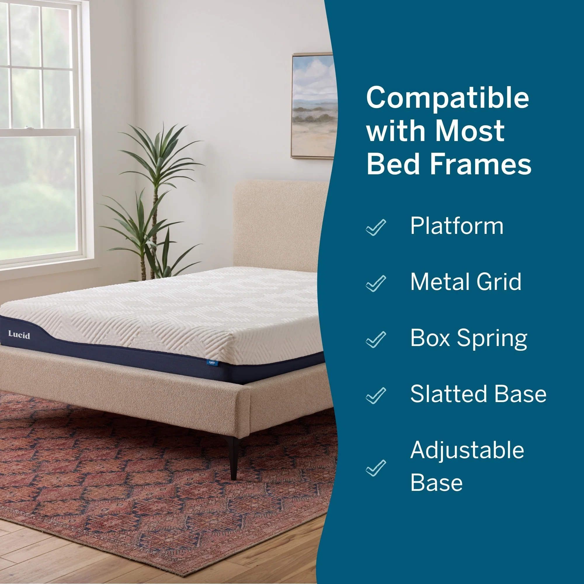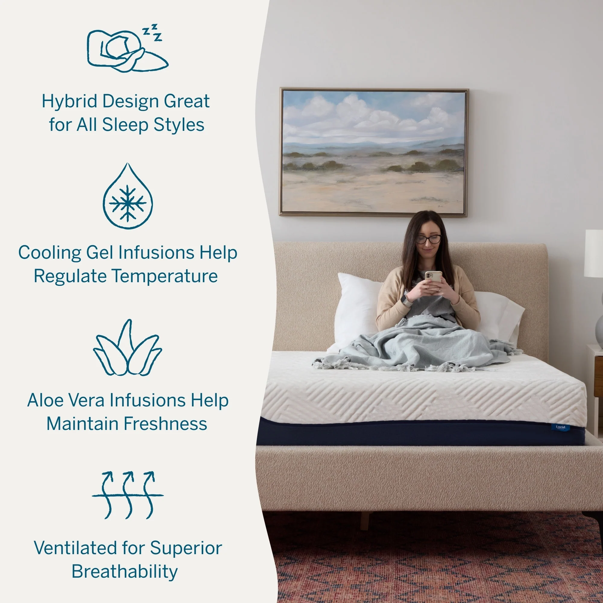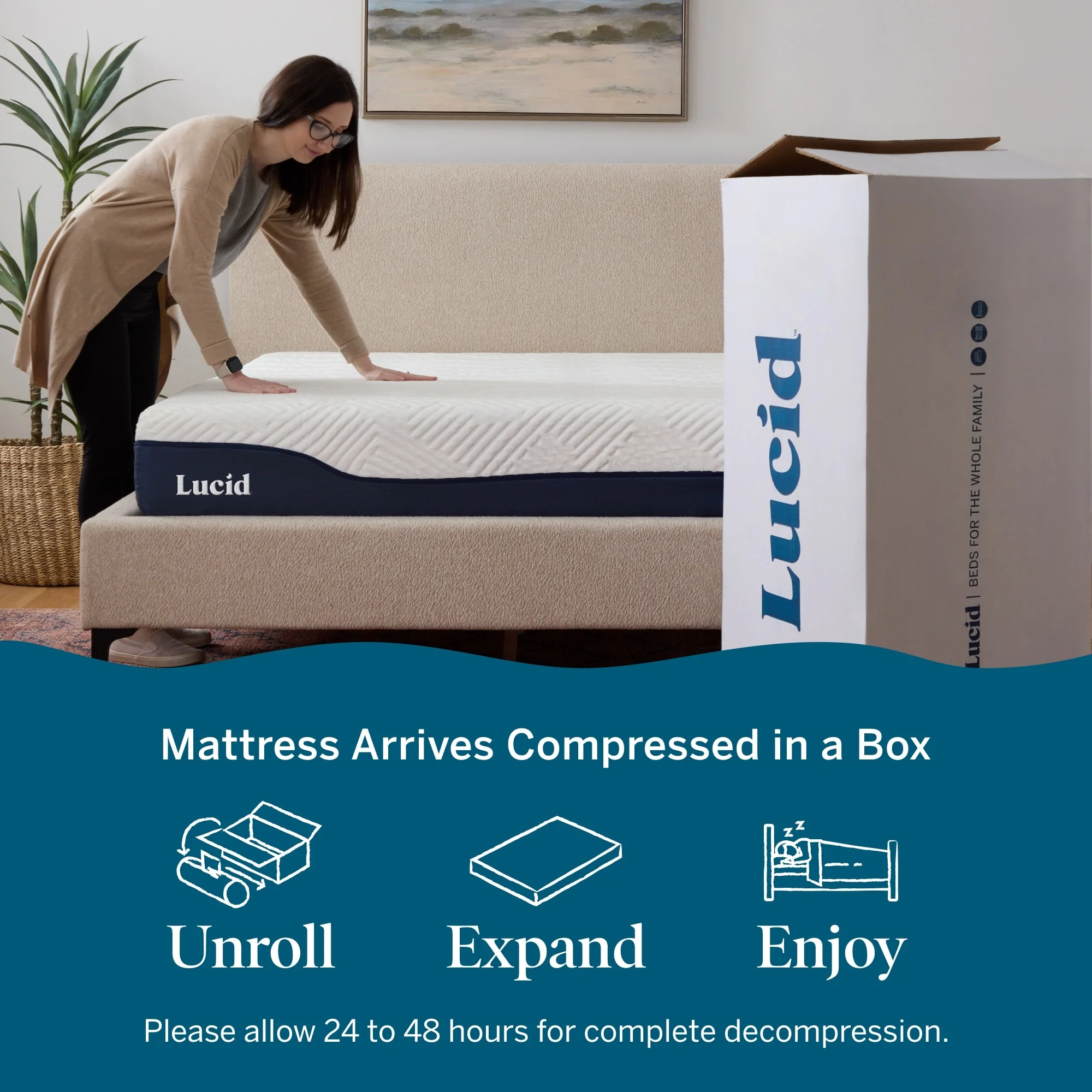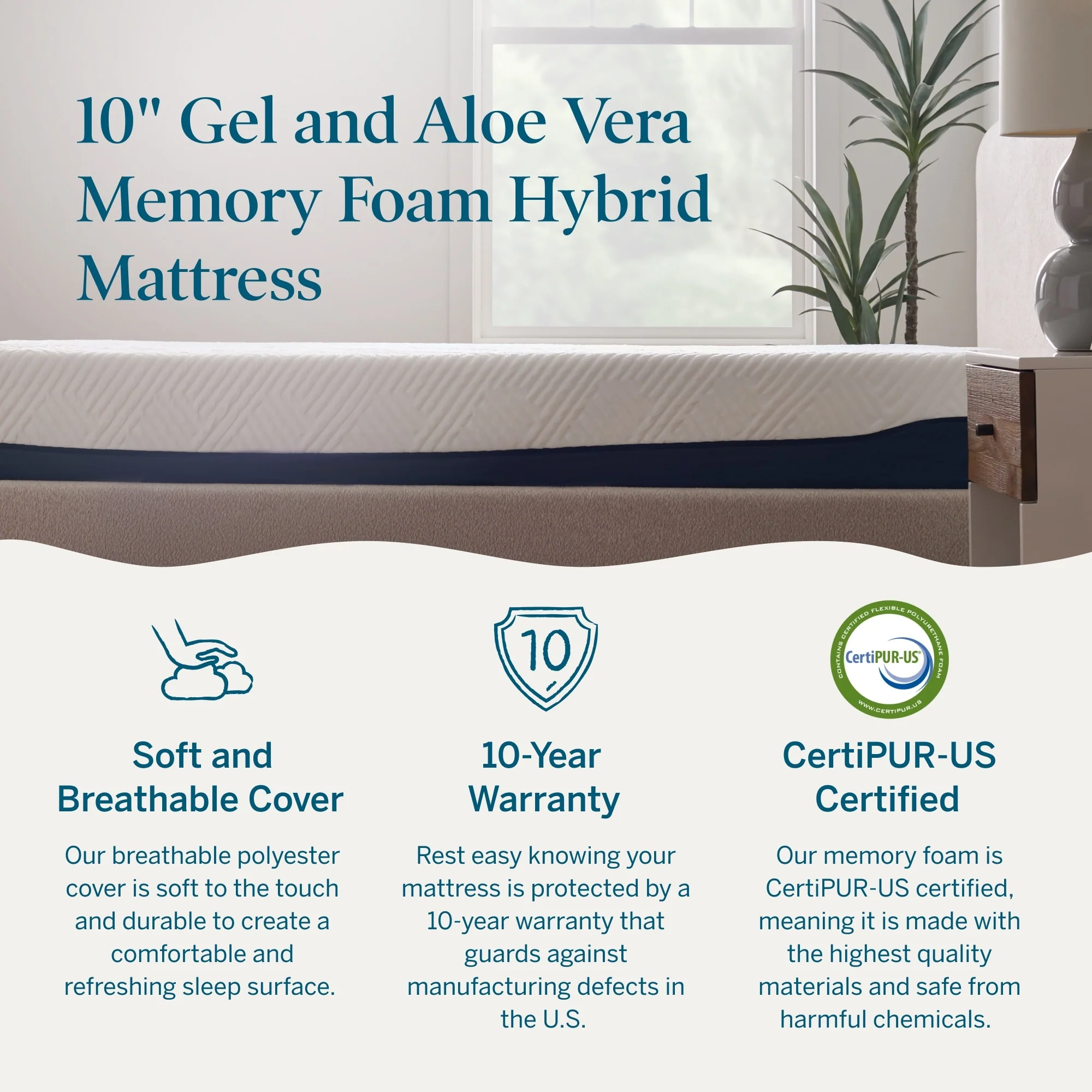 Unwind in luxurious comfort with the LUCID 10-in. Gel and Aloe Vera Hybrid Mattress. This premium hybrid mattress features five layers of carefully selected materials designed for a supportive and refreshing sleep experience. The top layer of gel-infused memory foam contours to your body's curves, while the aloe vera infusion promotes a fresh sleep environment. The individually-encased coils and high-density foam foundation provide the perfect amount of support for your back, hips, and shoulders. This hybrid memory foam mattress is shipped right to your door; simply place it on your bed, give it 24 to 48 hours to fully expand, and then relax in the luxurious comfort of this premium bed-in-a-box.