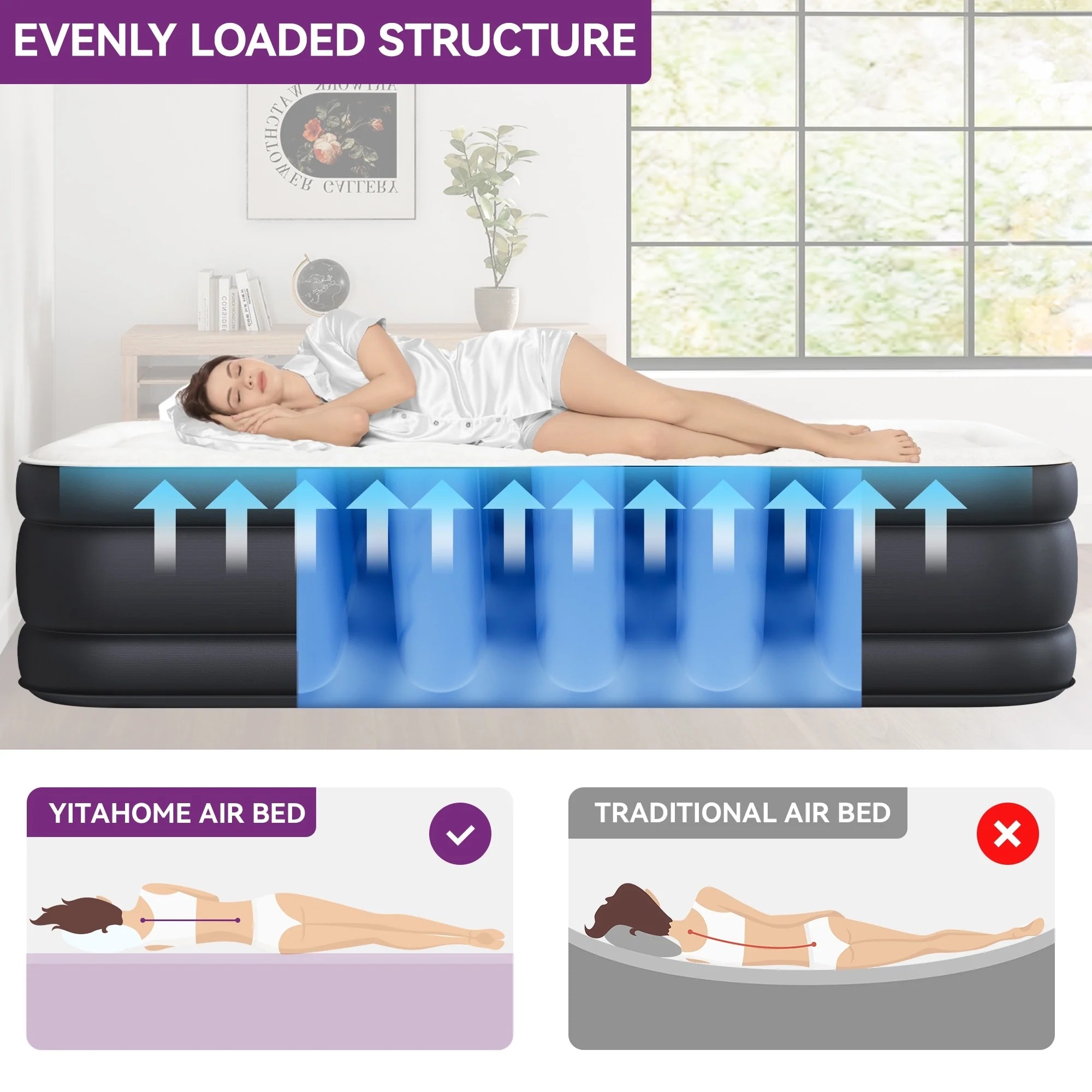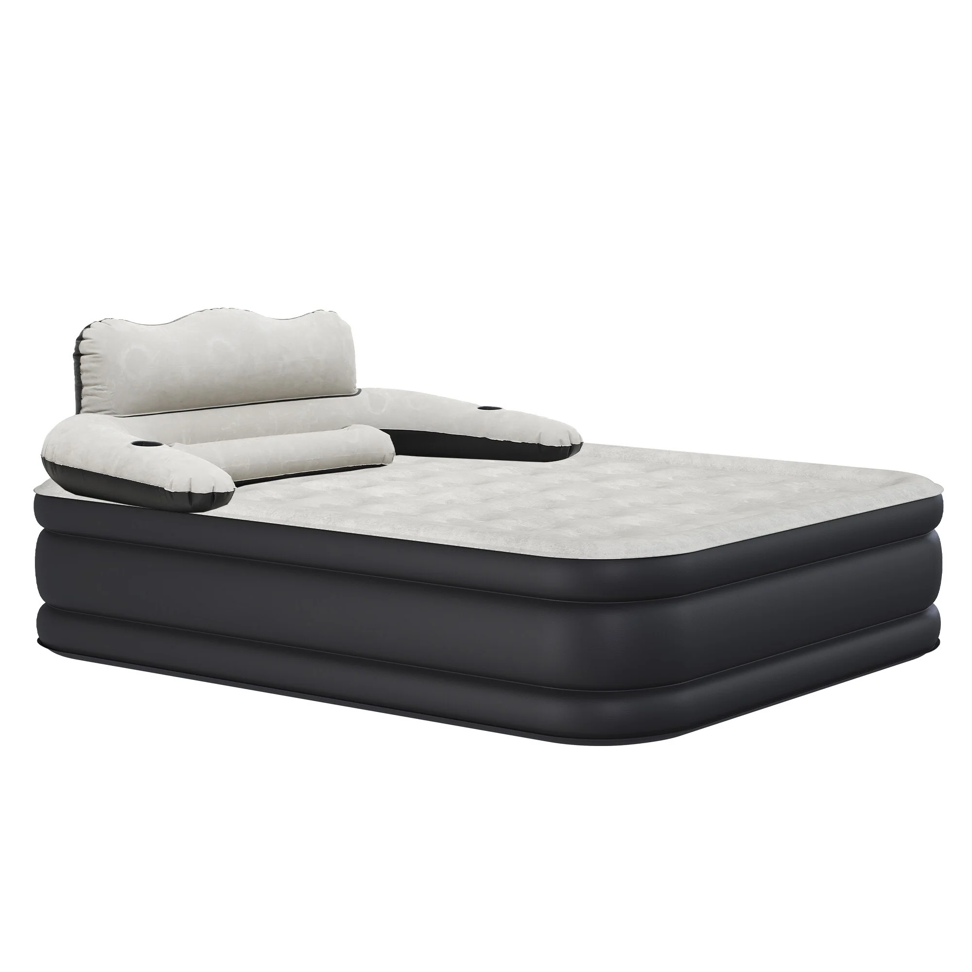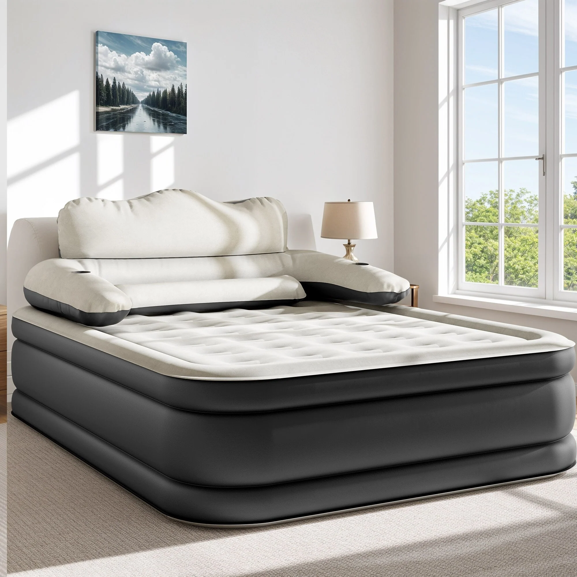 The headboard of this inflatable bed can be easily attached via buckles.The mattress features a coil-beam structure for excellent spinal and body support, adding an extra layer of comfort.The dual cup holder design accommodates small items like cups to enhance your leisure