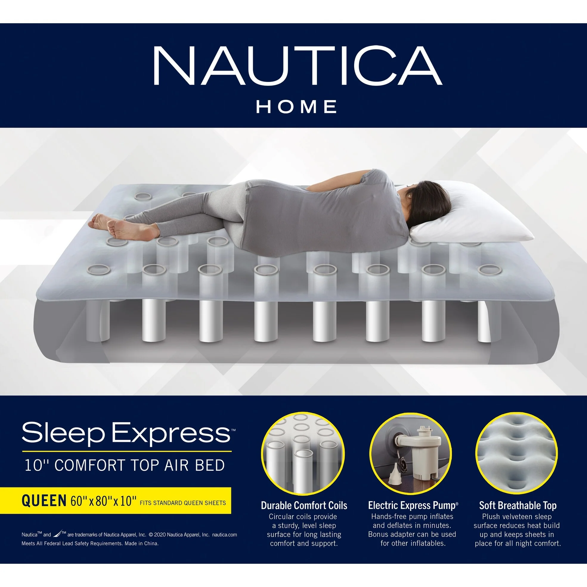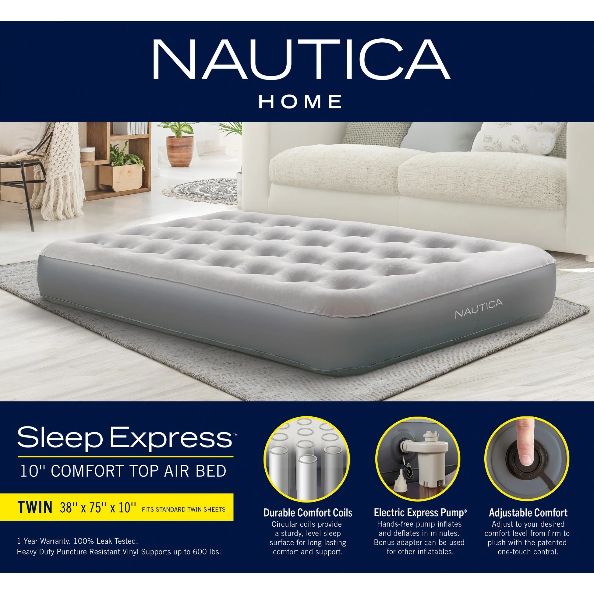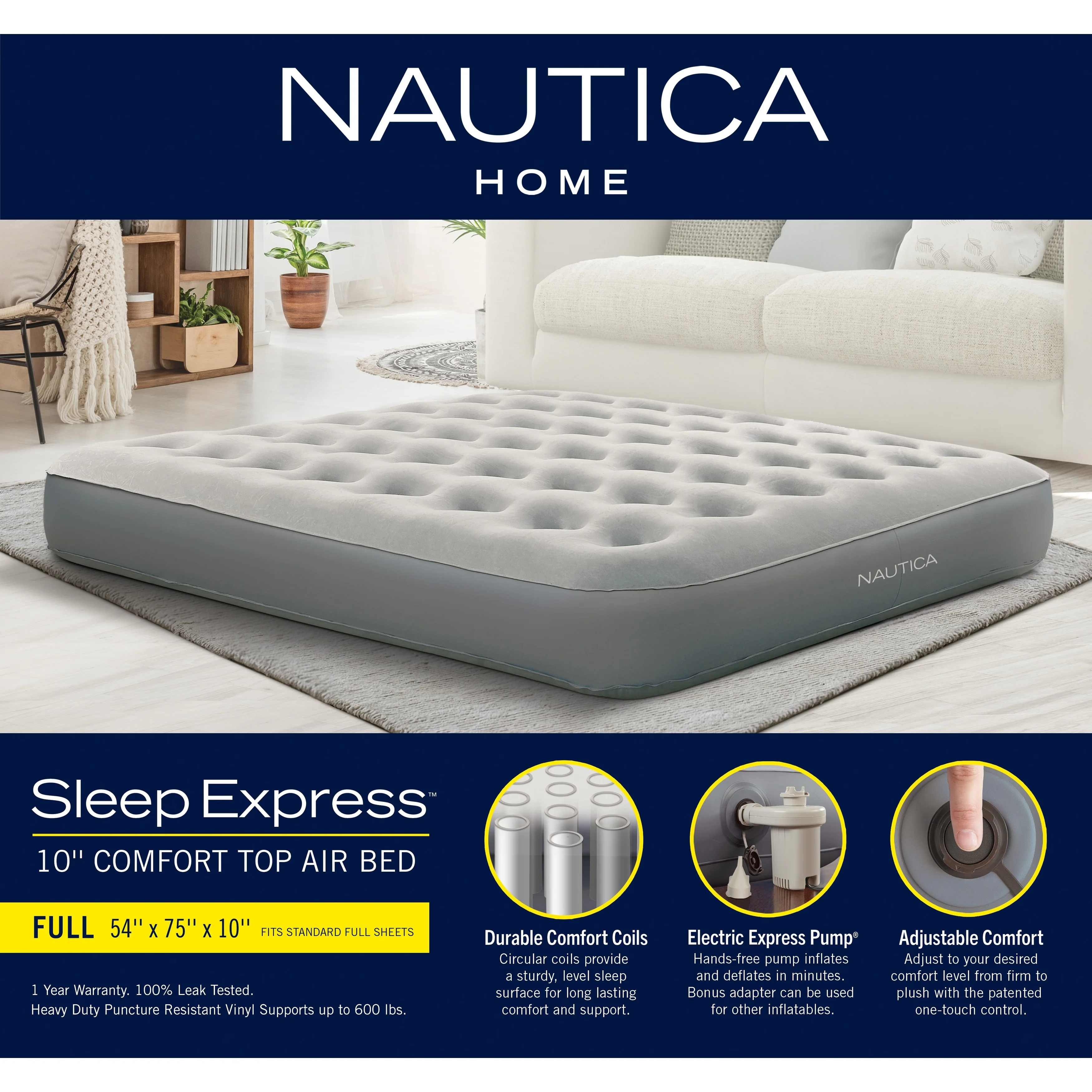 Experience ultimate comfort with the Nautica Home 10-inch Sleep Express Air Bed Mattress. Featuring a luxurious linear coil comfort top design with up to 48 coils, this air bed mattress cradles and cushions your body for a truly restful sleep. The waterproof flocked top provides extra durability and puncture resistance while keeping your sheets securely in place.