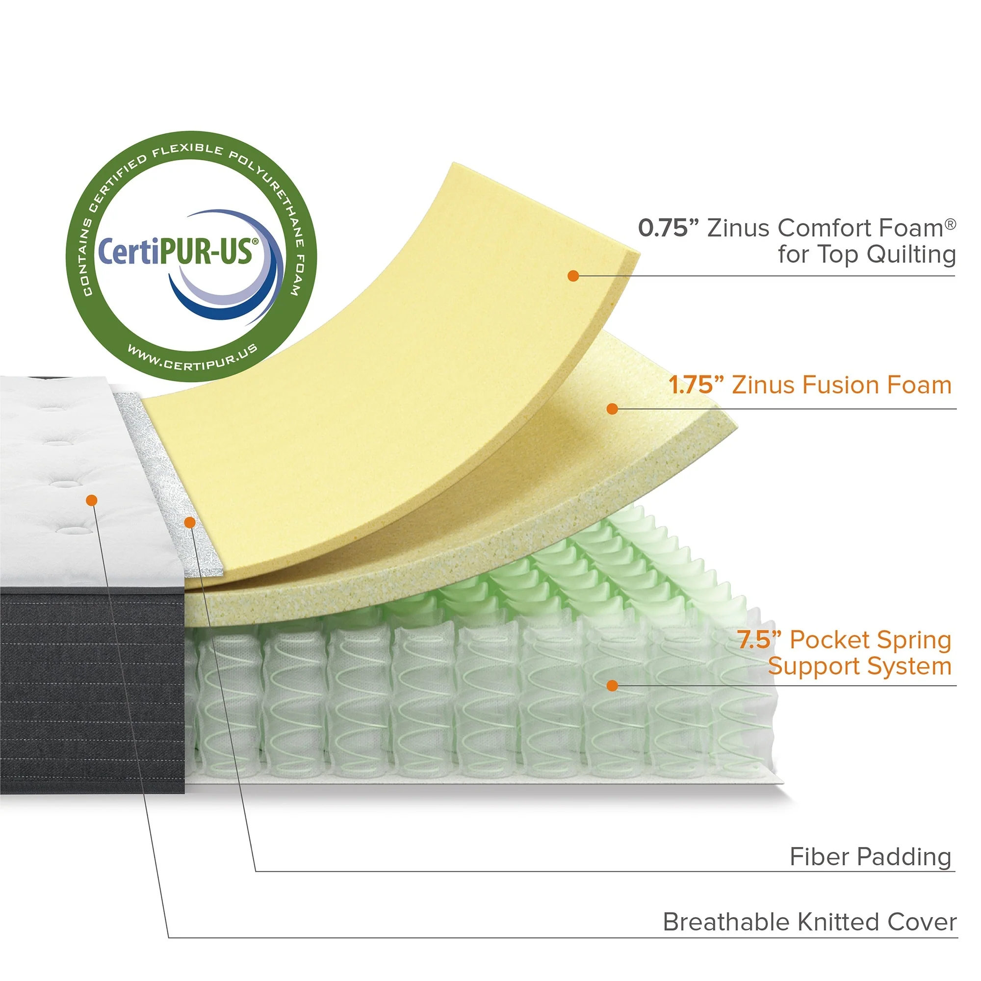 - PRESSURE RELIEVING SUPPORT - With fiber quilting, Zinus Comfort Foam®, Zinus Fusion Foam, and pocket springs that provide dynamic pressure-relief for your joints and spine, curling up on this mattress will have you feeling supported and pain-free all night long