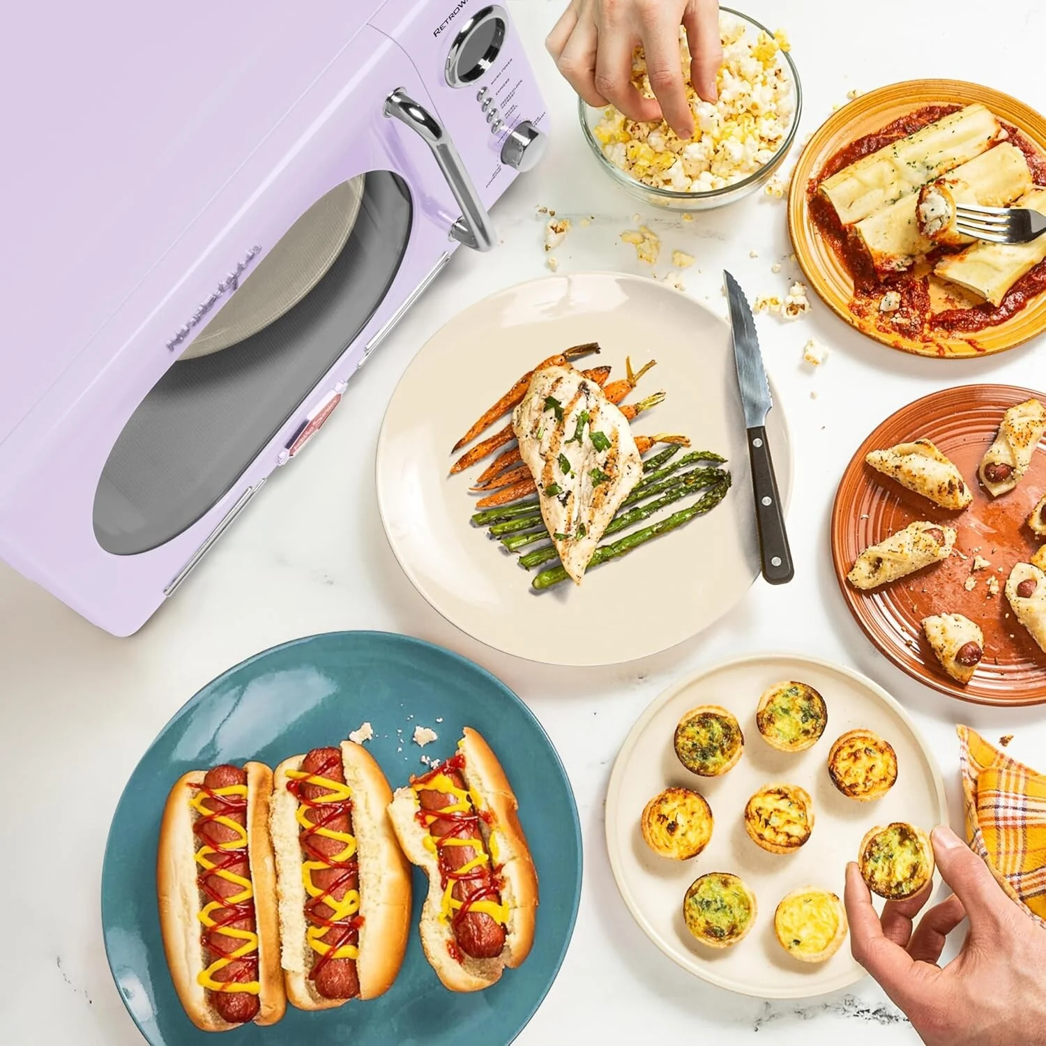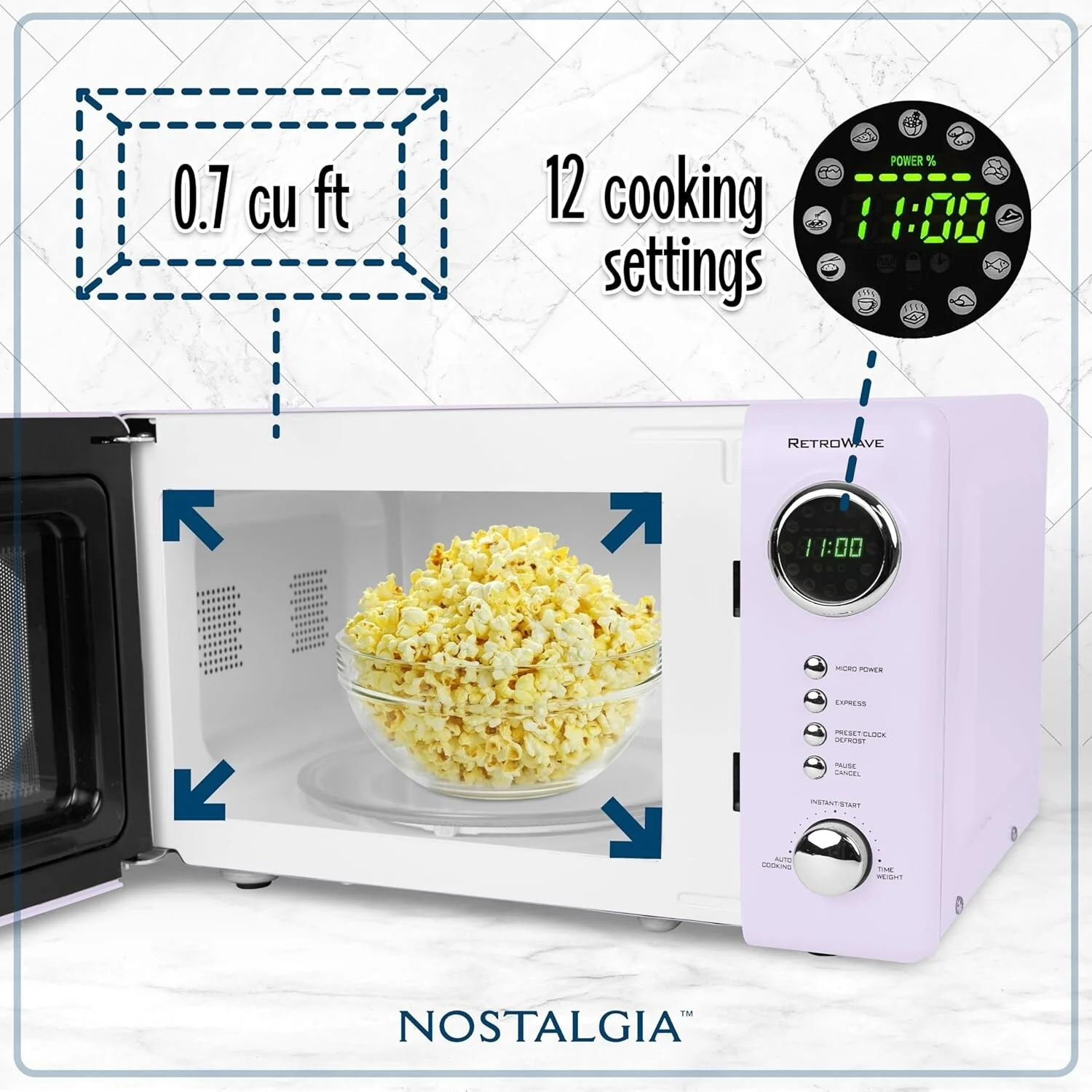 700-WATTS COOKING POWER : At 0.7 cubic foot, this microwave provides the cooking power needed to quickly cook and reheat foods CONVENIENT COOKING CONTROLS: 12 pre-programmed cooking settings, delay timer and express cooking provide options for the optimal heating of popular foods like popcorn, pizza, potatoes, veggies and more DIGITAL CLOCK : Easy-to-read LED display lights up the digital clock and highlights each cooking setting EVEN COOKING : Rotating glass carousel helps cook food evenly RETRO ACCENTS: A sleek chrome door handle, control panel and accents add fun and flair to this unique retro-styled appliance